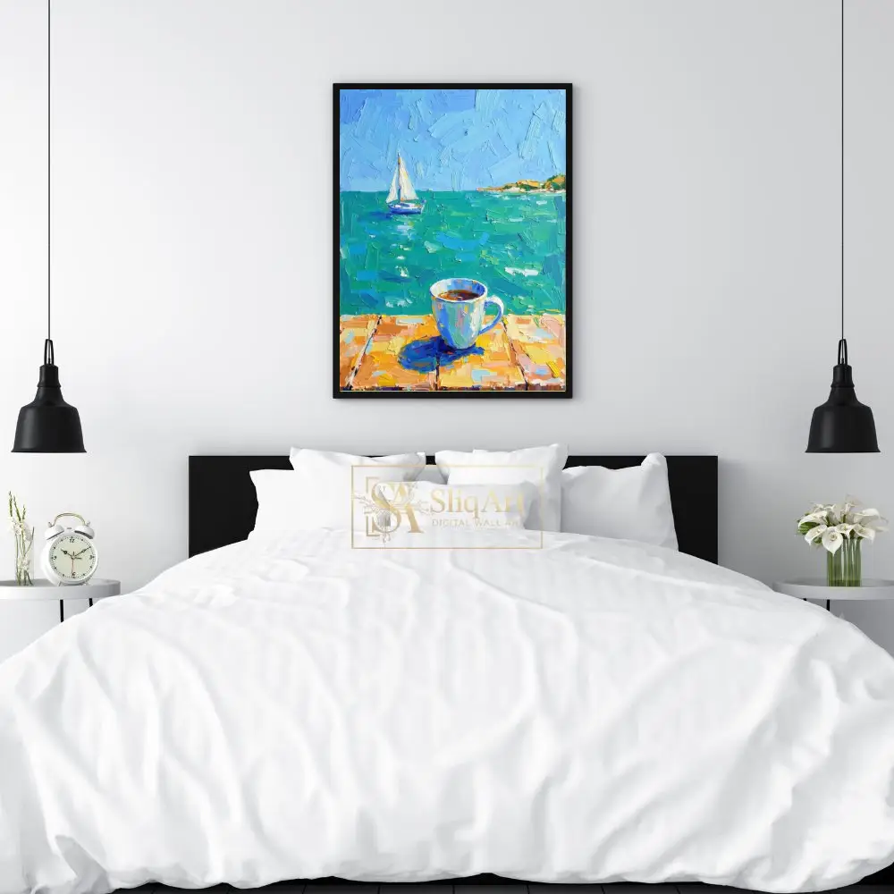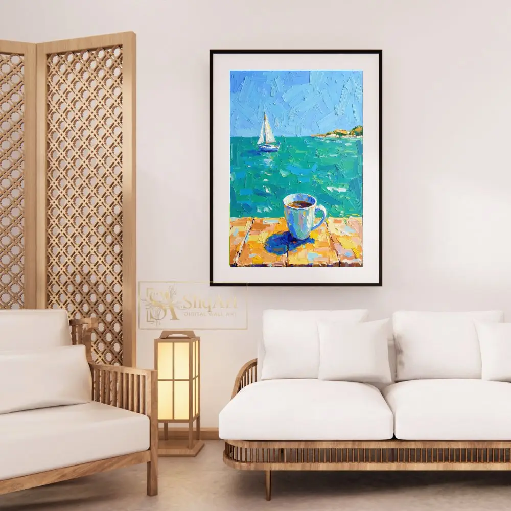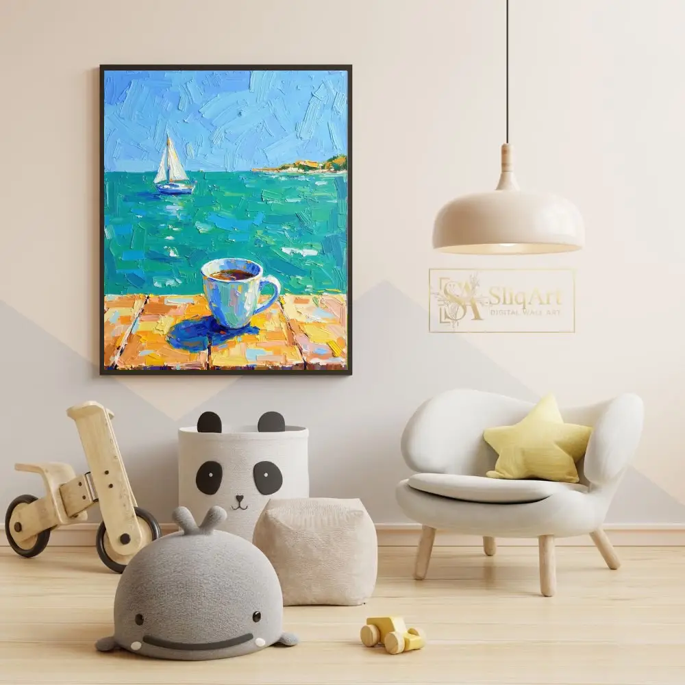 This stunning impressionist piece captures the serene essence of a summer morning. Thick, textured palette knife strokes bring to life a steaming cup of coffee resting on a sun-drenched wooden table.