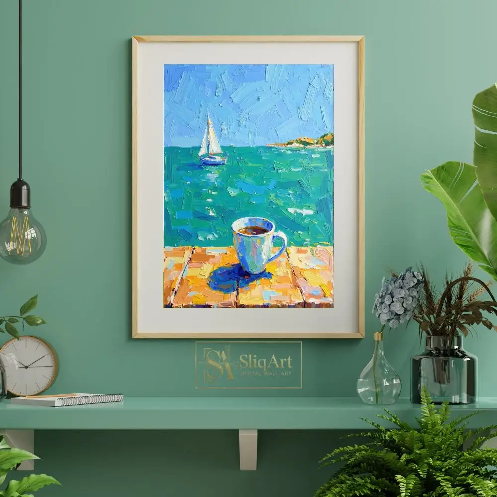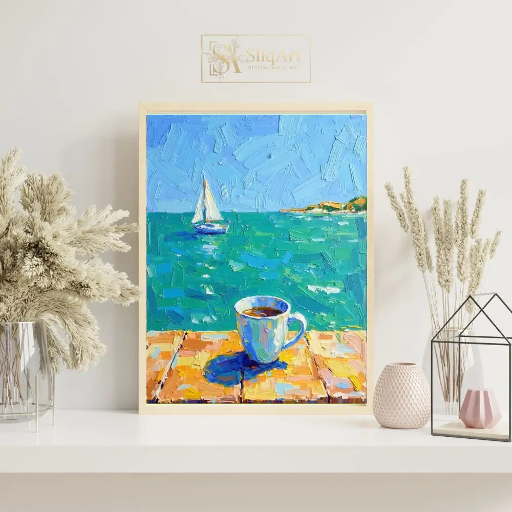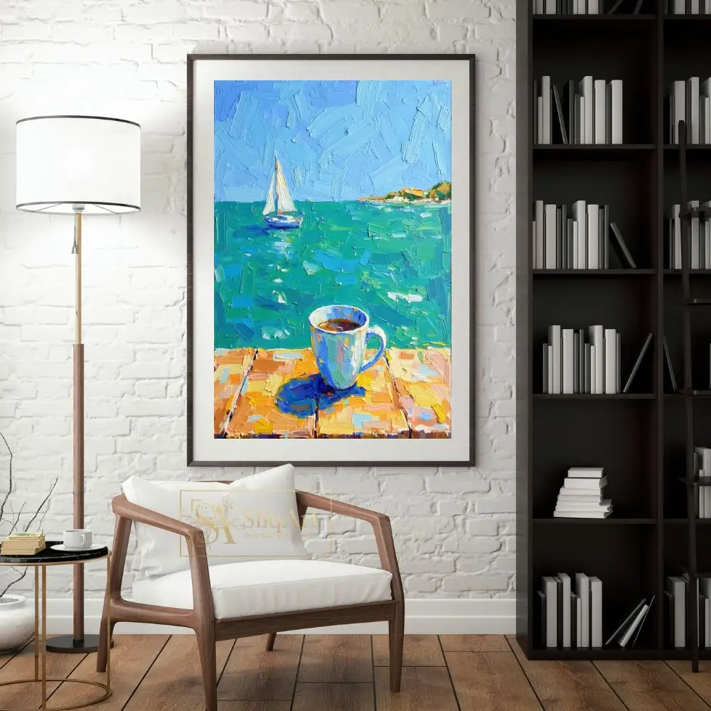 In the background, a tranquil turquoise sea hosts a solitary white sailboat gliding under a bright blue sky. The impasto technique adds a tactile depth and energetic movement to the scene, making it a captivating centerpiece for any modern home. The vibrant palette of blues, greens, and warm yellows evokes a sense of peace and wanderlust.