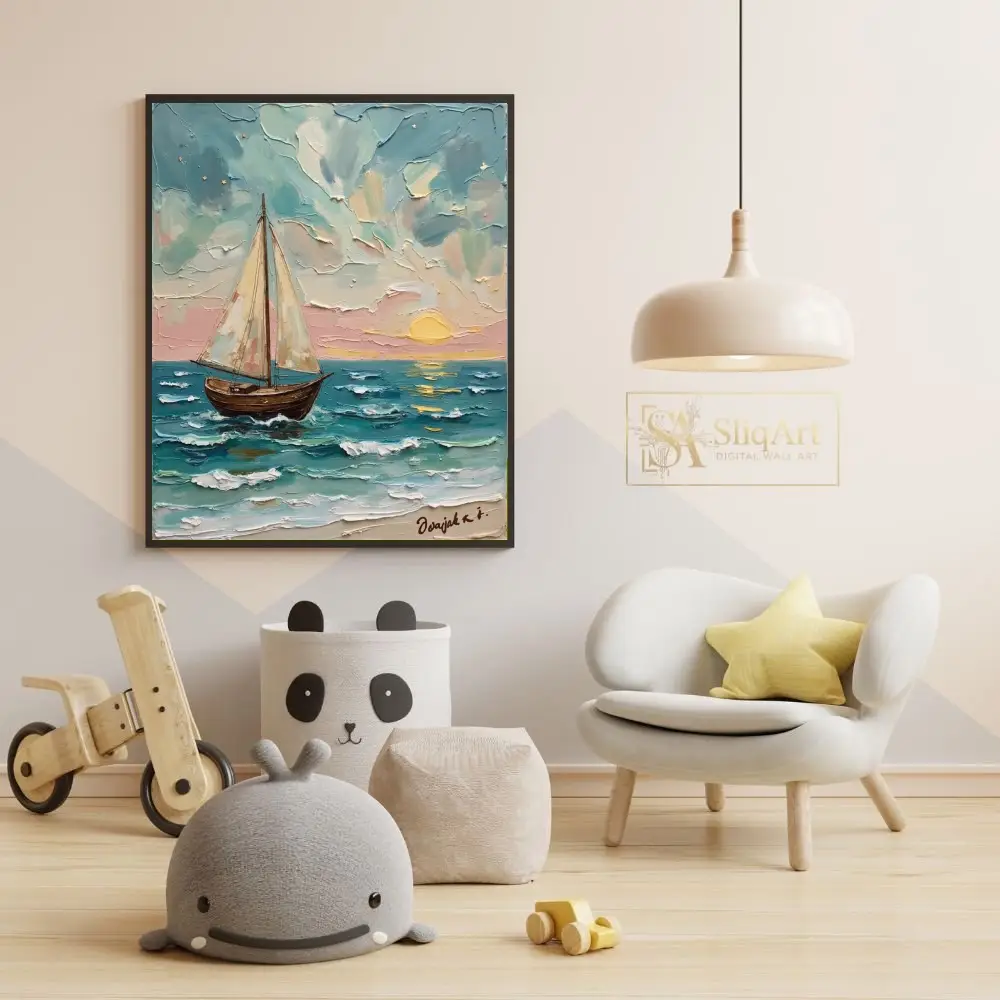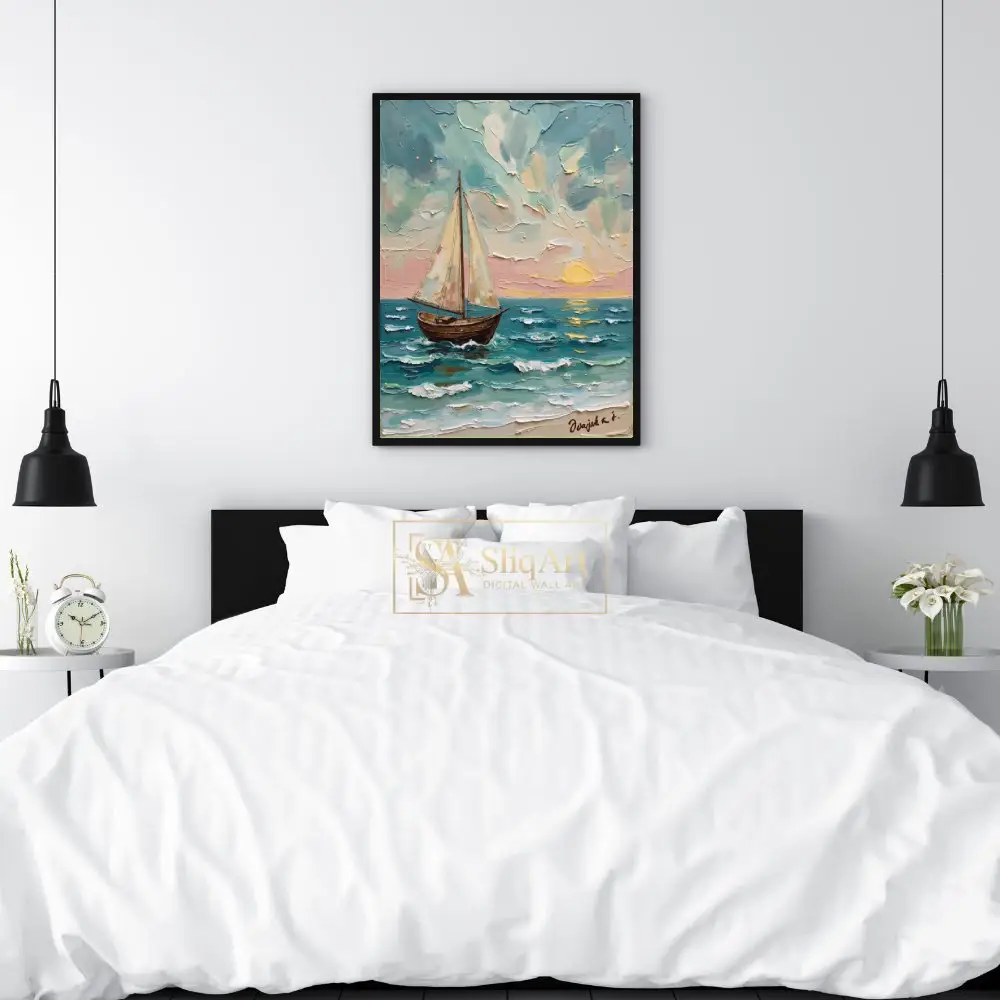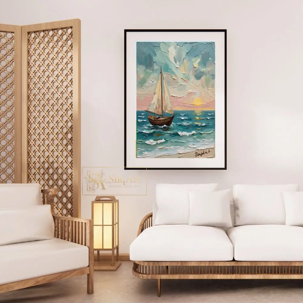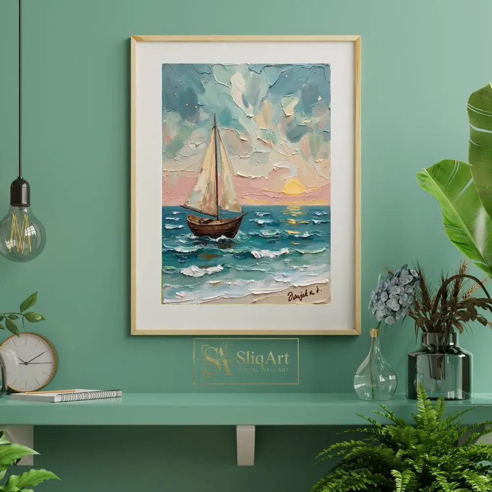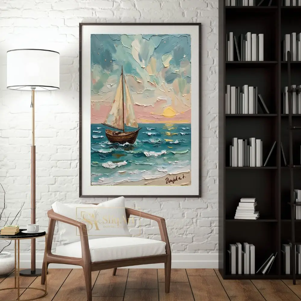 This stunning impasto oil painting captures the serene beauty of a lone sailboat gliding across the ocean at sunset. The thick, textured brushstrokes bring the churning waves and billowing clouds to life, creating a tangible sense of movement and depth.