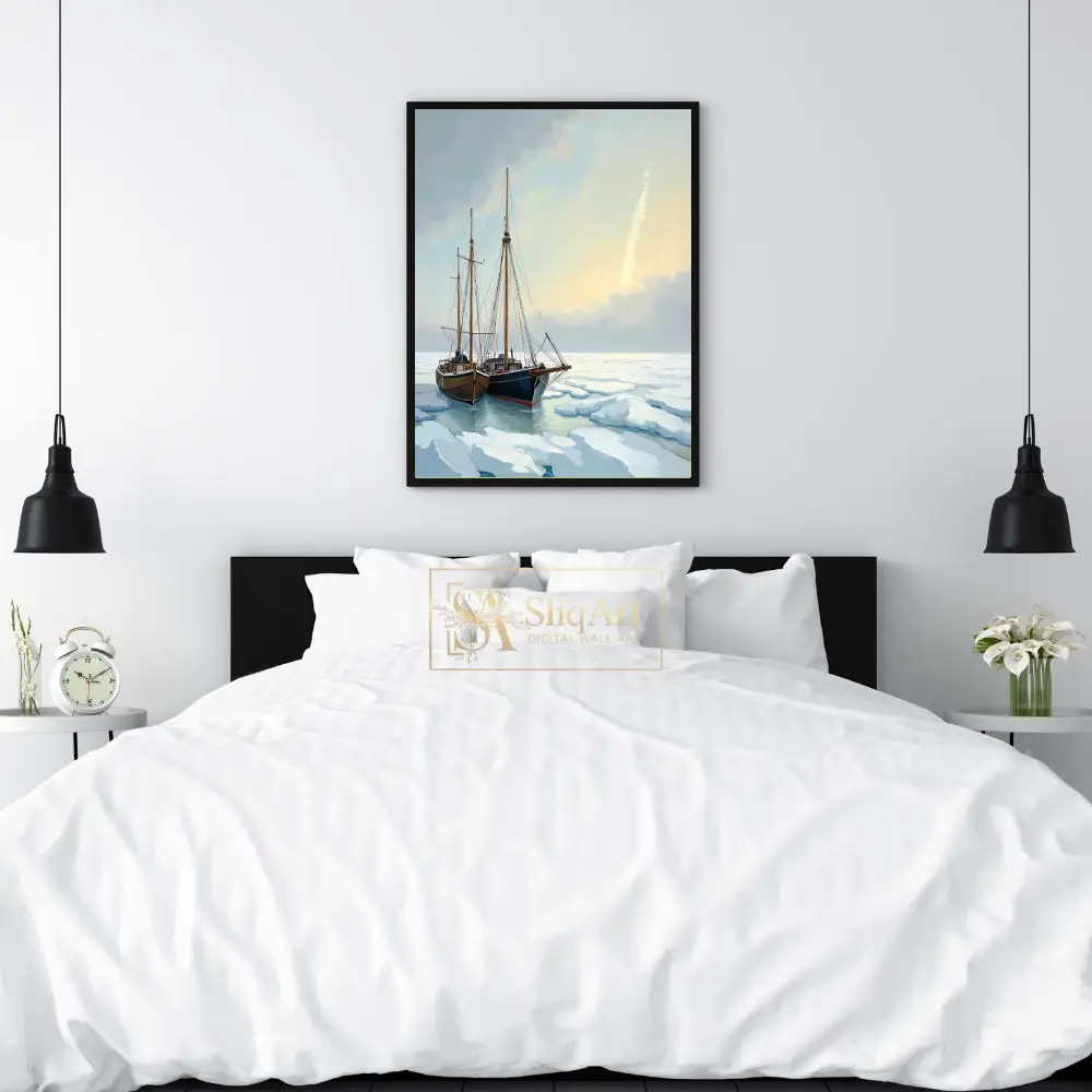 Embrace the quiet majesty of the frozen north with this evocative depiction of two classic sailing vessels navigating through a field of arctic ice floes. This artwork captures a moment of serene resilience, where the strength of wooden hulls meets the delicate, shifting beauty of the ice.
