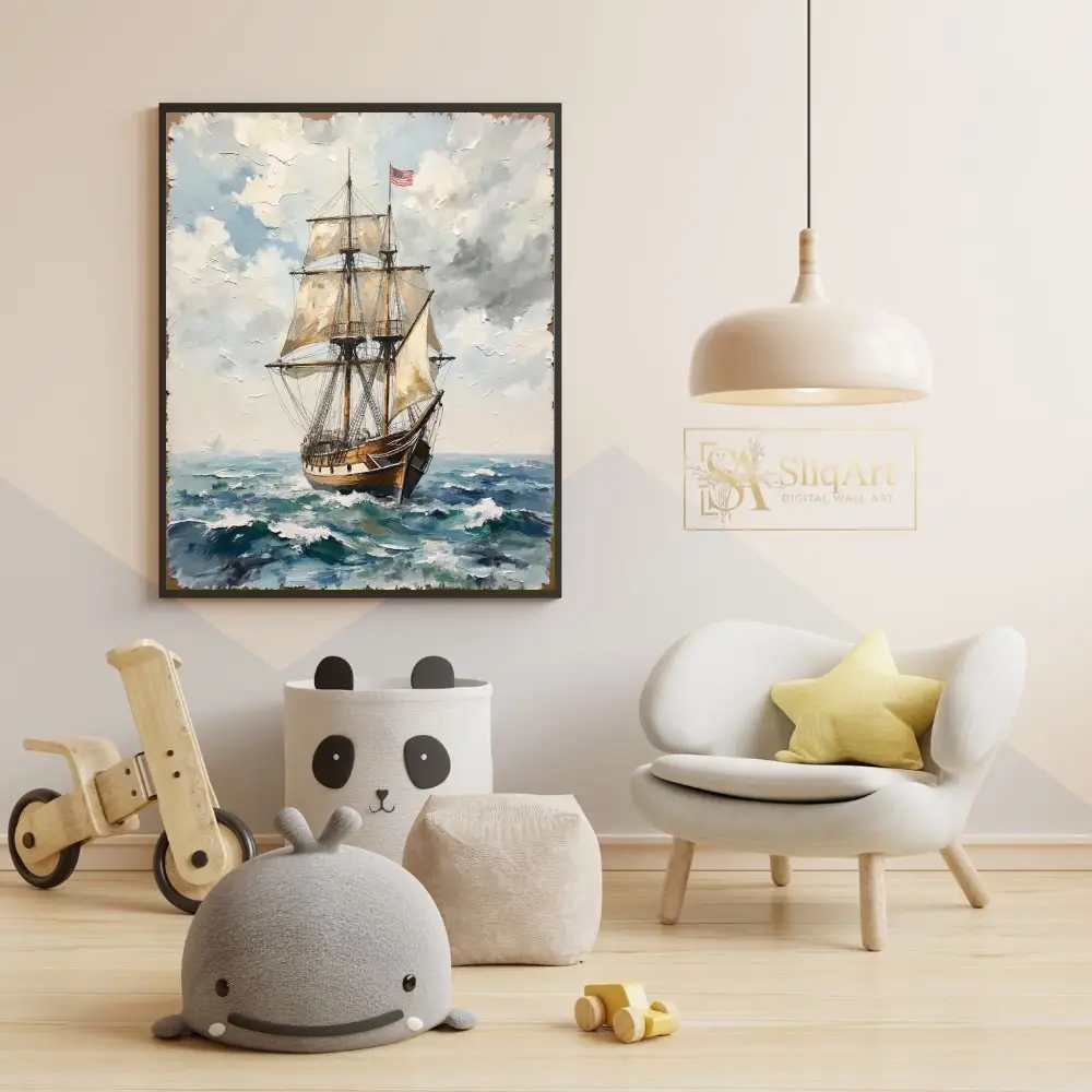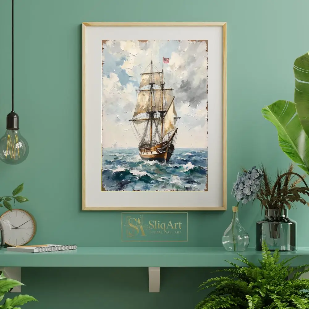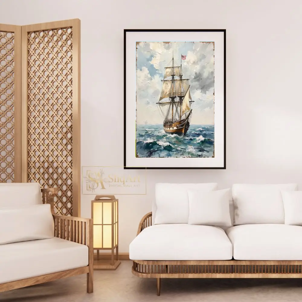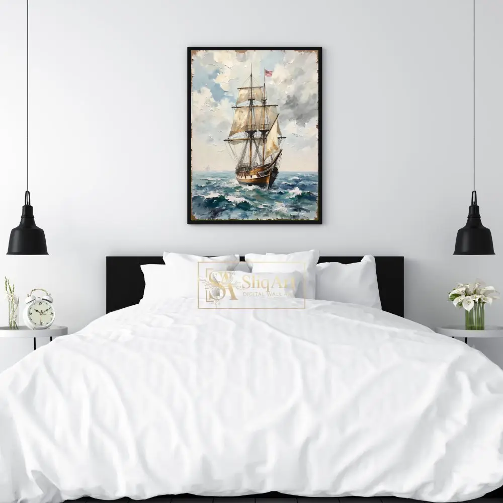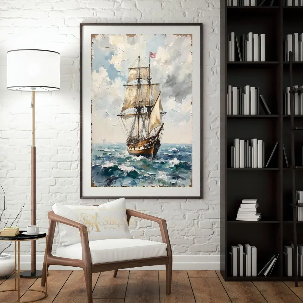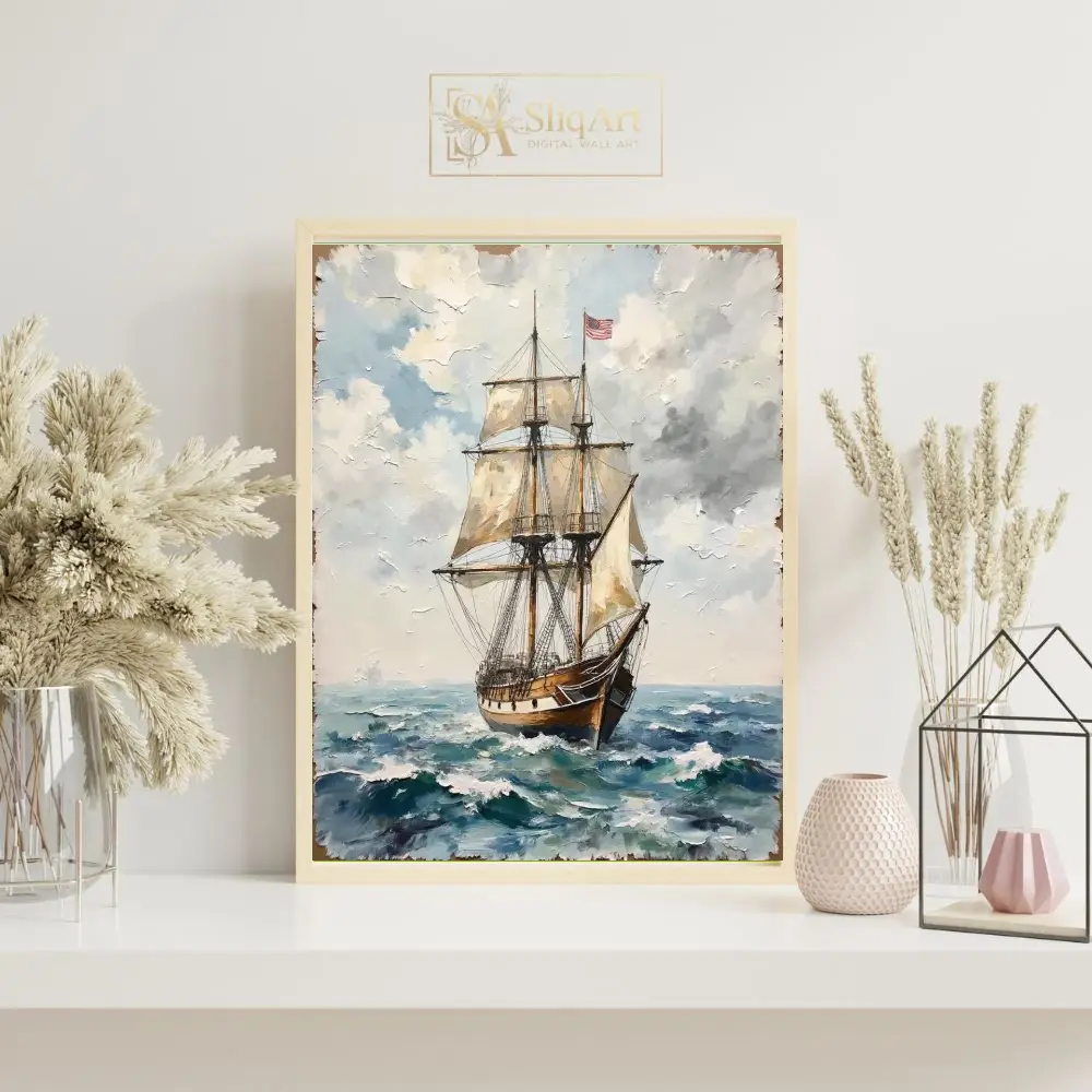 Flying the stars and stripes, this vessel represents a legacy of adventure and maritime exploration. The rich textures and classic nautical theme make it a timeless addition to any sophisticated interior, bringing a sense of history and the vastness of the ocean into your home.