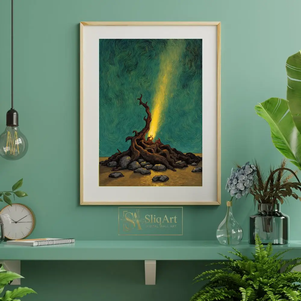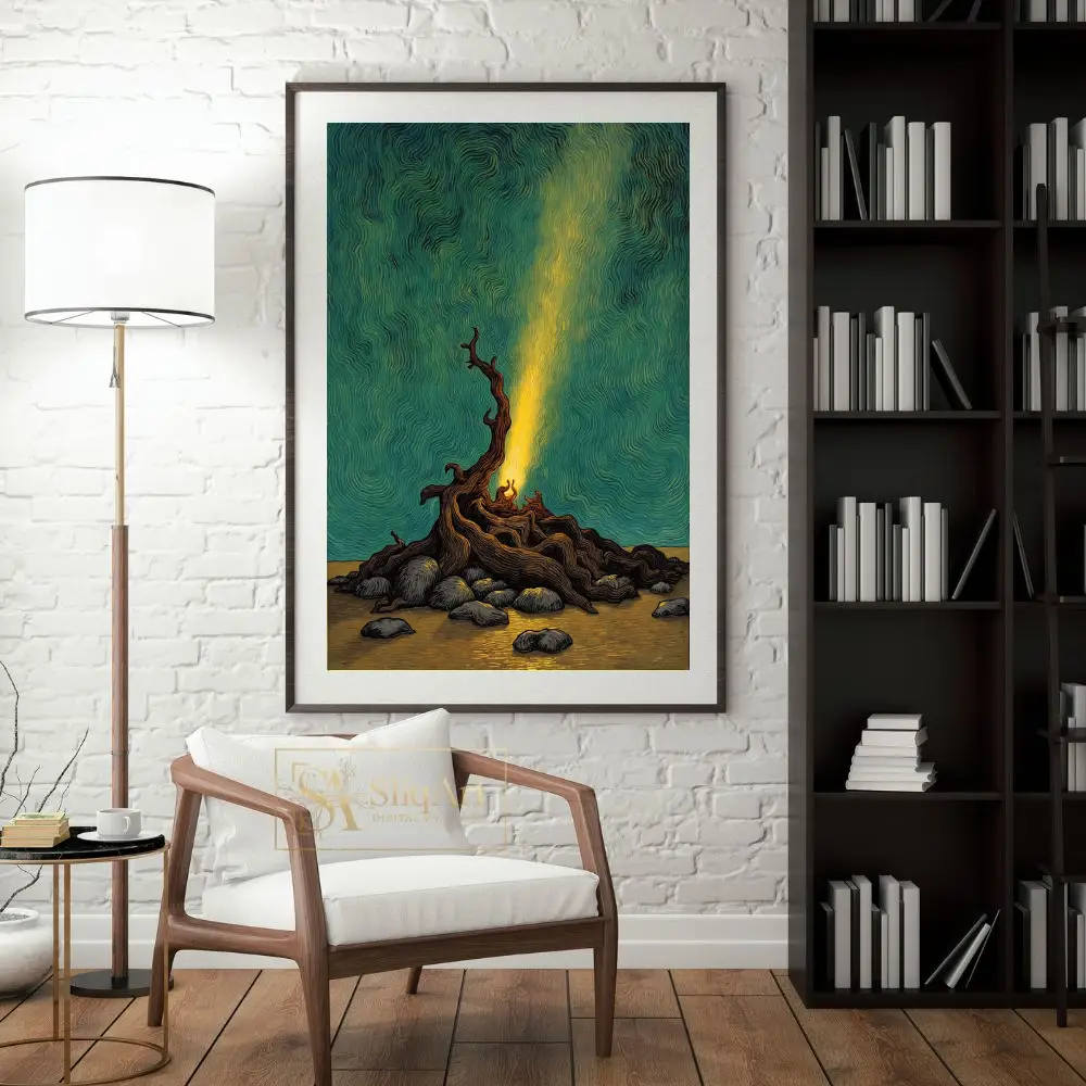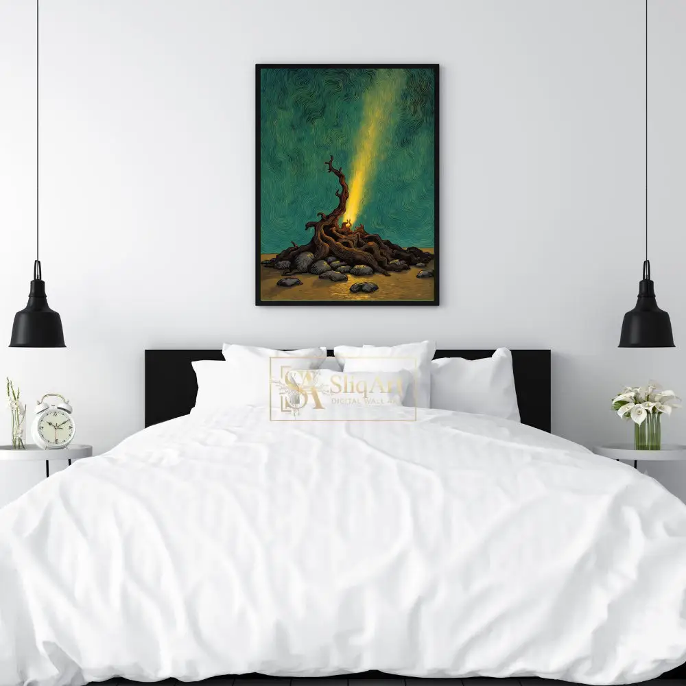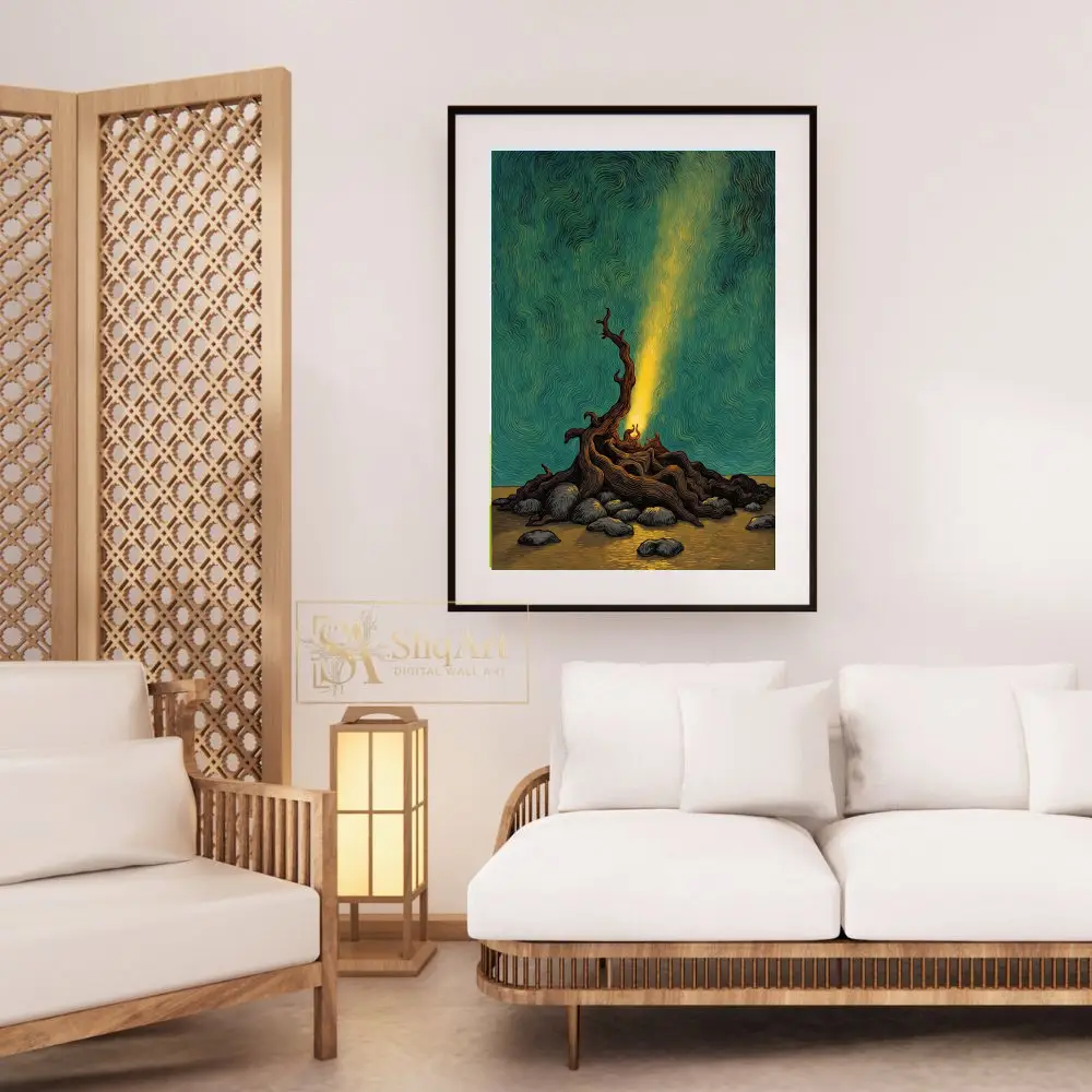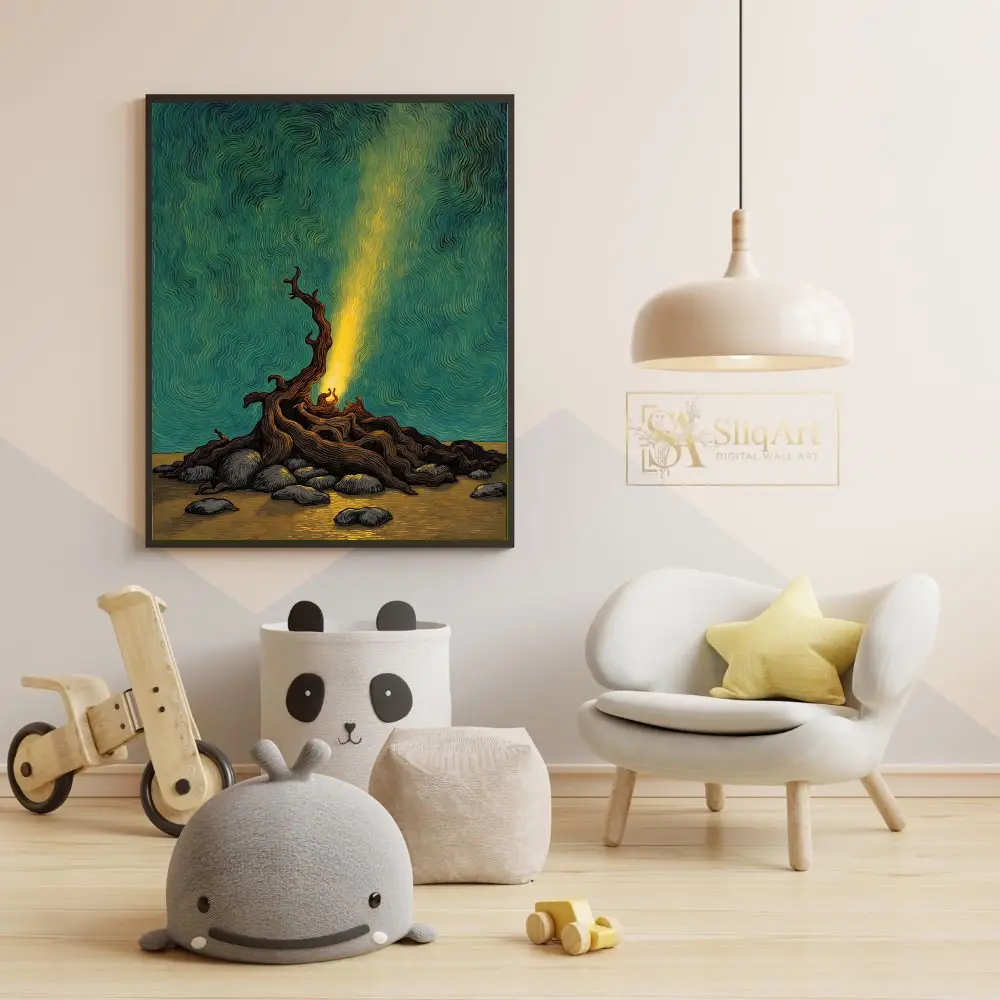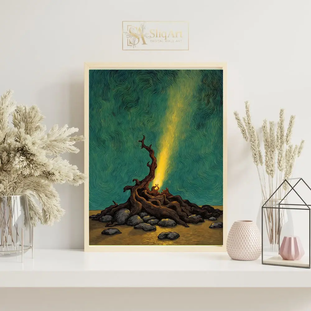 This captivating piece of wall art features a dramatic, gnarled tree root structure glowing with an inner golden light. The light pierces through a mesmerizing sky filled with deep teal and emerald swirls, creating a sense of movement and cosmic energy.