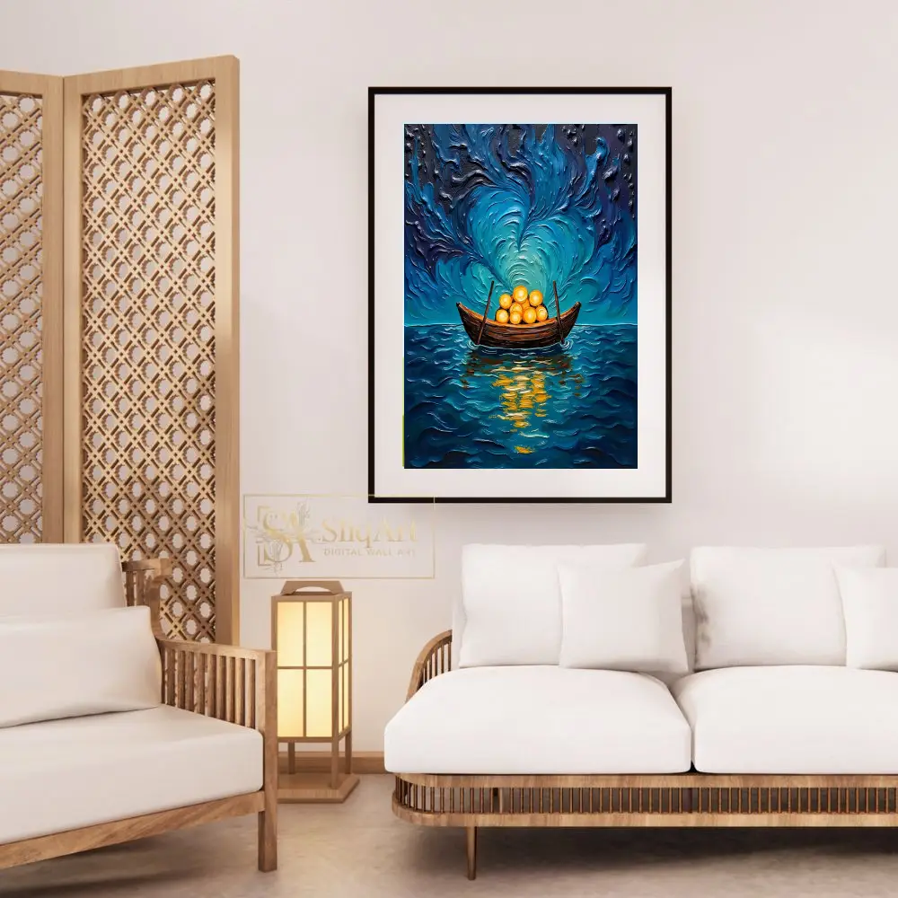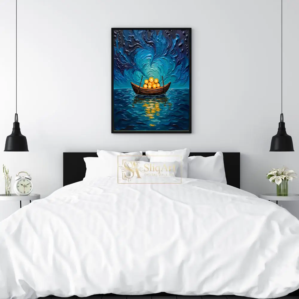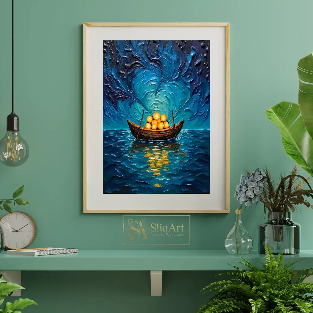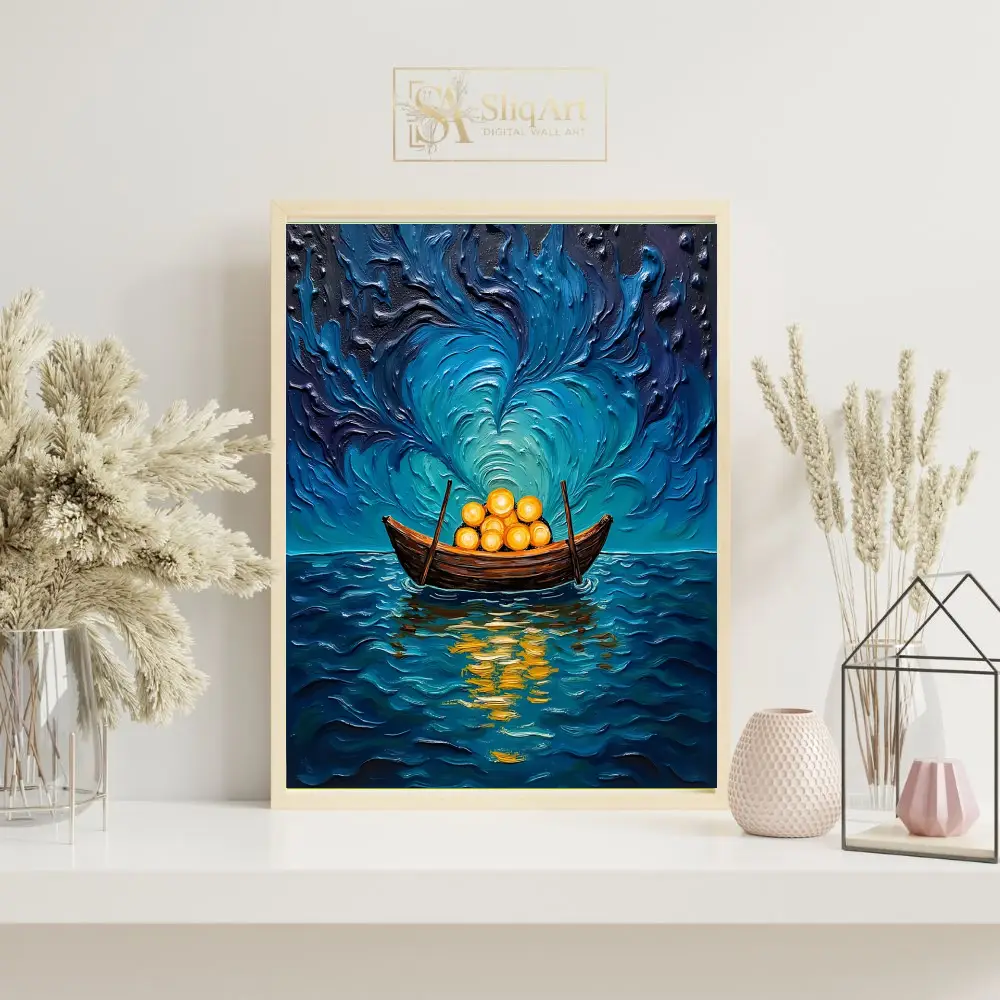 Immerse your space in a dreamlike odyssey with this breathtaking impasto-style wall art. This piece features a lone wooden vessel carrying radiant, glowing golden spheres across a textured, turbulent sea.