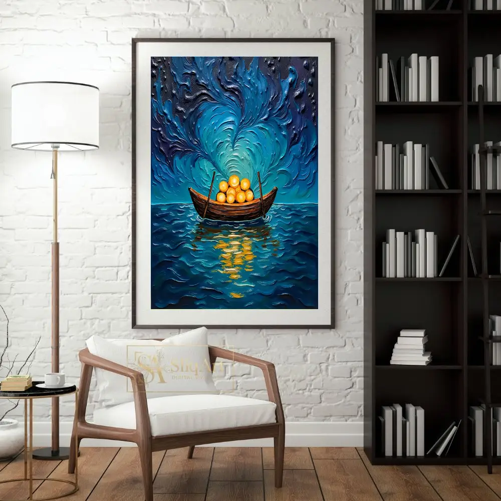 The sky above is a masterpiece of swirling indigo and teal brushstrokes, reminiscent of celestial winds, while the water reflects the warm, vibrant glow of the boat’s cargo. The heavy impasto technique adds incredible physical depth and movement, making every wave and gust of wind feel alive on the canvas. It is a perfect blend of tranquil nautical themes and energetic post-impressionist style.