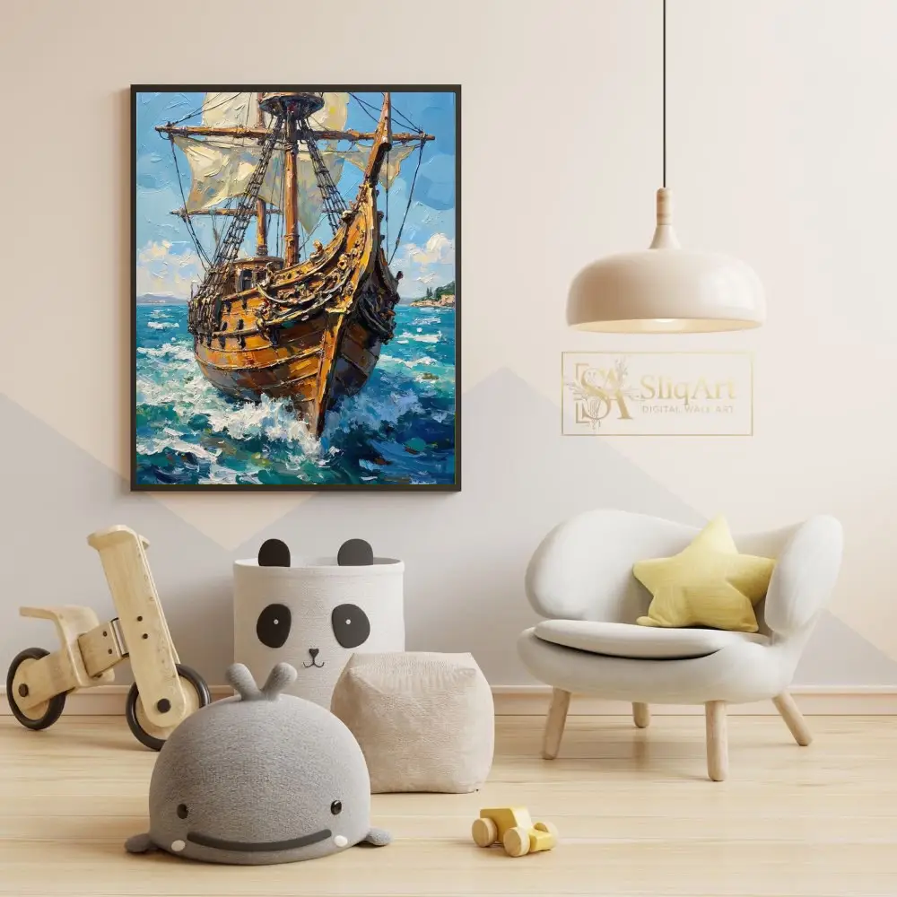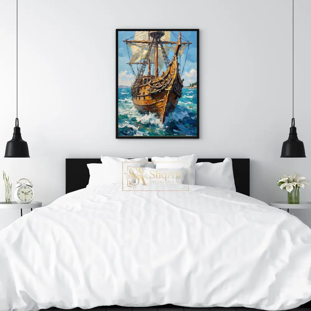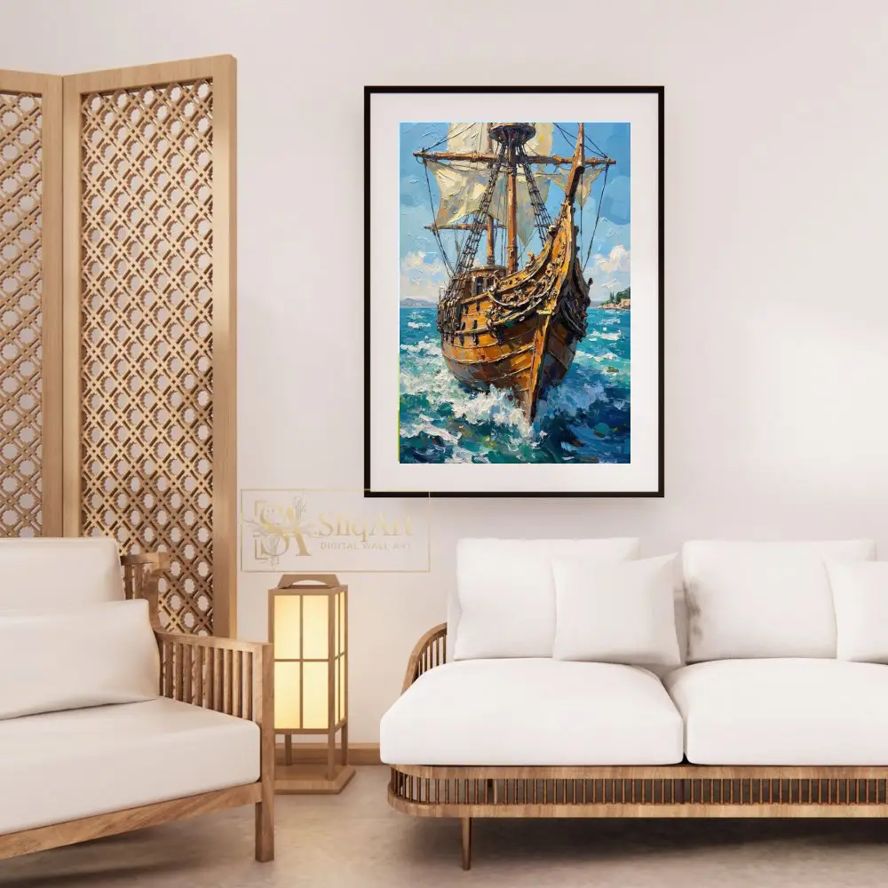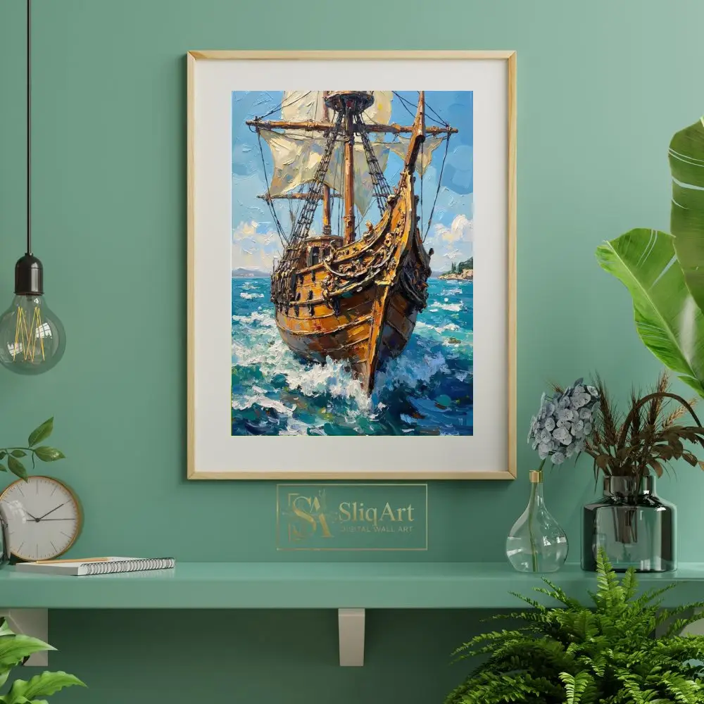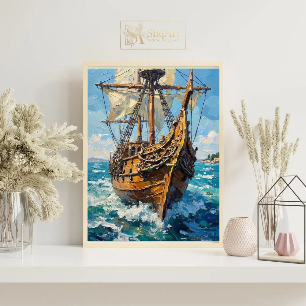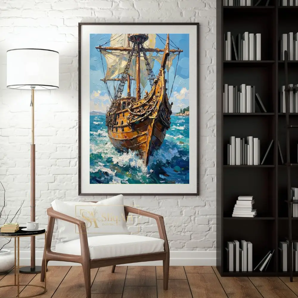 The heavy, textured brushstrokes bring the ornate carvings of the ship’s hull and the billowing white sails to life, creating a palpable sense of movement and grand adventure. The rich ochre and deep gold tones of the wood contrast beautifully against the cool blues and whites of the choppy sea, making it a captivating centerpiece for any maritime enthusiast or lover of classic nautical art.