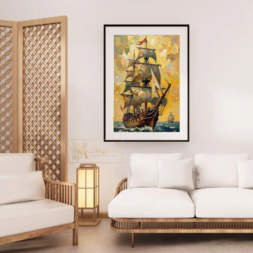 The warm hues of the sunset reflect off the water and the ship’s weathered sails, evoking a sense of timeless adventure and historical grandeur. This piece is a masterclass in texture and light, making it a powerful addition to any modern or traditional interior.