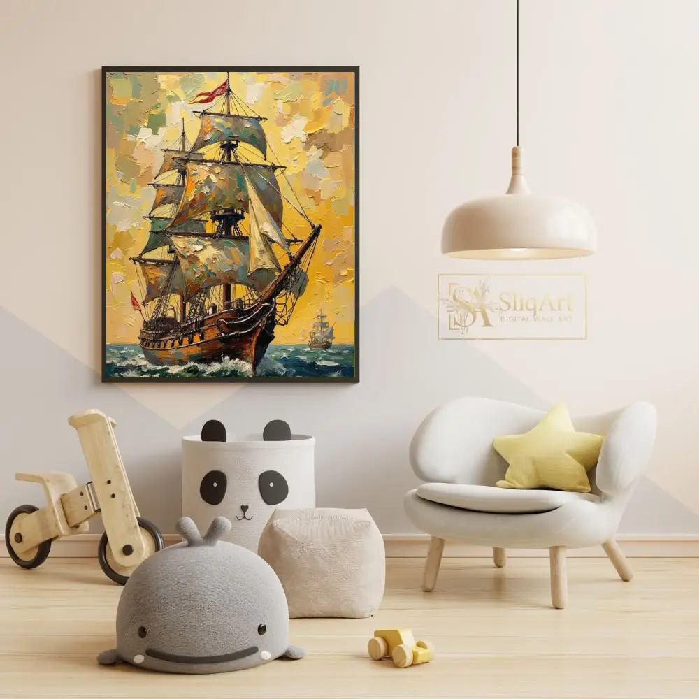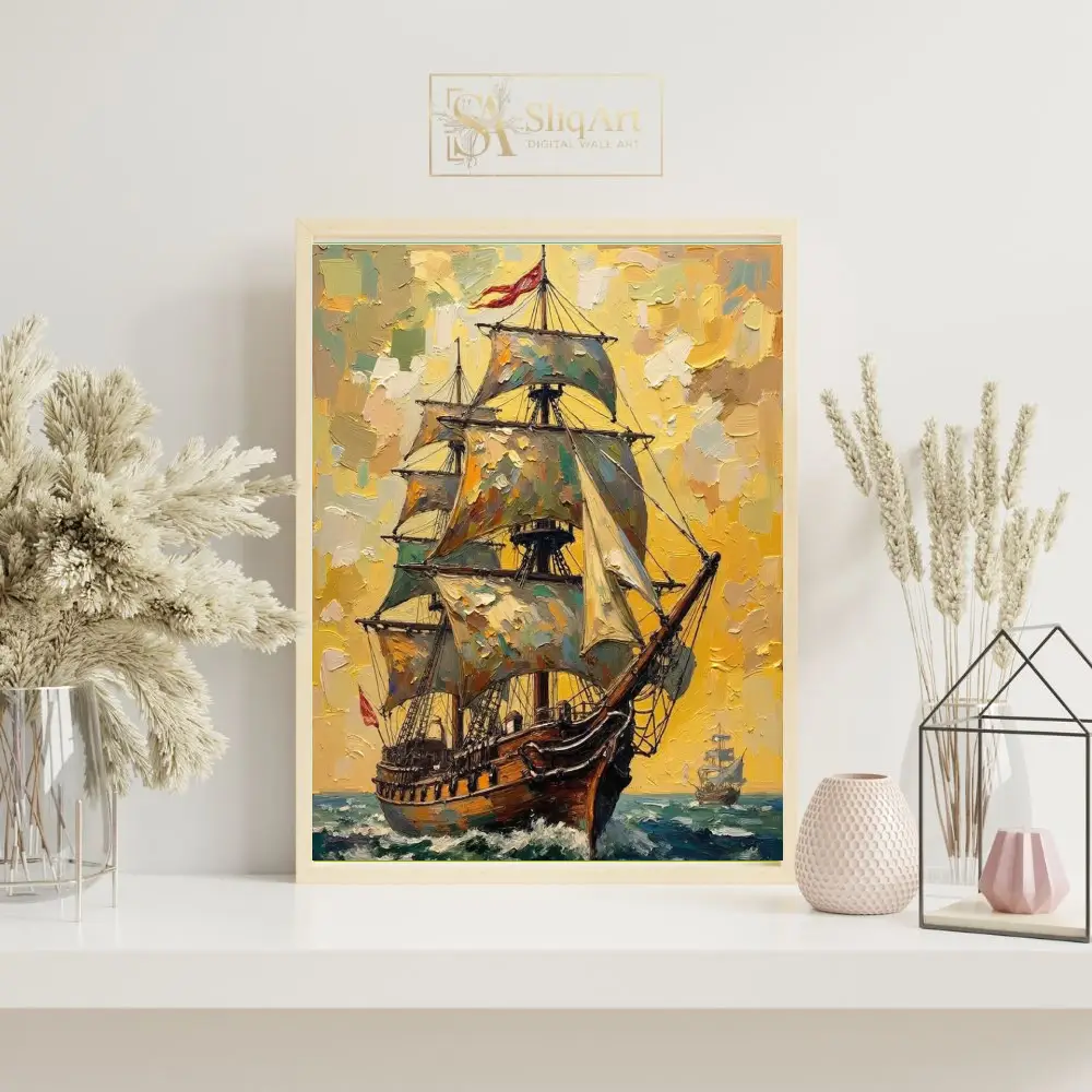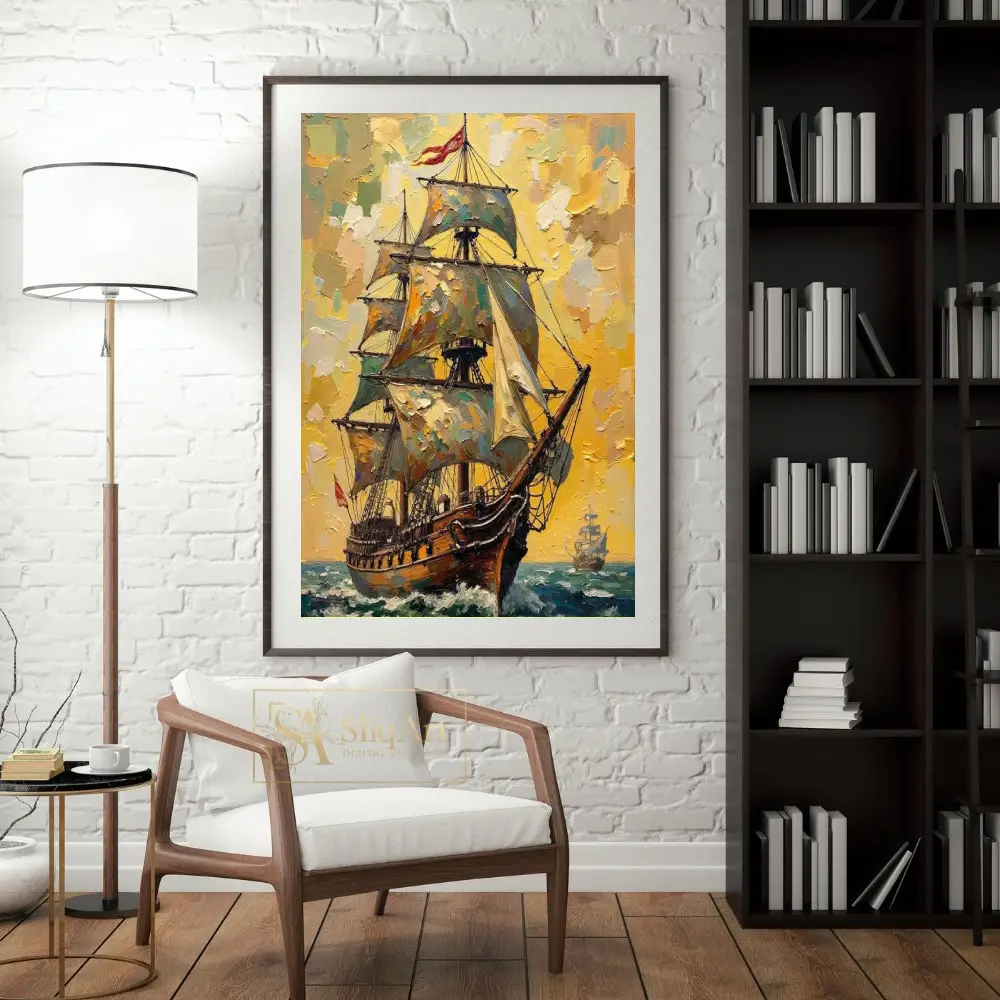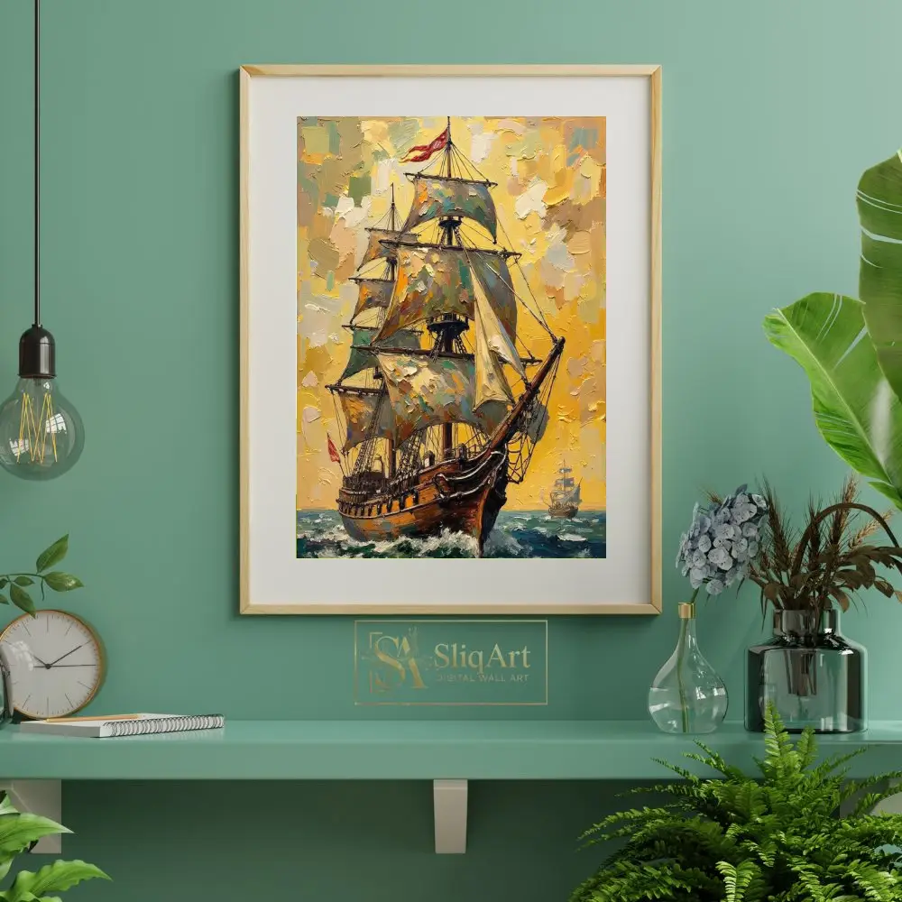 Capture the spirit of exploration and the raw beauty of the ocean with this stunning impressionist oil painting of a majestic sailing ship. The artwork utilizes thick, impasto brushstrokes to create a tactile and dynamic scene, where a grand vessel cuts through turquoise waves under a brilliant, golden sky.