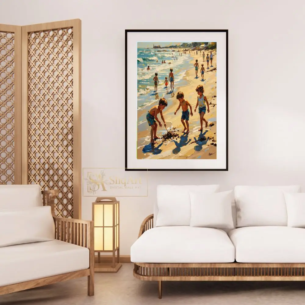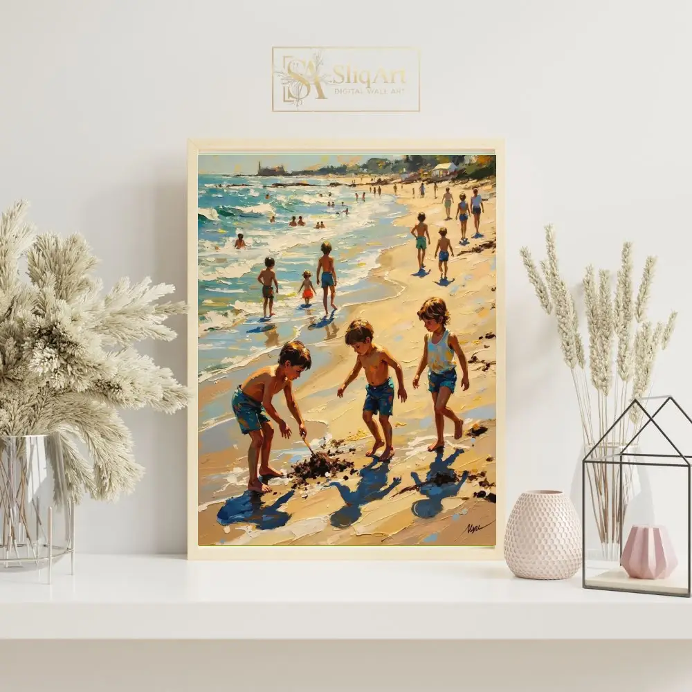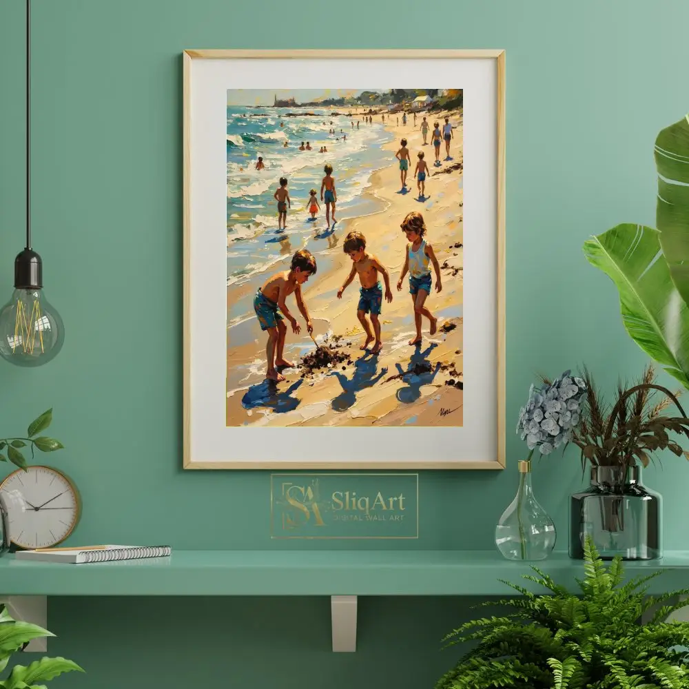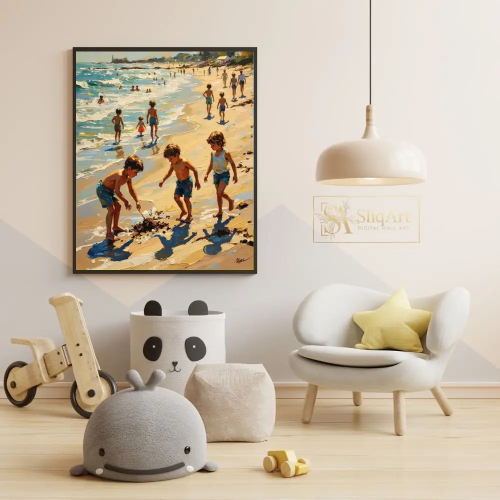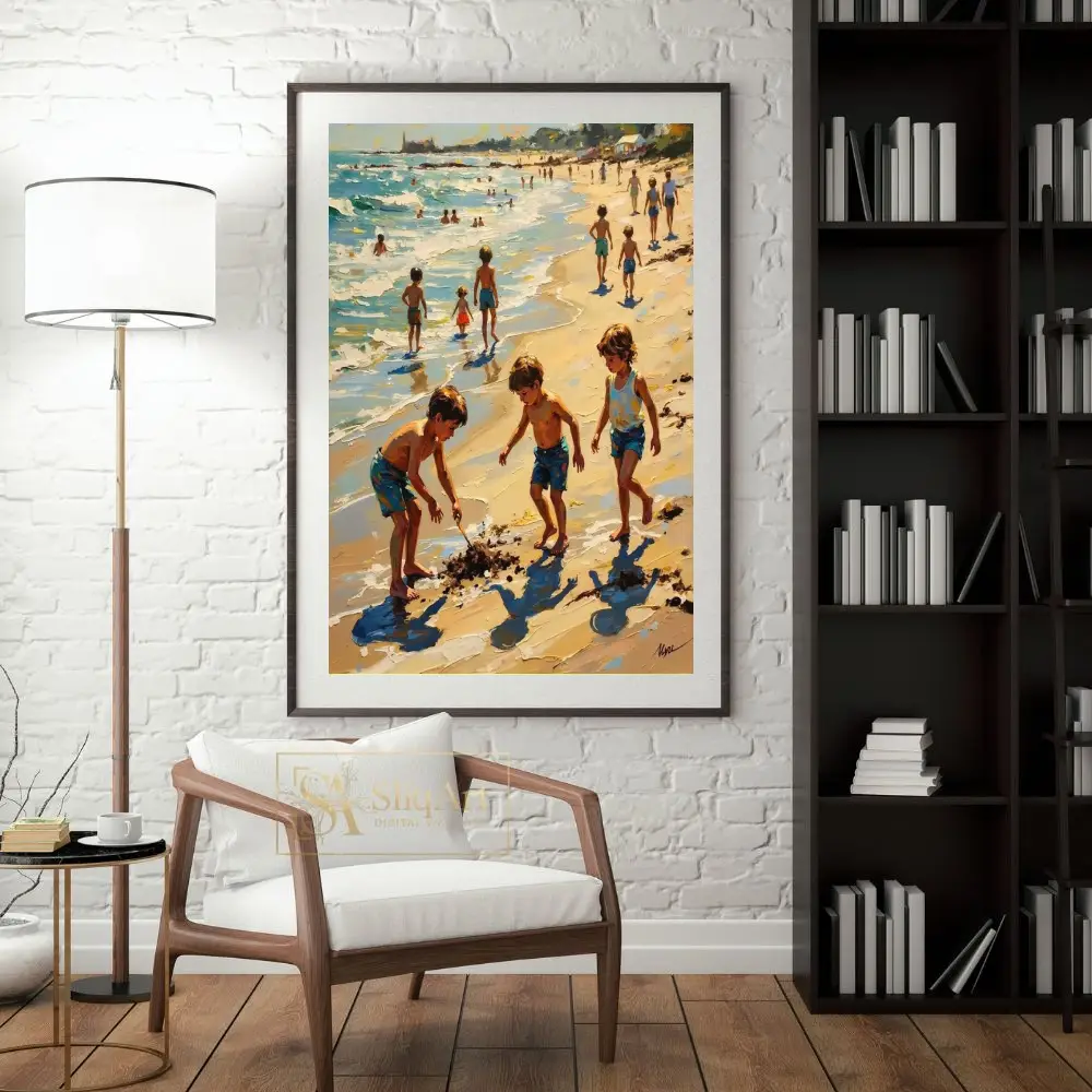 The artwork captures a timeless scene of children playing in the sand and surf, rendered with thick, expressive impasto brushstrokes that bring life to the shimmering water and golden light. Every stroke conveys the movement of the ocean and the carefree joy of childhood, making it a captivating centerpiece for any coastal-themed interior.