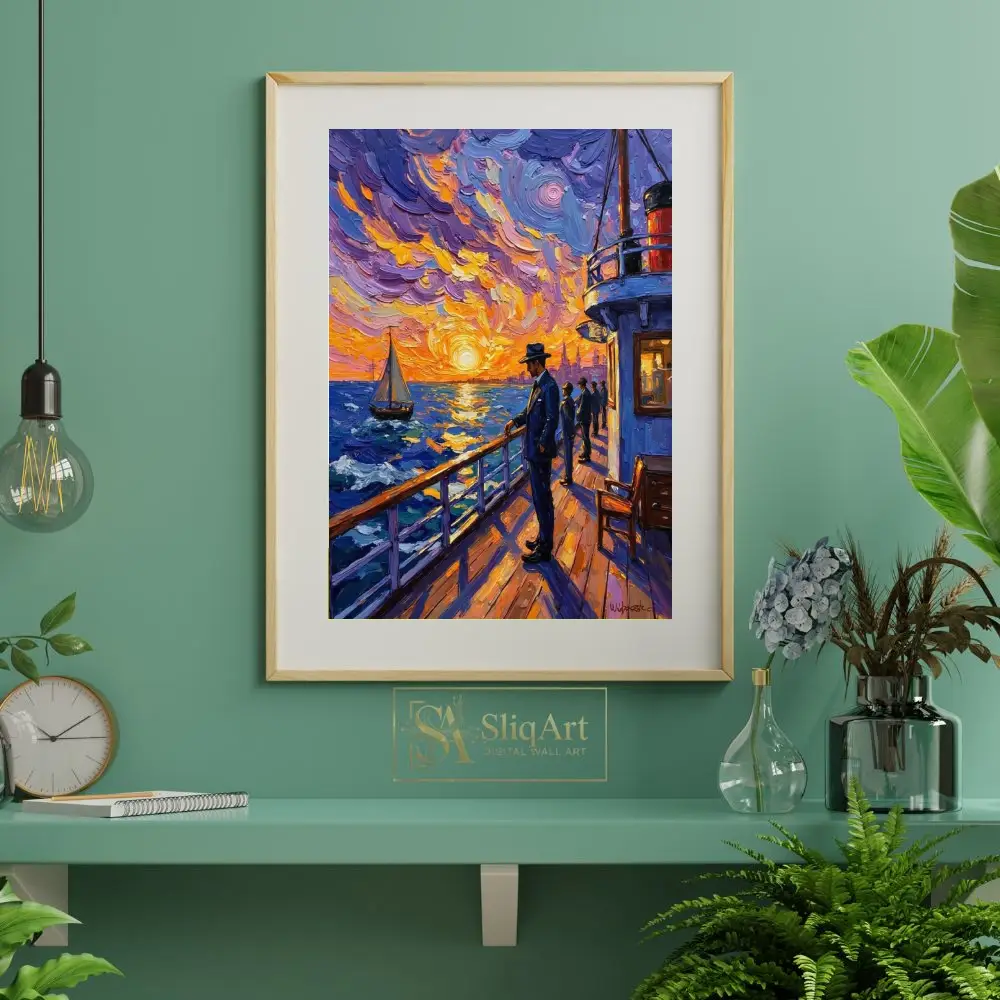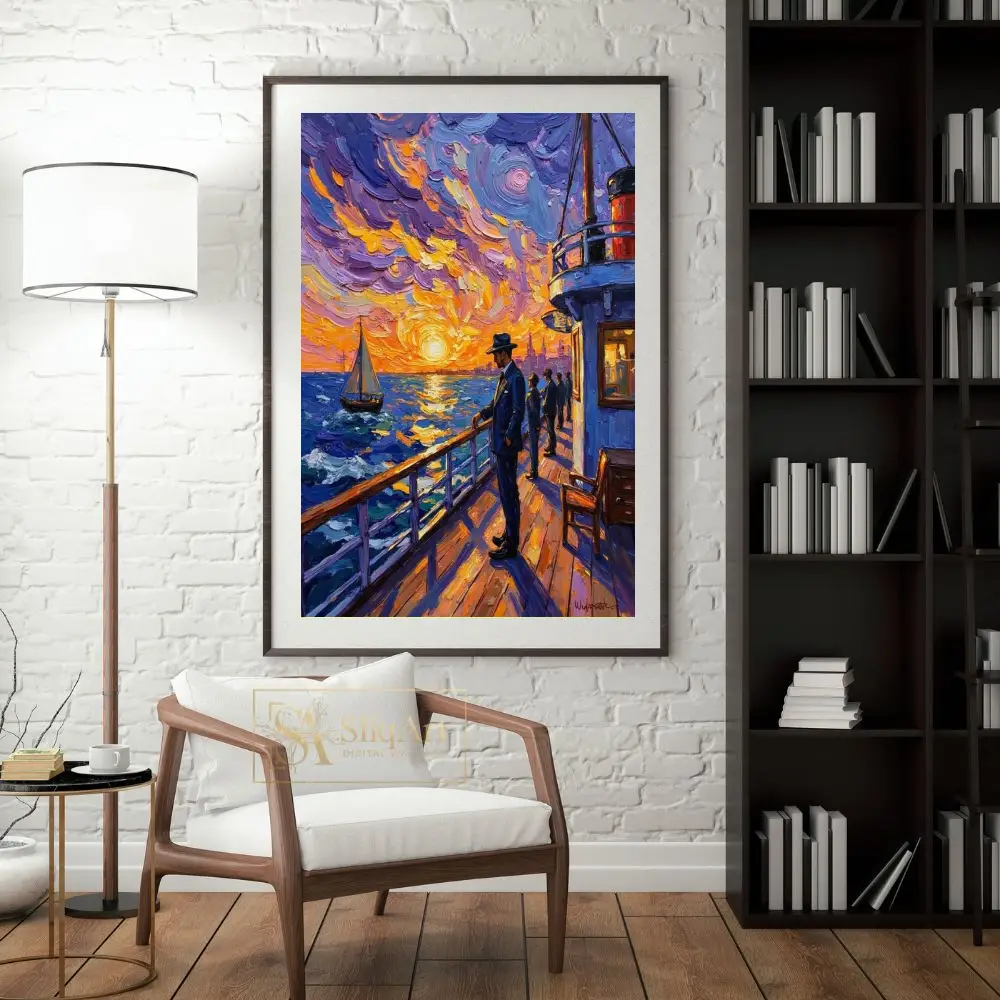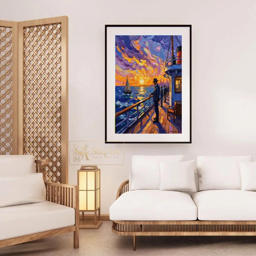 Transform your space with the evocative power of this Post-Impressionist masterpiece. This piece captures a nostalgic moment on the deck of a vintage ocean liner, where a gentleman in classic attire watches a serene sunset.