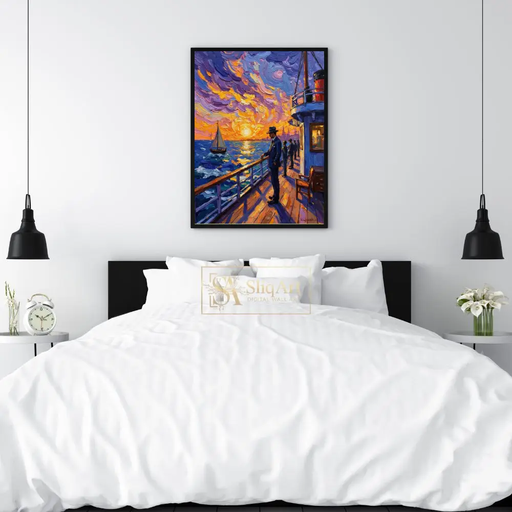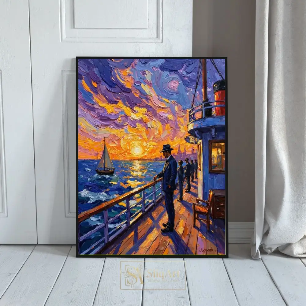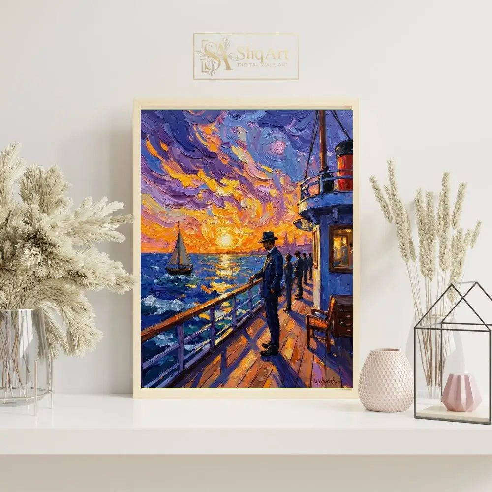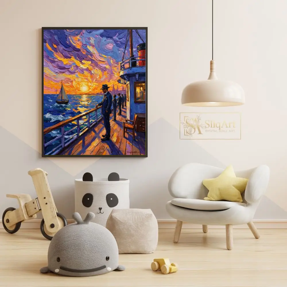 Transform your space with the evocative power of this Post-Impressionist masterpiece. This piece captures a nostalgic moment on the deck of a vintage ocean liner, where a gentleman in classic attire watches a serene sunset.