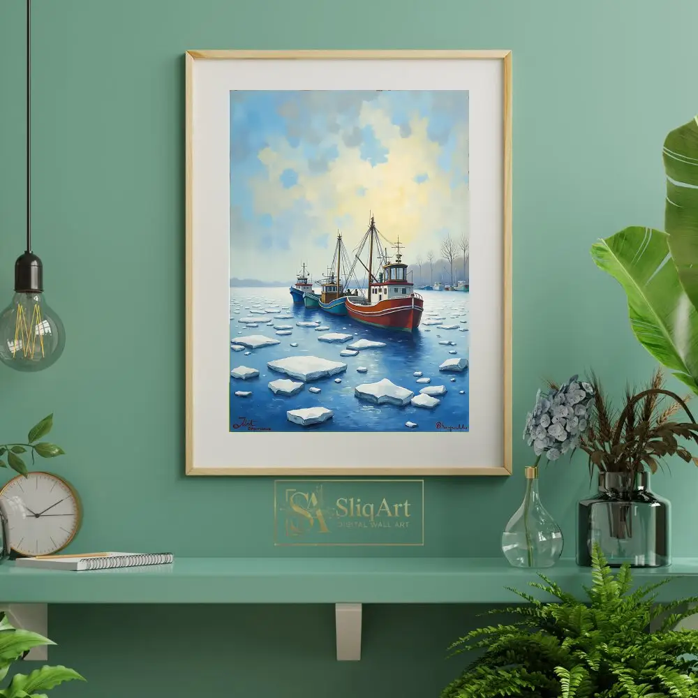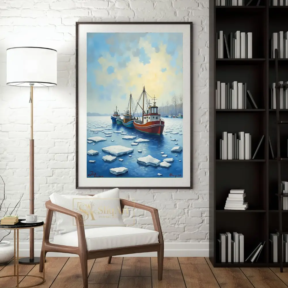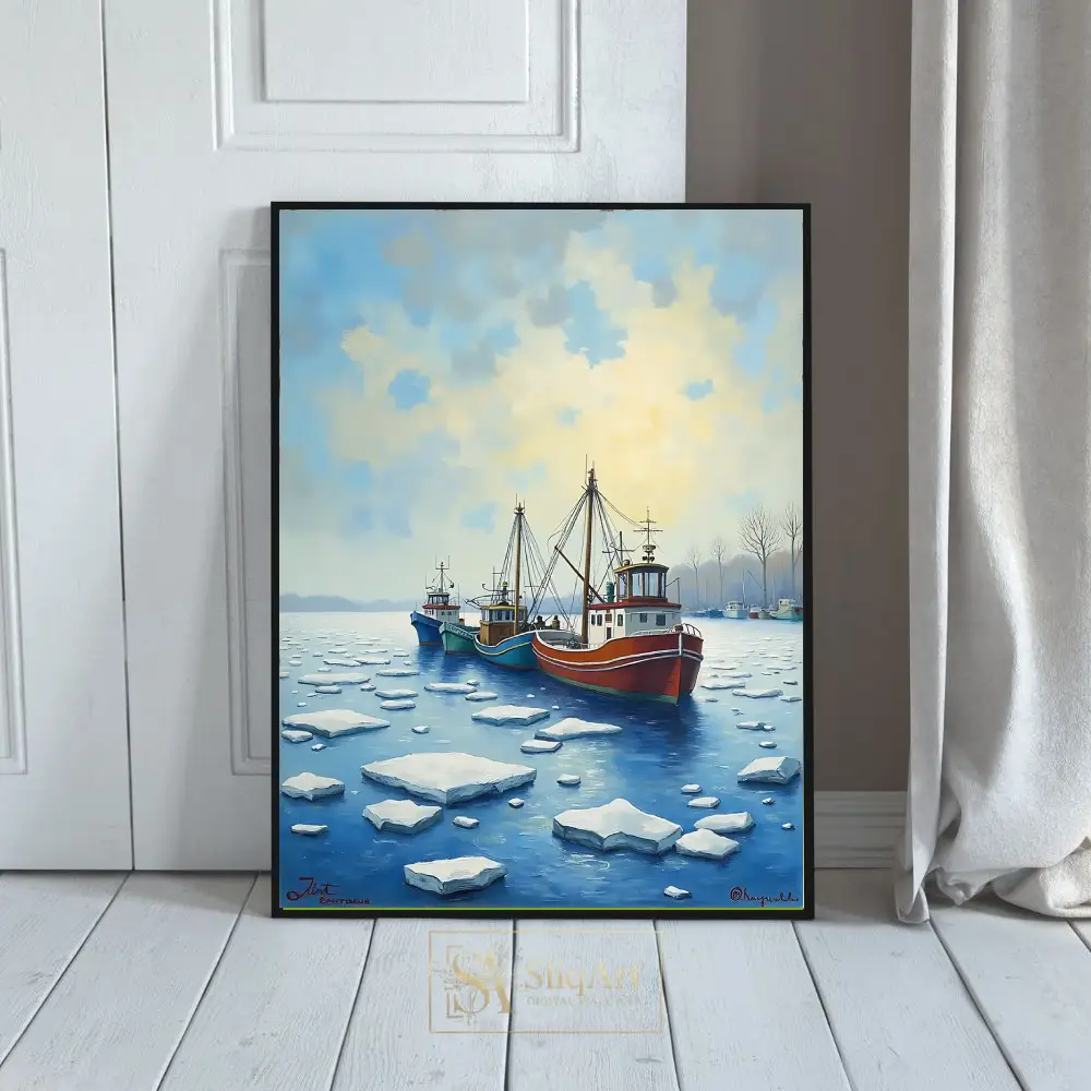 This evocative piece of nautical wall art depicts a fleet of colorful fishing trawlers navigating through a field of ice floes in a serene harbor. The composition features a striking contrast between the vibrant red, teal, and blue hulls of the boats and the cool, crystalline whites and deep blues of the frozen water.