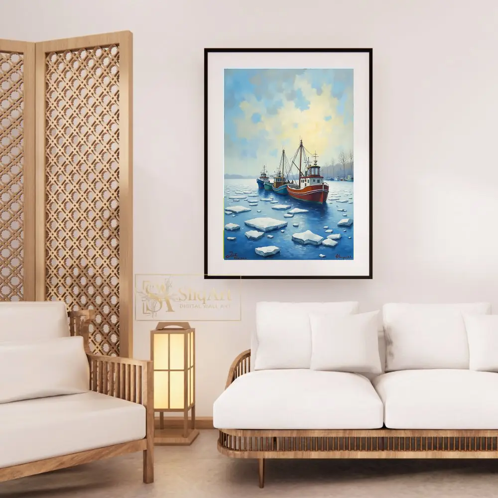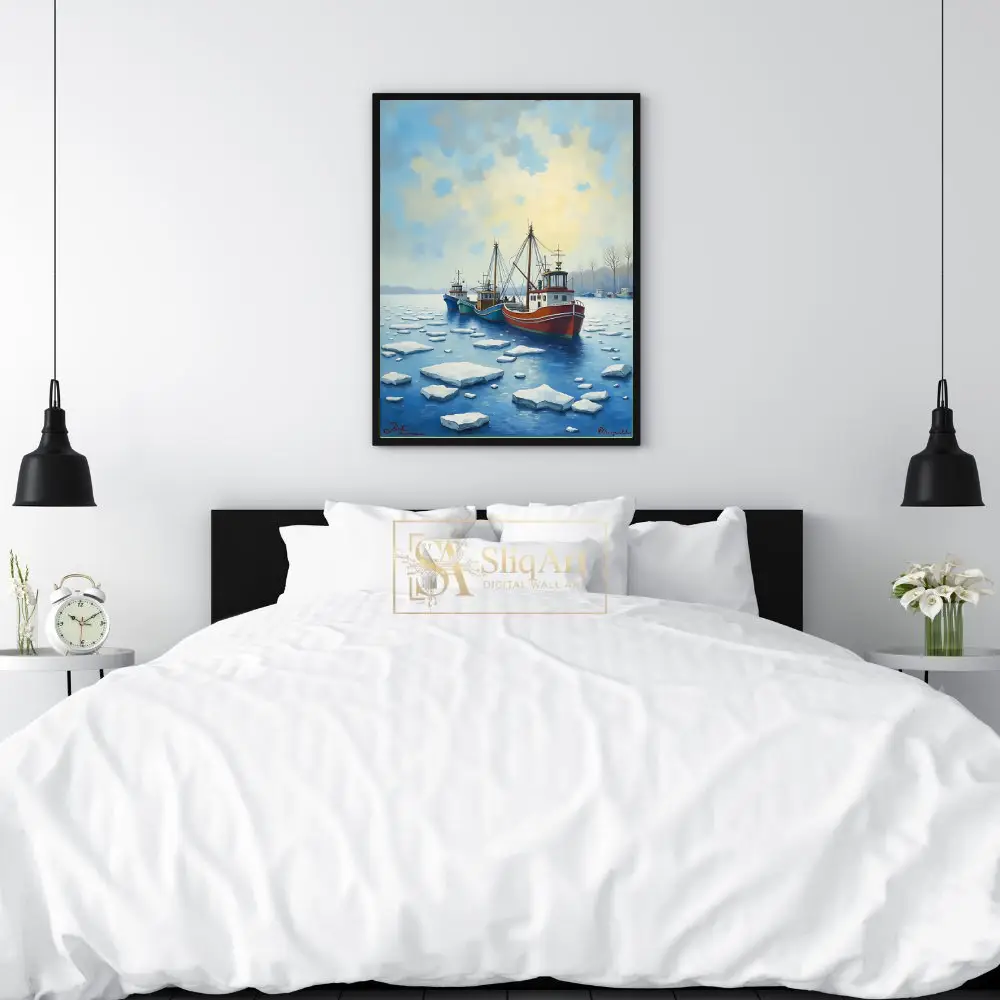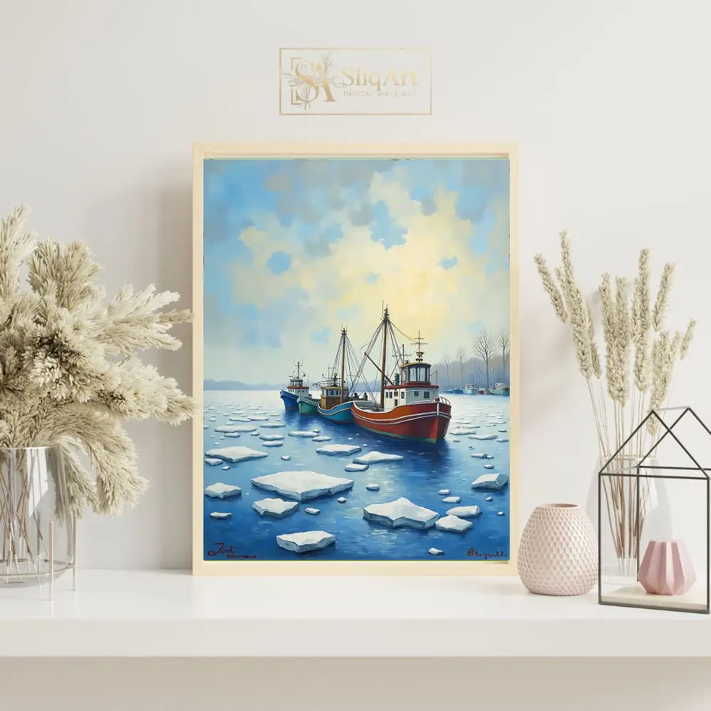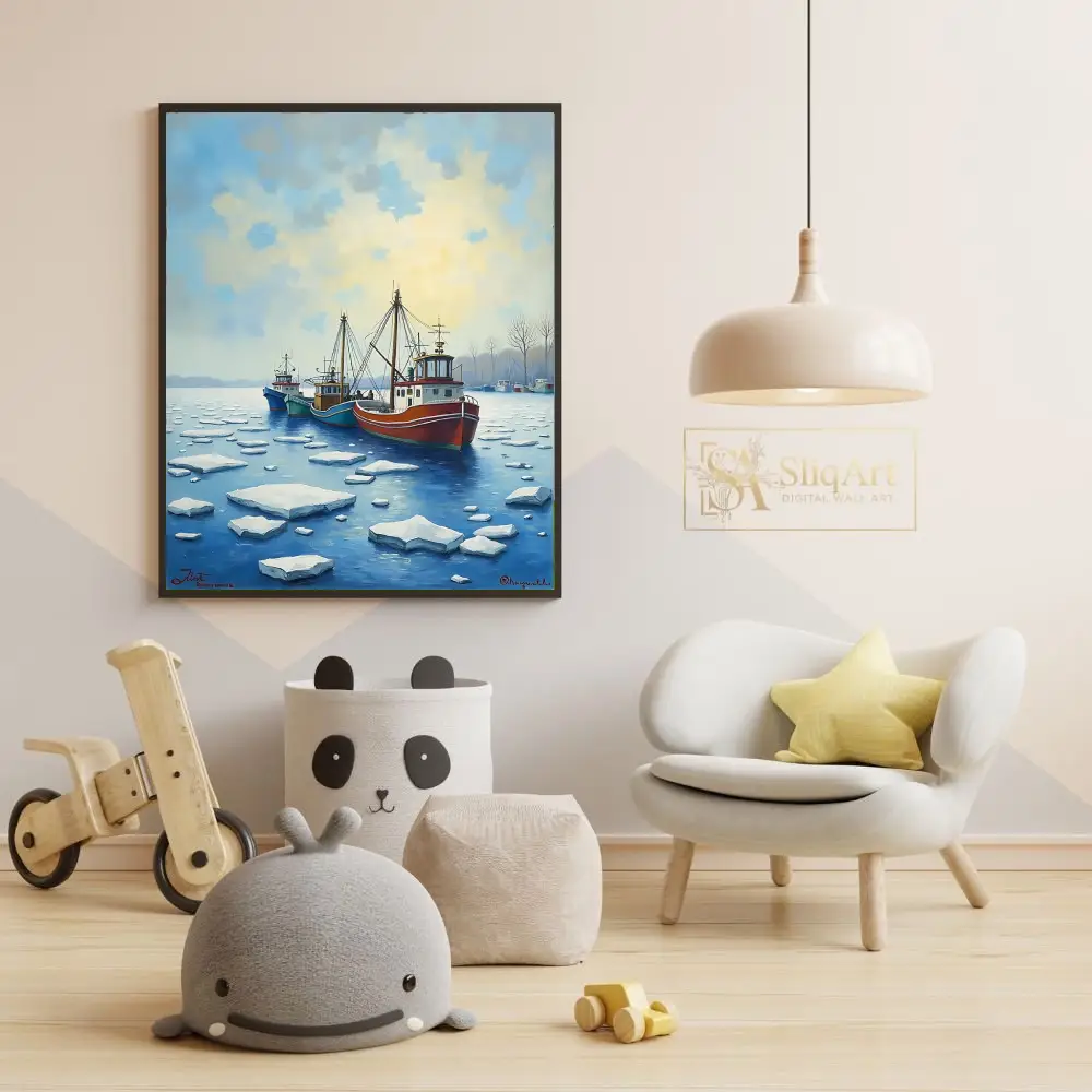 This evocative piece of nautical wall art depicts a fleet of colorful fishing trawlers navigating through a field of ice floes in a serene harbor. The composition features a striking contrast between the vibrant red, teal, and blue hulls of the boats and the cool, crystalline whites and deep blues of the frozen water.
