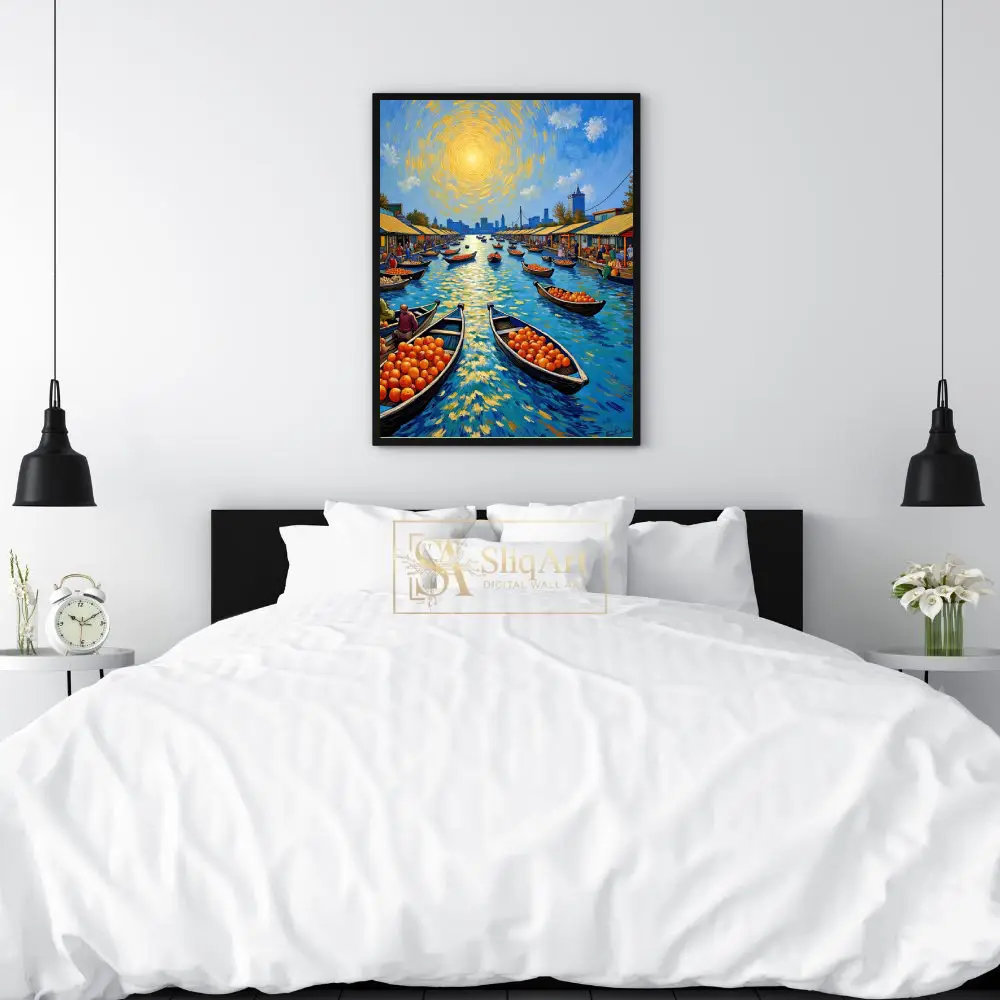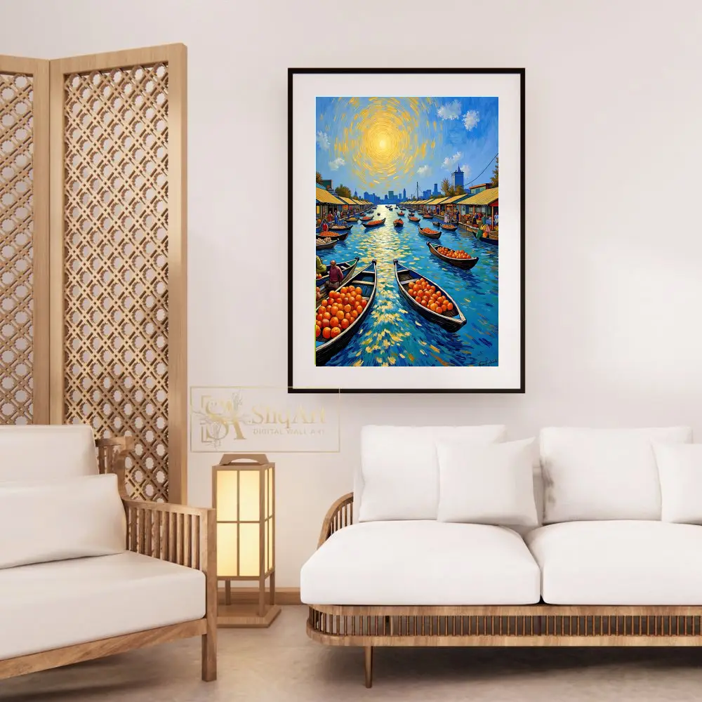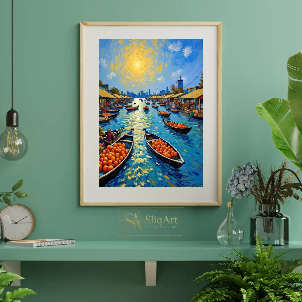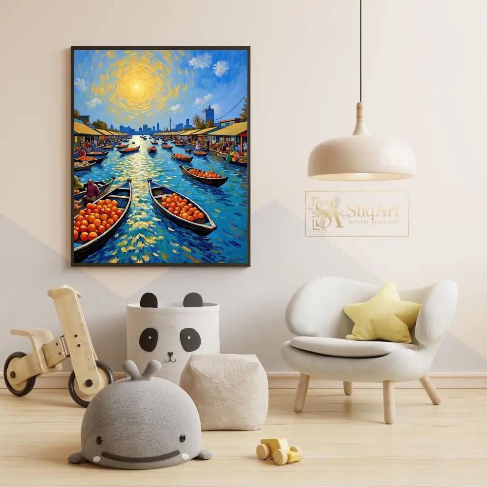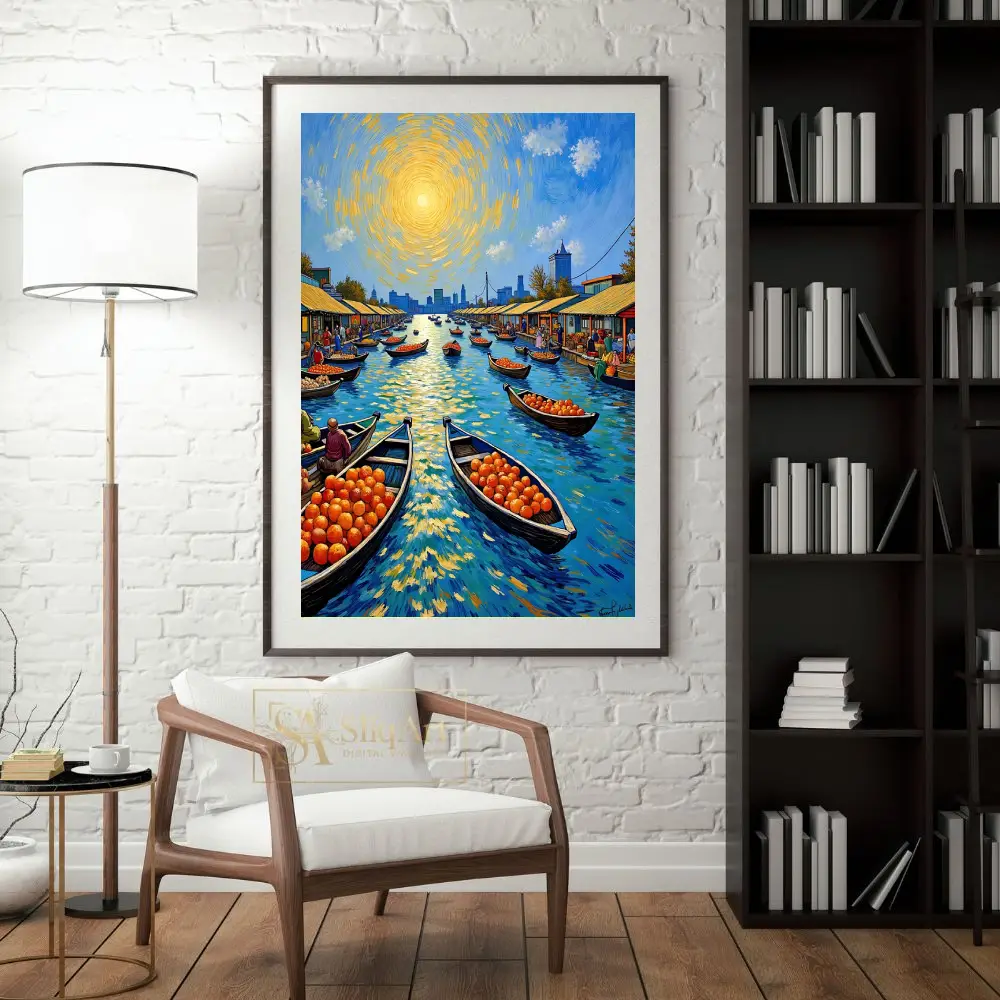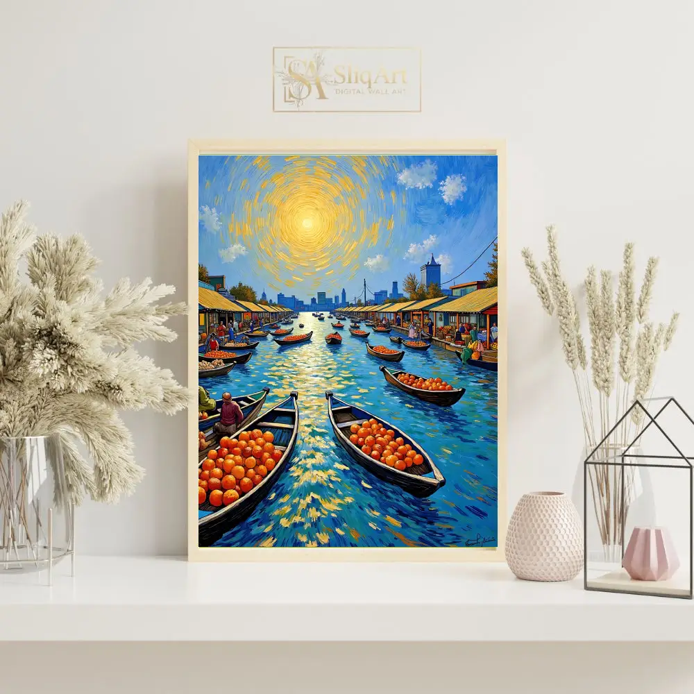 Experience the radiant energy of a bustling waterway with this Post-Impressionist masterpiece. Featuring bold, swirling brushstrokes reminiscent of Van Gogh, this artwork depicts a floating market filled with boats of golden citrus under a magnificent, circular sun.