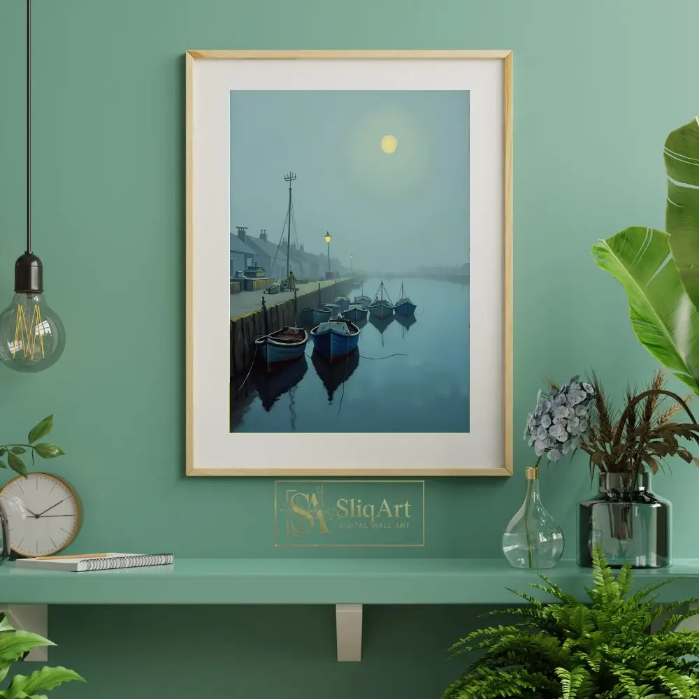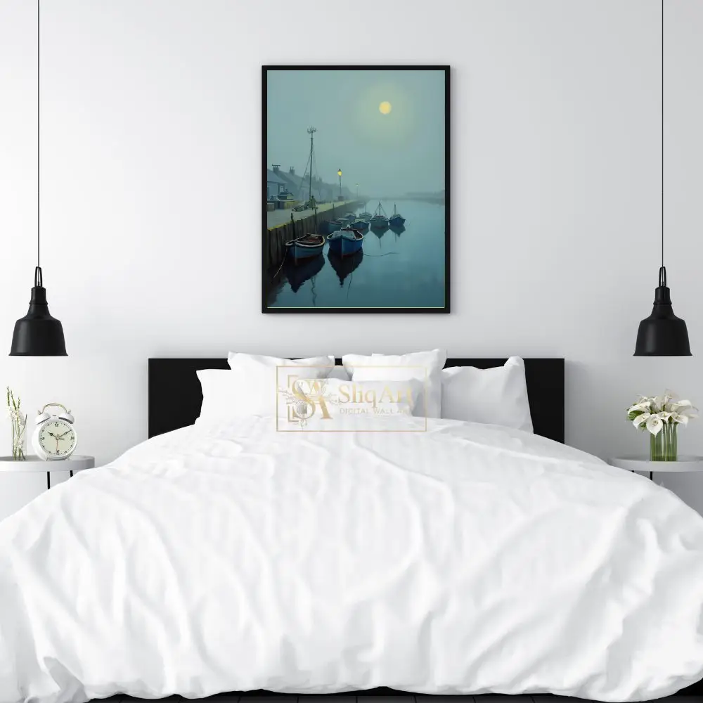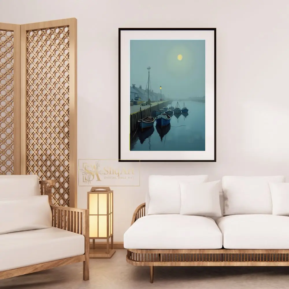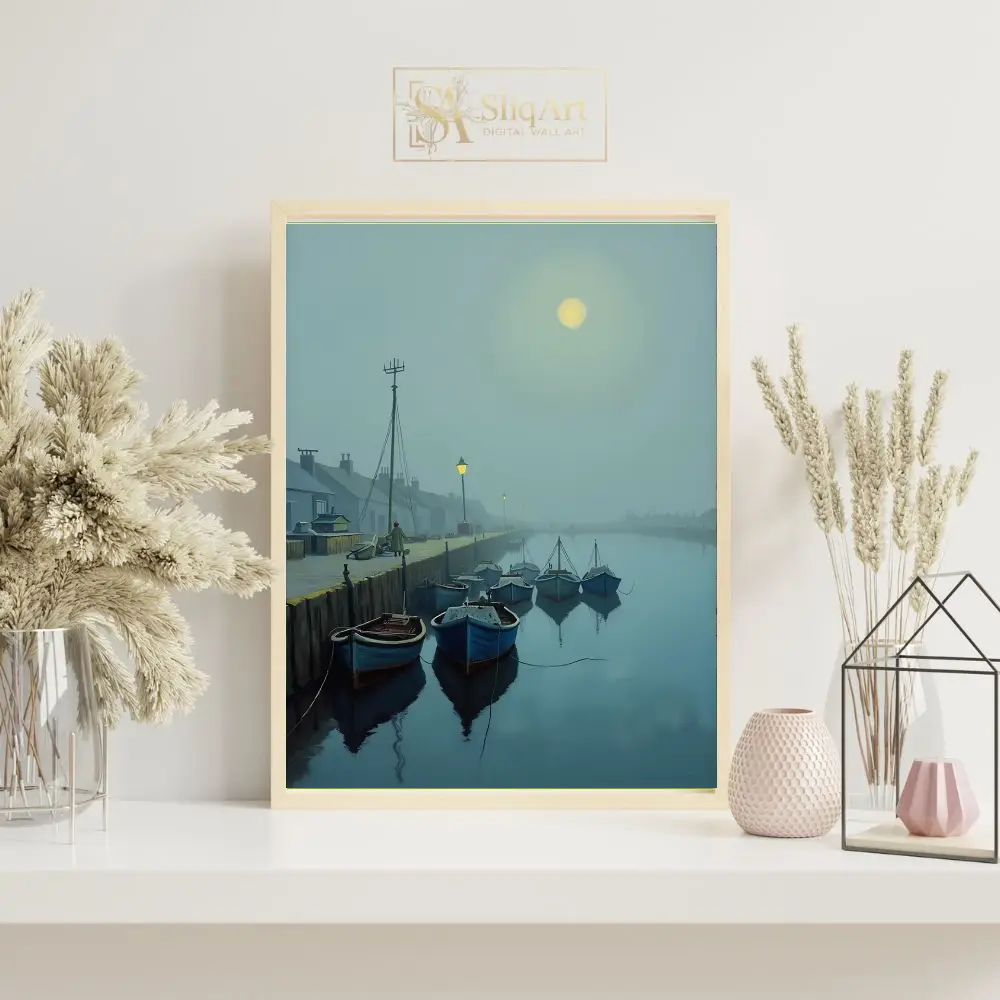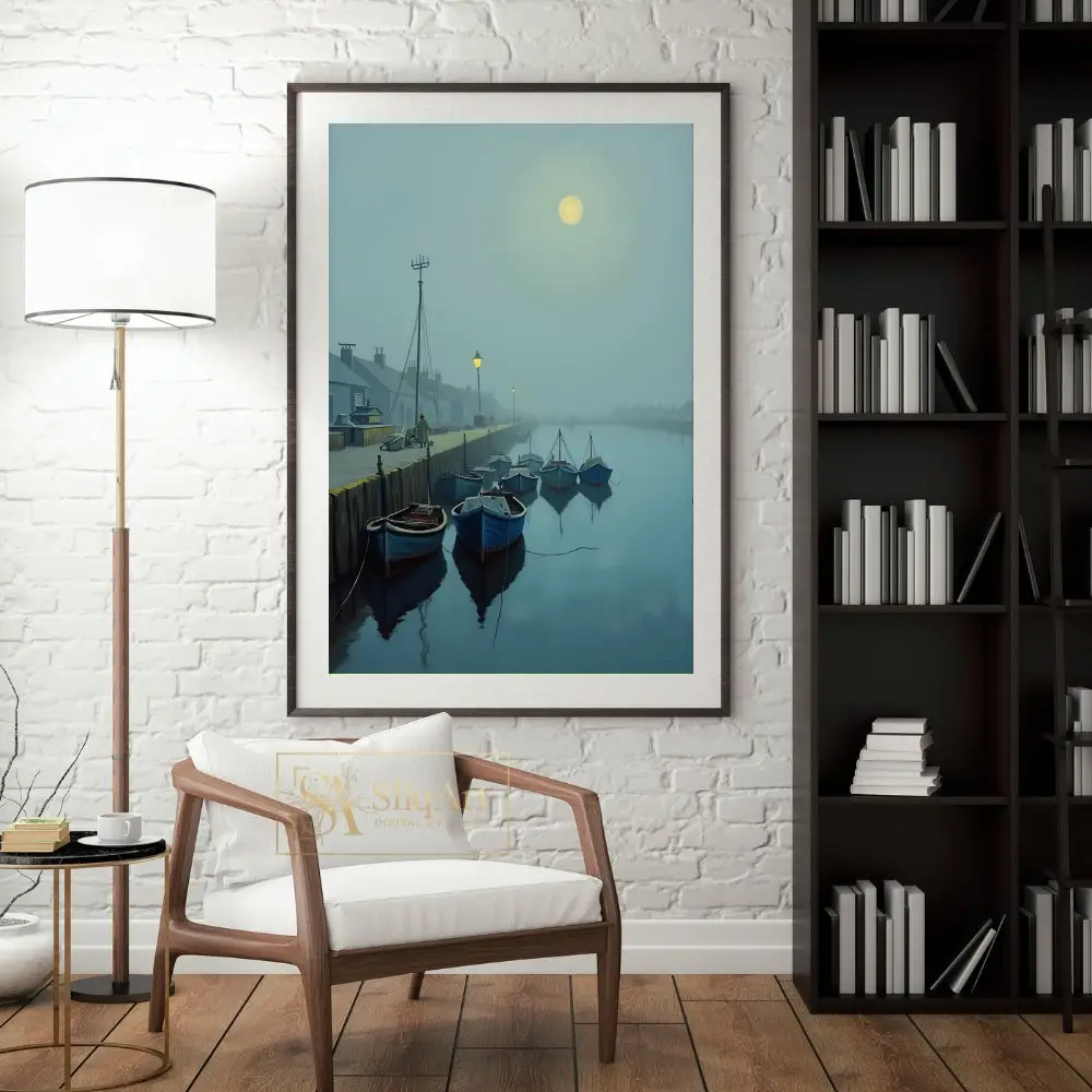 A luminous moon glows through the mist, casting a gentle light over the scene, while distant streetlamps provide a warm, inviting contrast to the cool blue and gray tones. This piece captures a moment of profound stillness and maritime charm, making it an ideal choice for those seeking to bring a sense of peace and contemplation to their interior design.