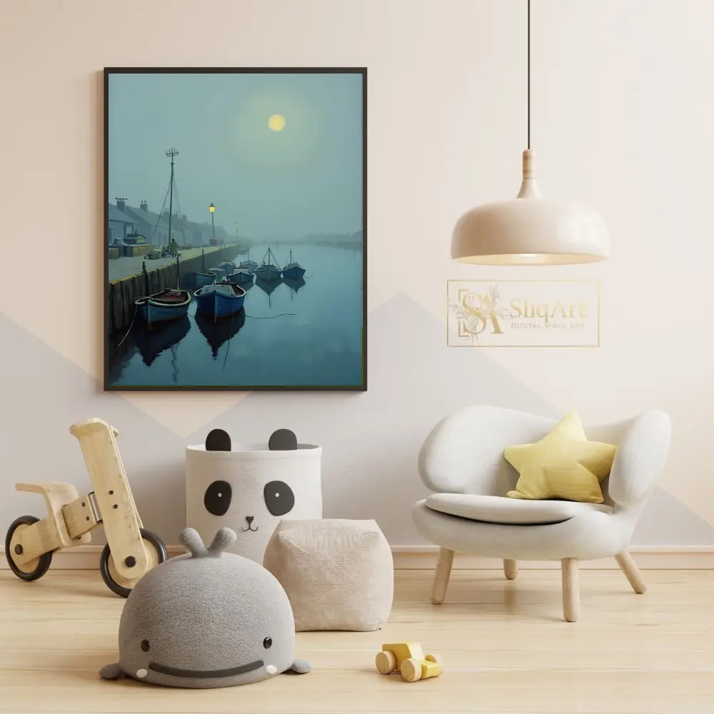 Be the first to review “Serene Foggy Harbor Moonlight Wall Art – Blue Boats Nautical Decor”