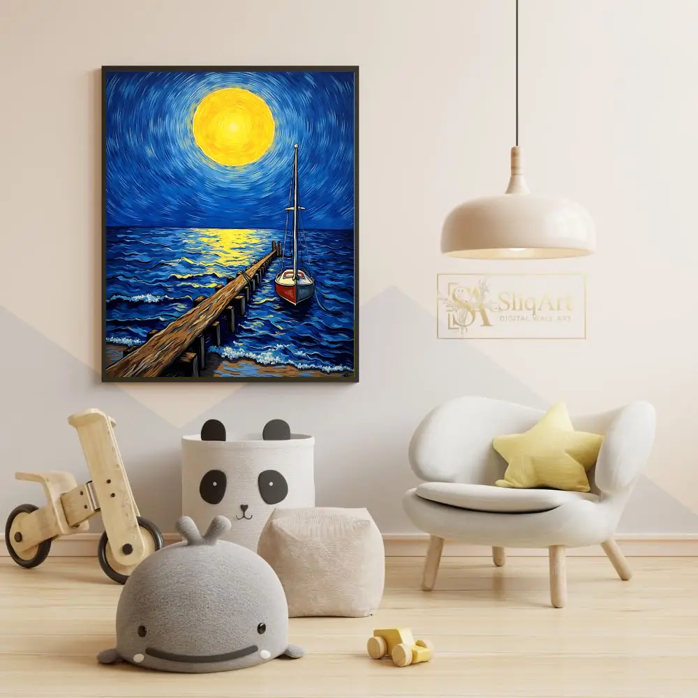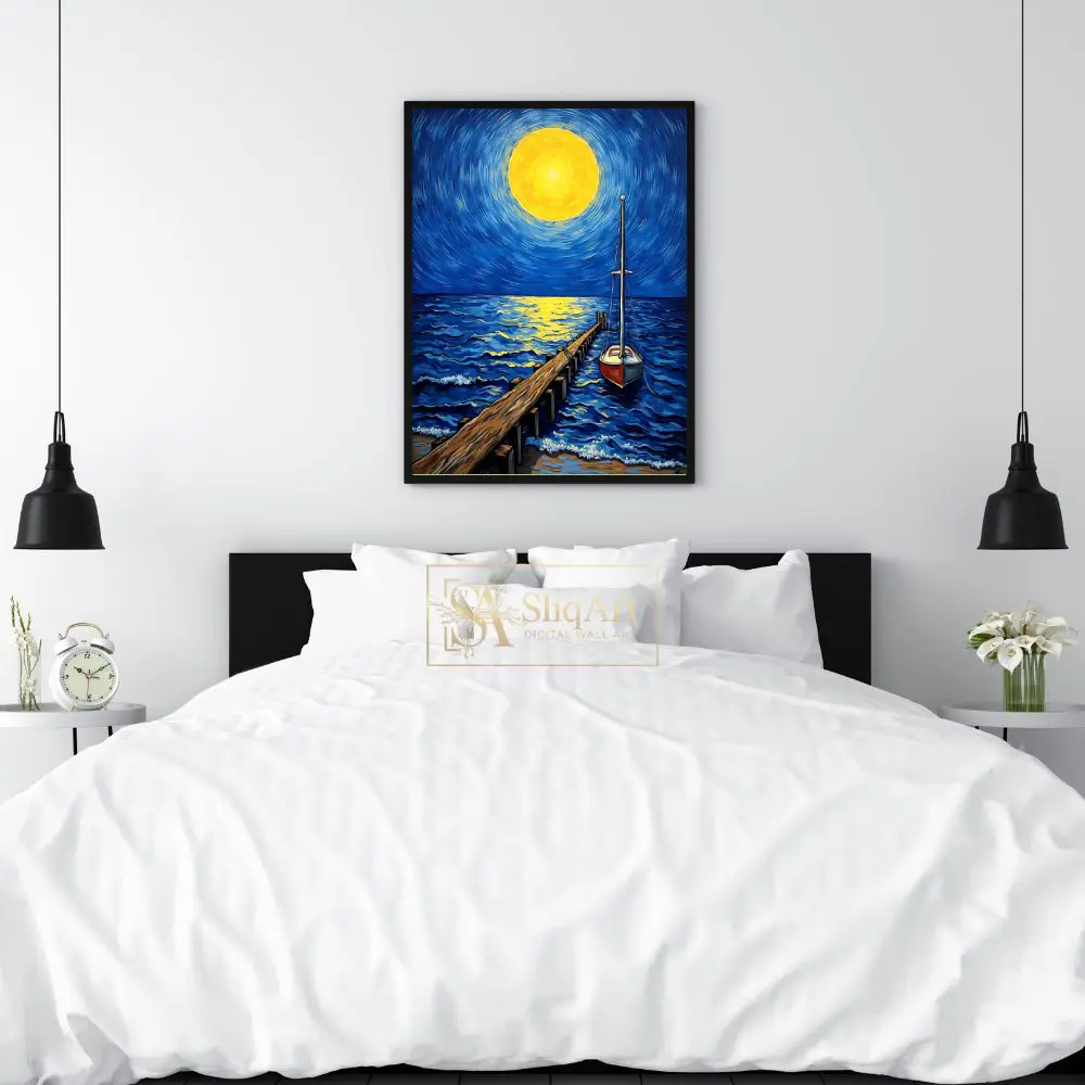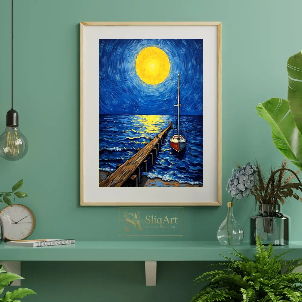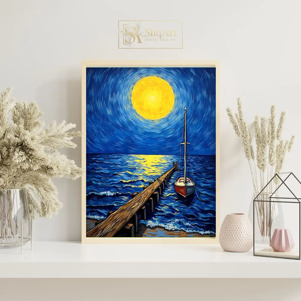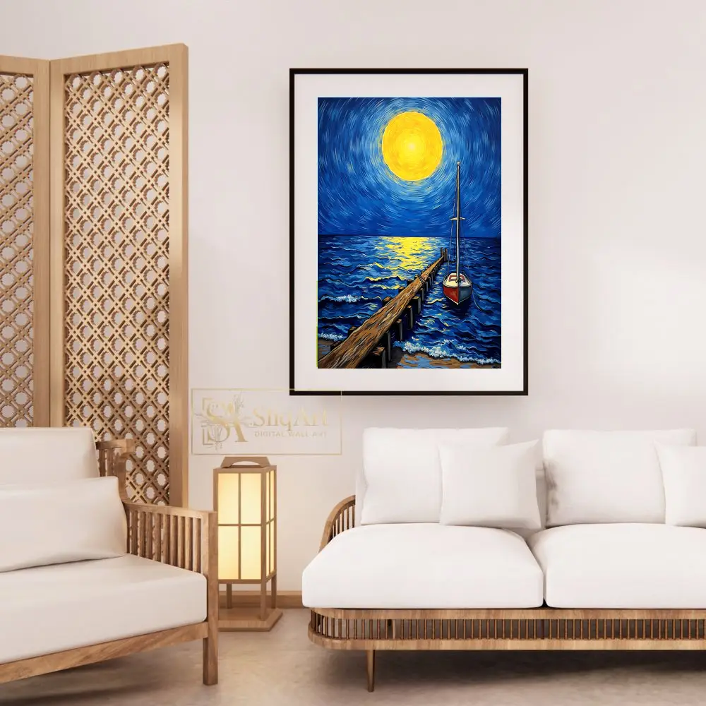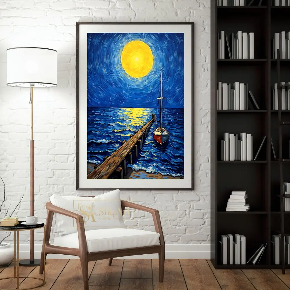 Elevate your space with this stunning Post-Impressionist style canvas art, featuring a glowing celestial body casting a golden path across deep blue ocean waves. The swirling brushstrokes of the midnight sky create a sense of dynamic energy, while the steady wooden pier and anchored sailboat offer a grounding presence.
