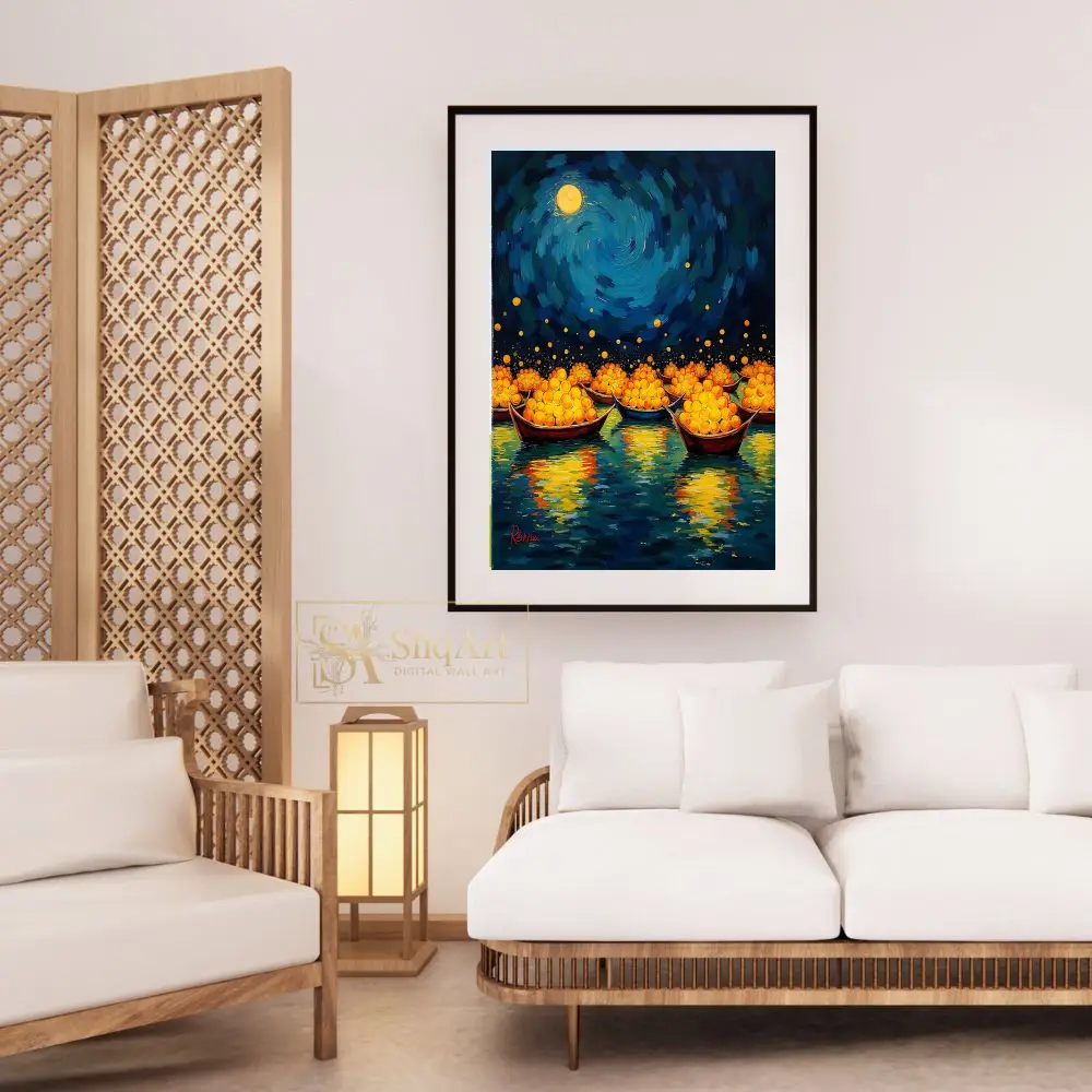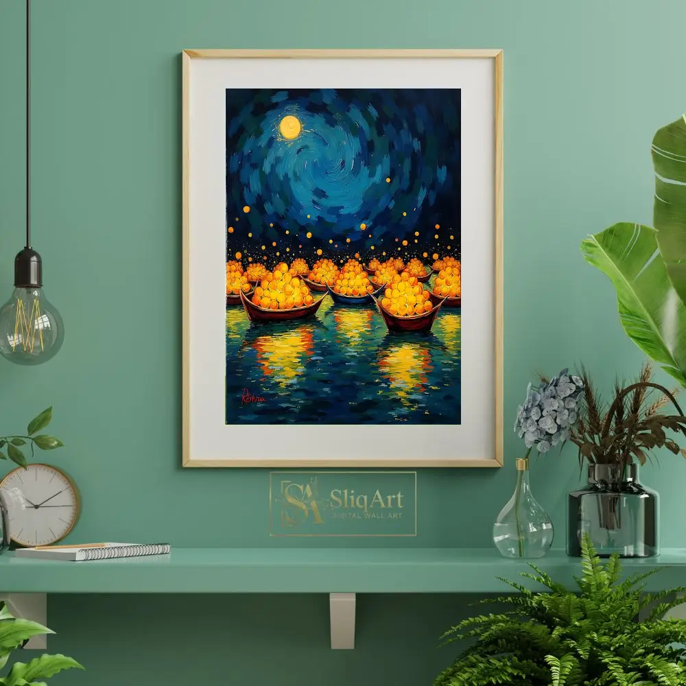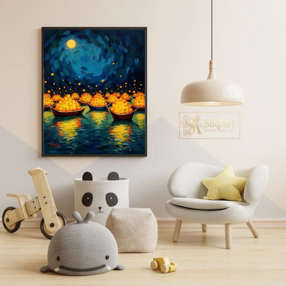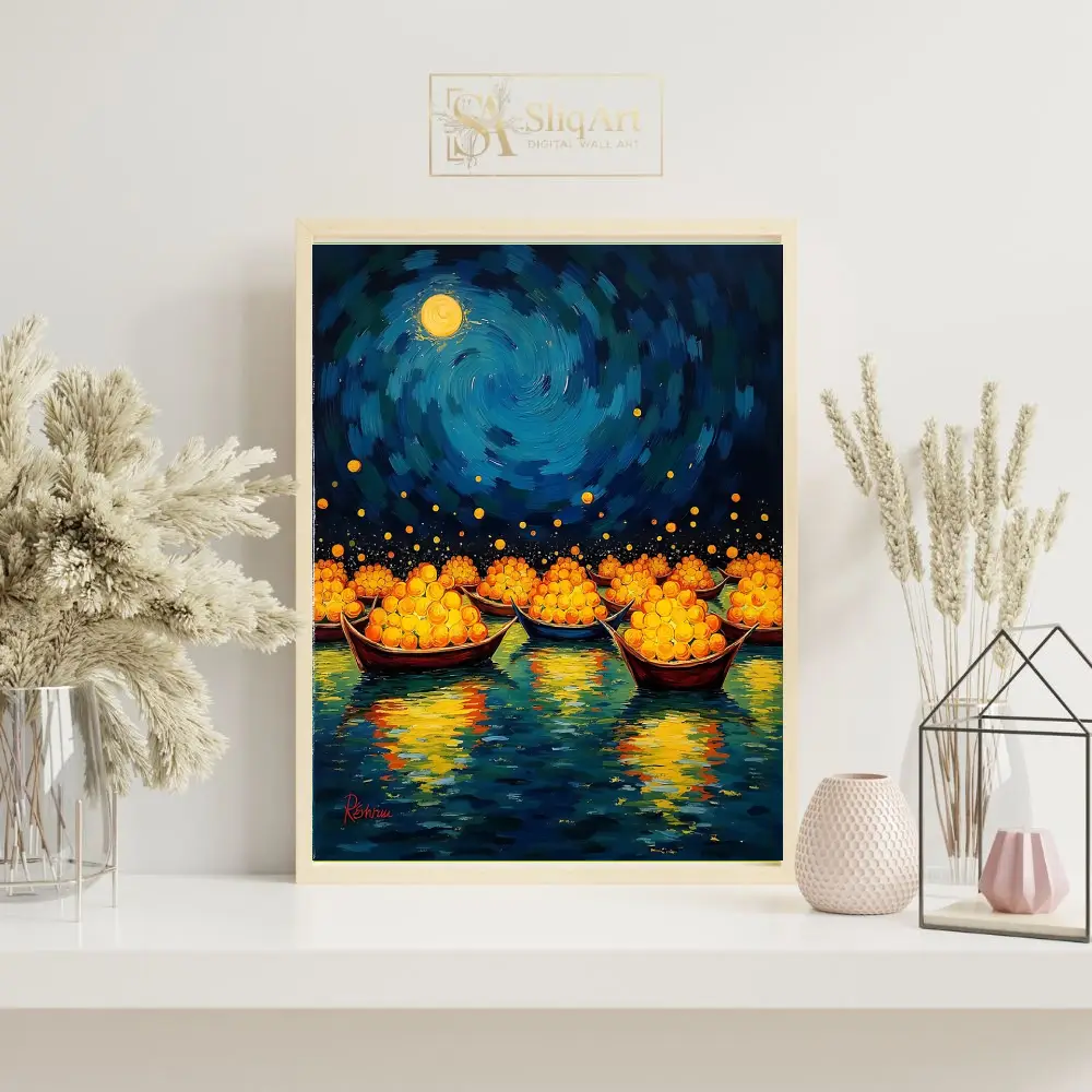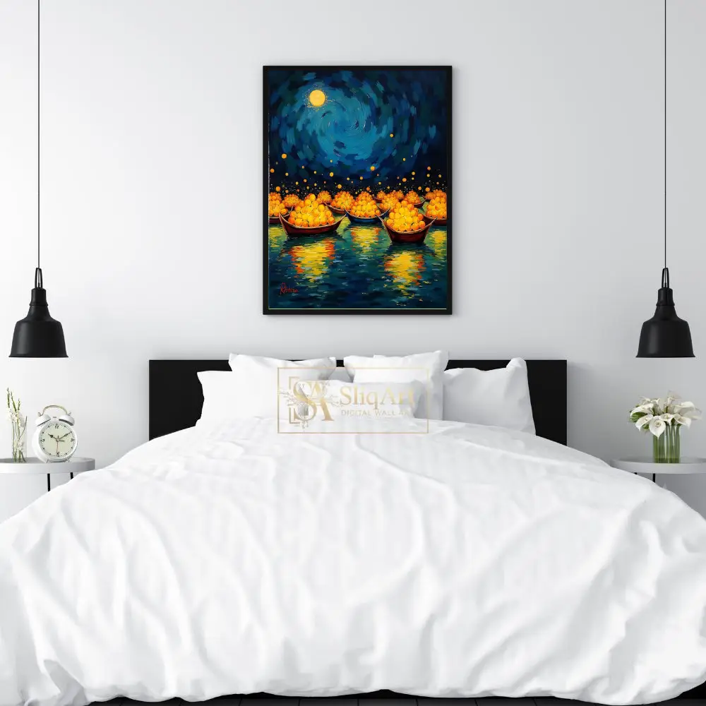 Elevate your interior with this mesmerizing Impressionist masterpiece. Featuring a flotilla of traditional boats laden with glowing golden spheres, this piece captures a magical journey across deep blue waters.