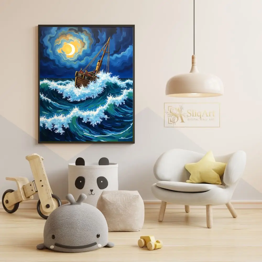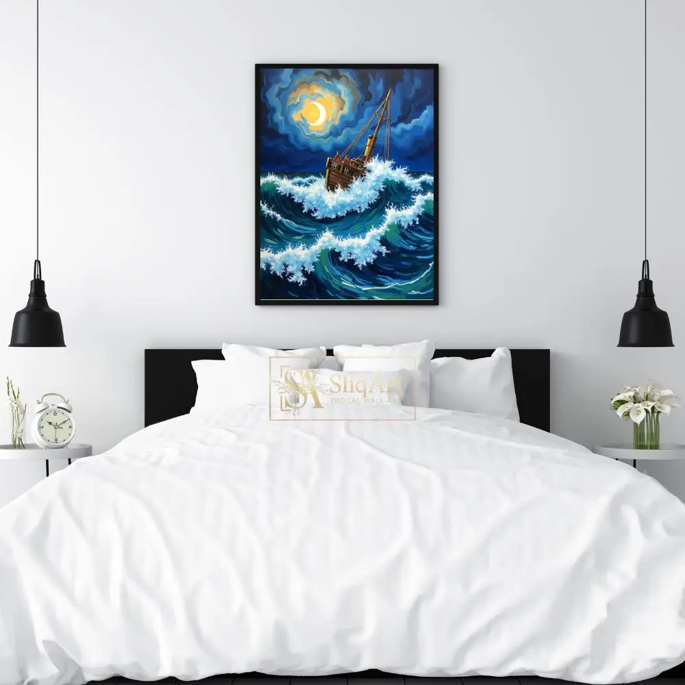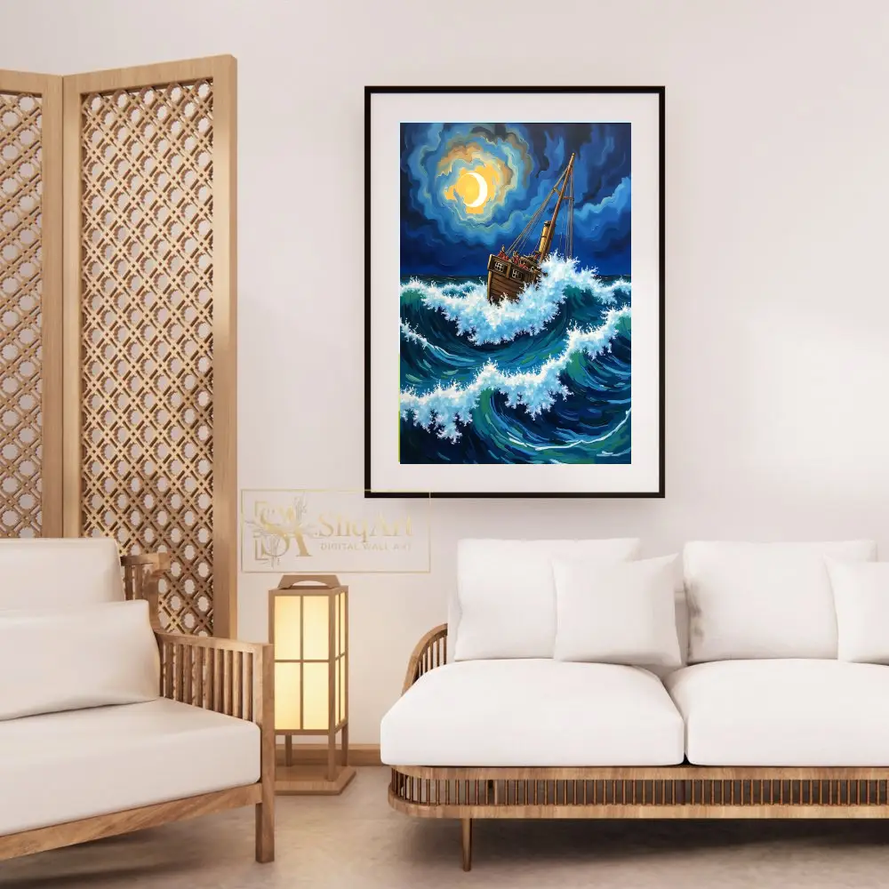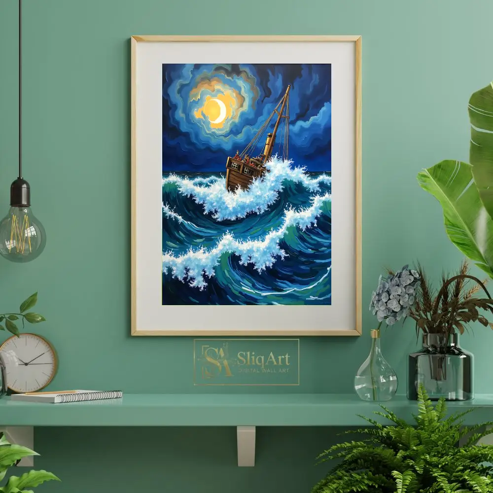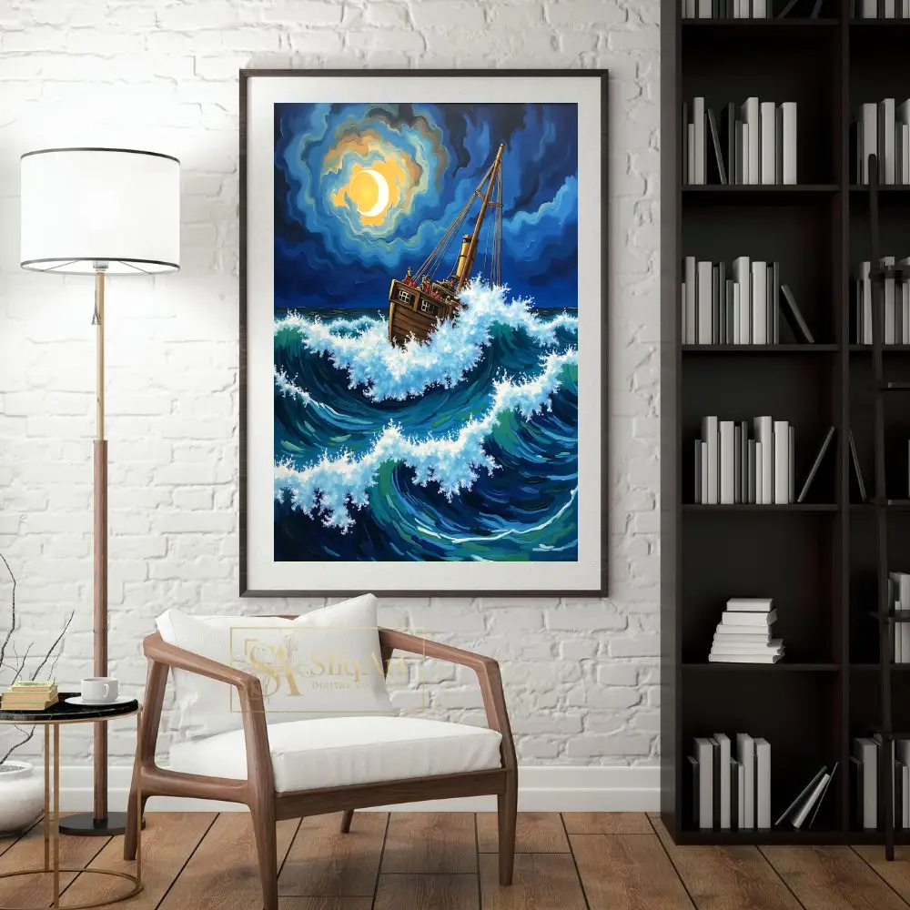 This stunning canvas print captures a dramatic nautical scene, heavily inspired by the swirling, emotive style of Post-Impressionism. A wooden ship braves turbulent, crashing waves under a radiant, crescent-shaped celestial body that illuminates the dark, indigo sky.