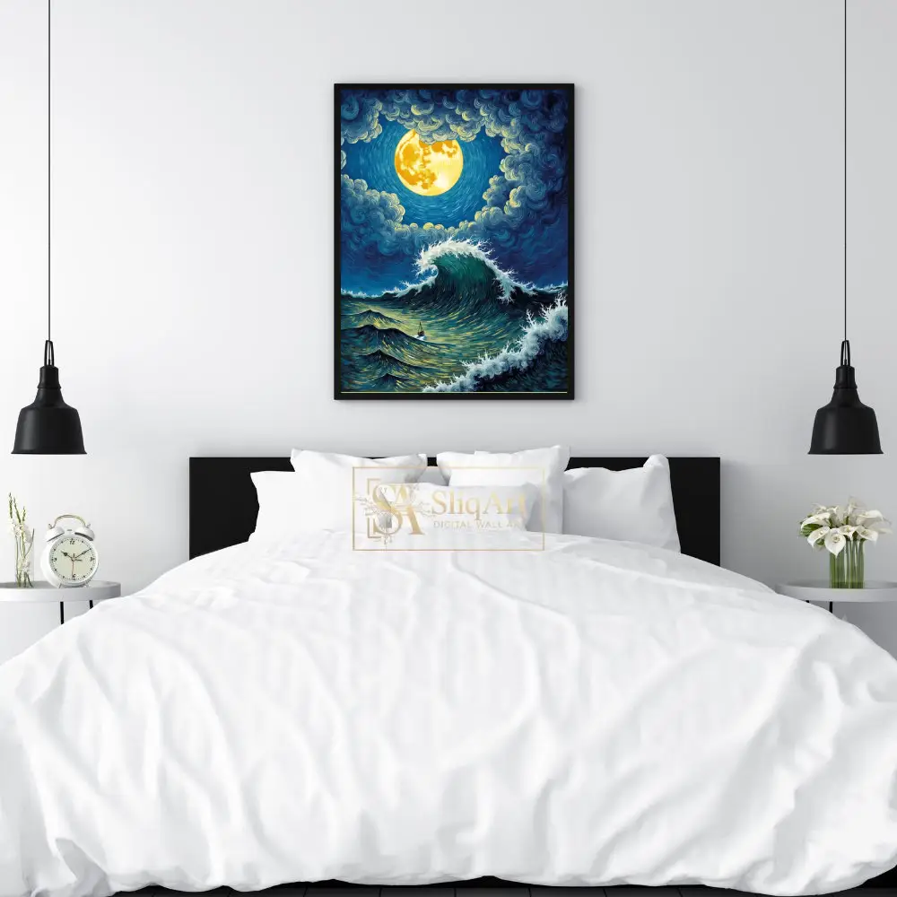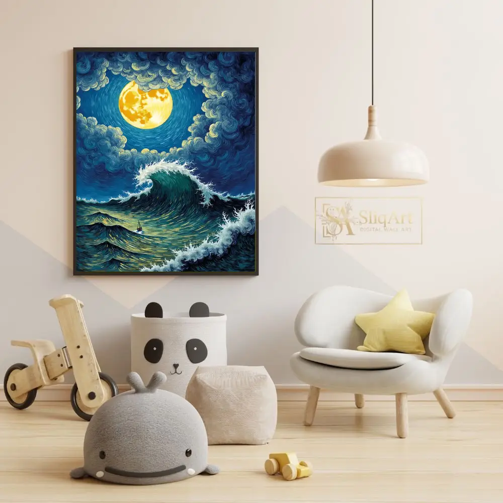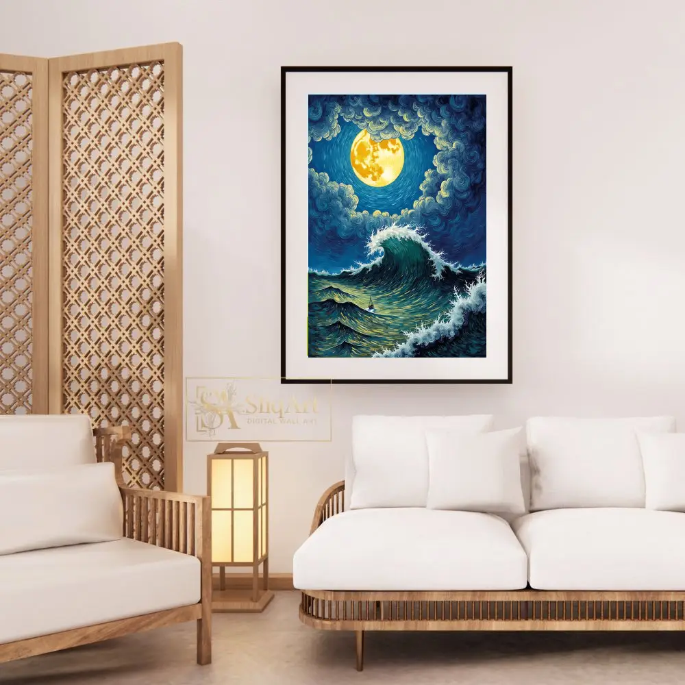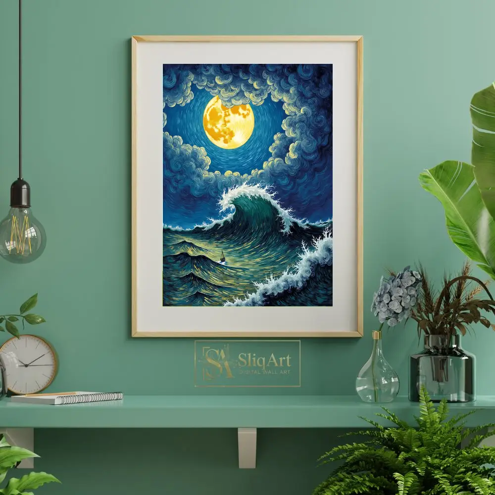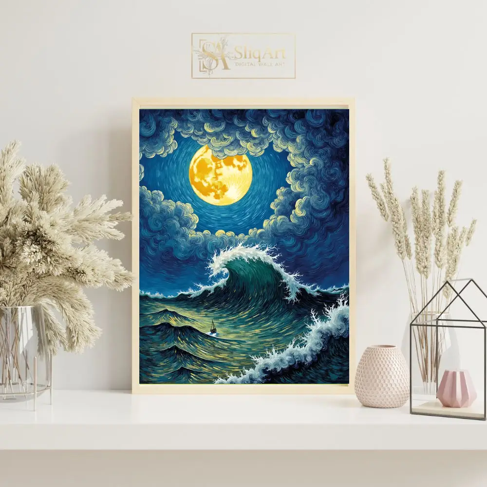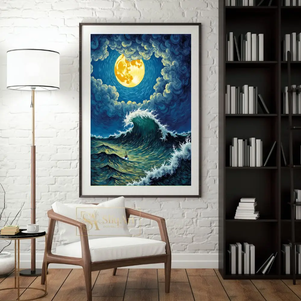 Experience the breathtaking intersection of celestial beauty and maritime power with this Van Gogh-inspired canvas art. The piece features a brilliant, oversized golden moon framed by swirling, atmospheric clouds, casting a luminous glow over a turbulent sea.