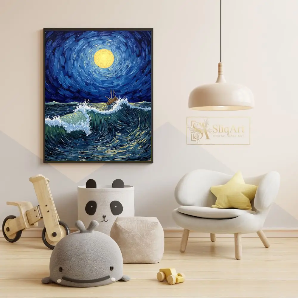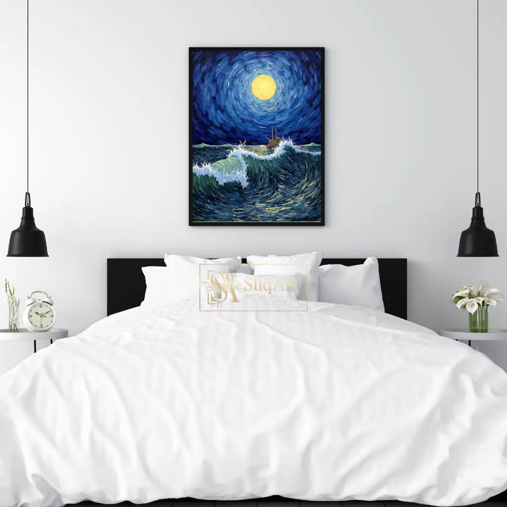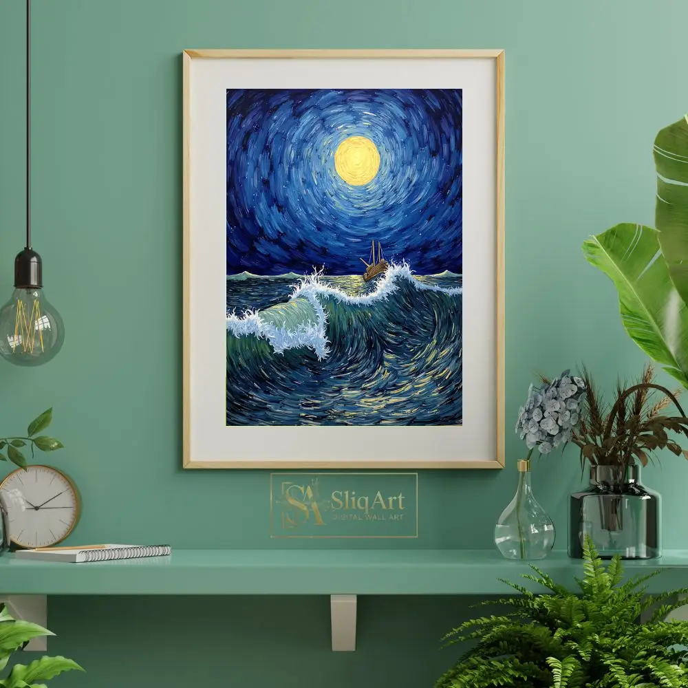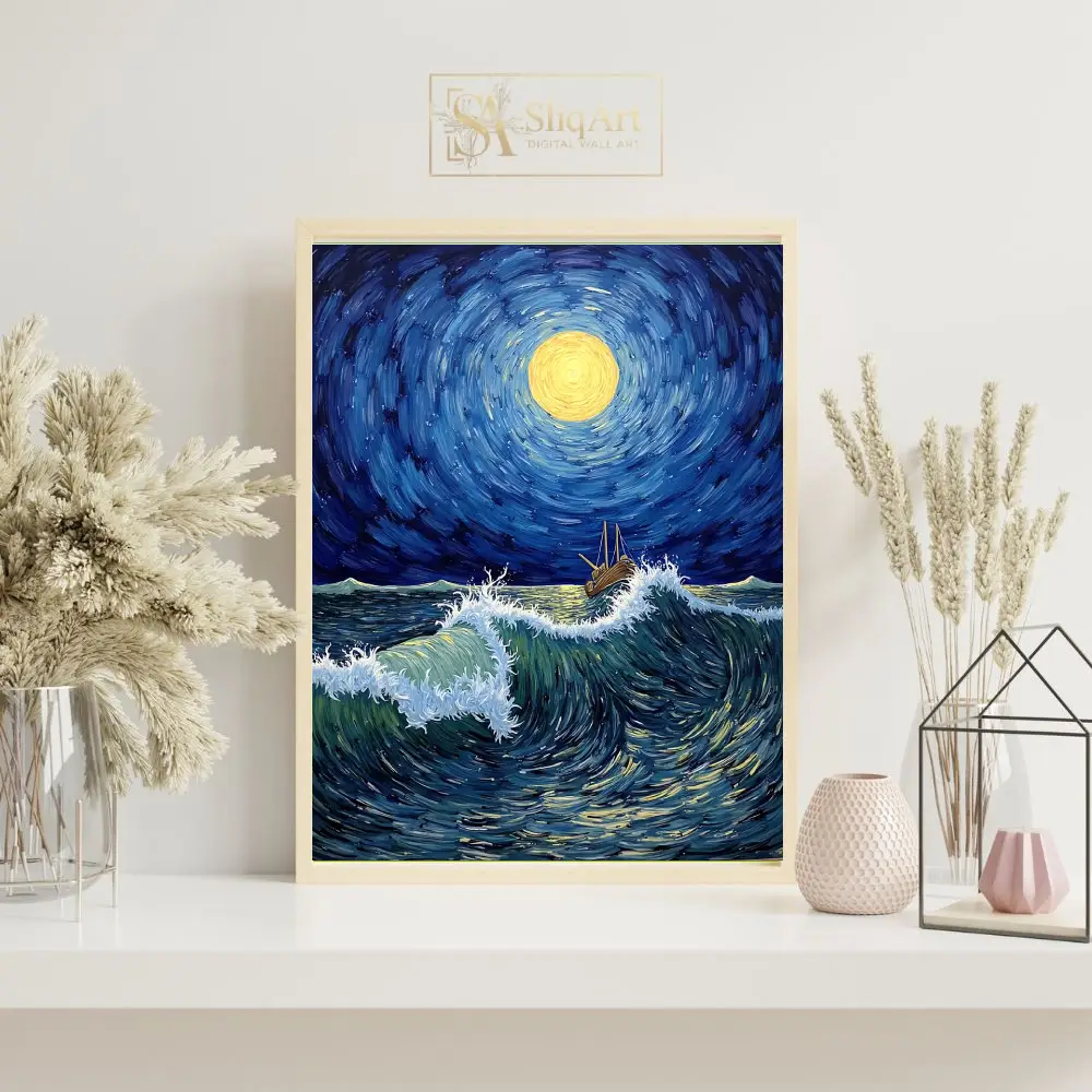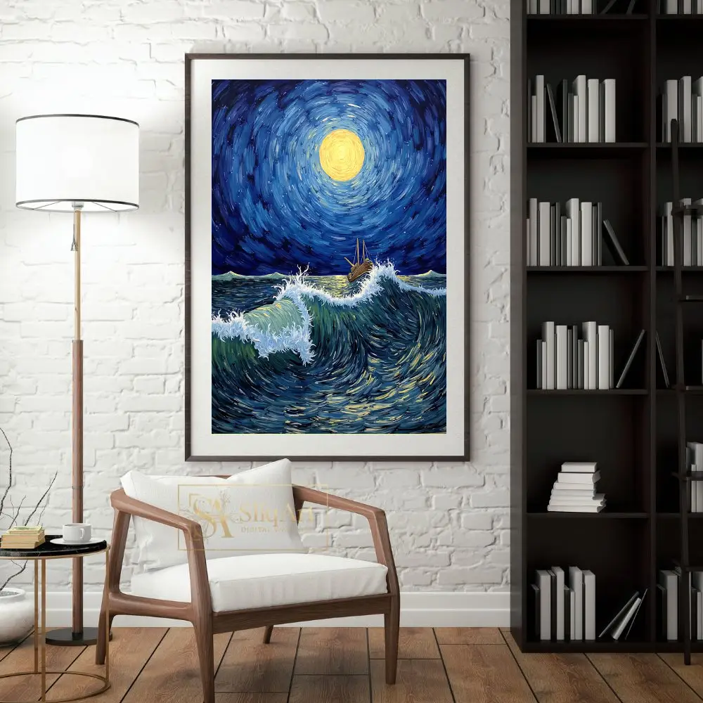 Experience the raw power and ethereal beauty of the ocean with ‘Celestial Voyage.’ This masterfully crafted canvas print draws heavy inspiration from Post-Impressionist techniques, utilizing thick, swirling brushstrokes to create a sense of rhythm and flow.