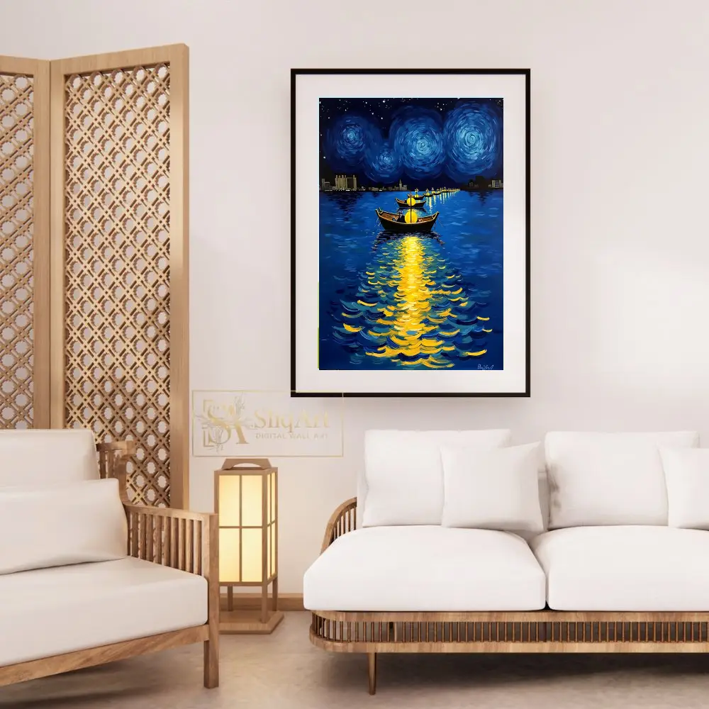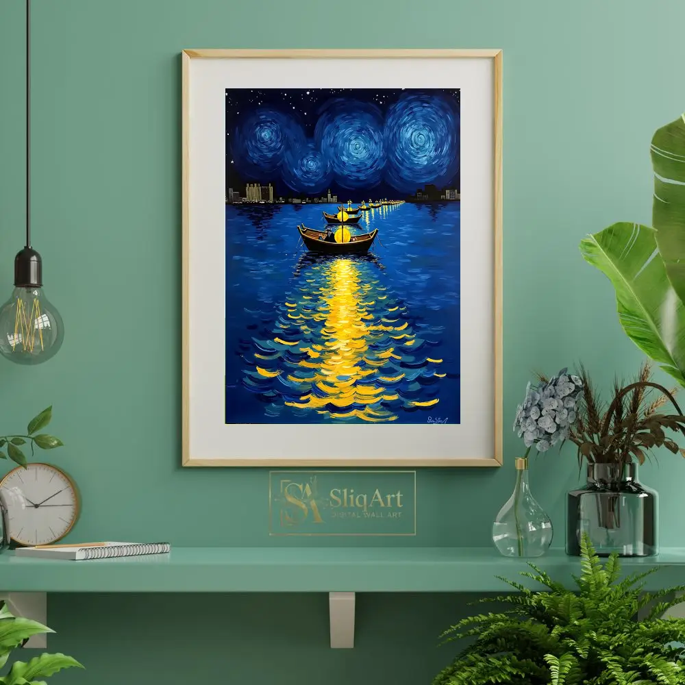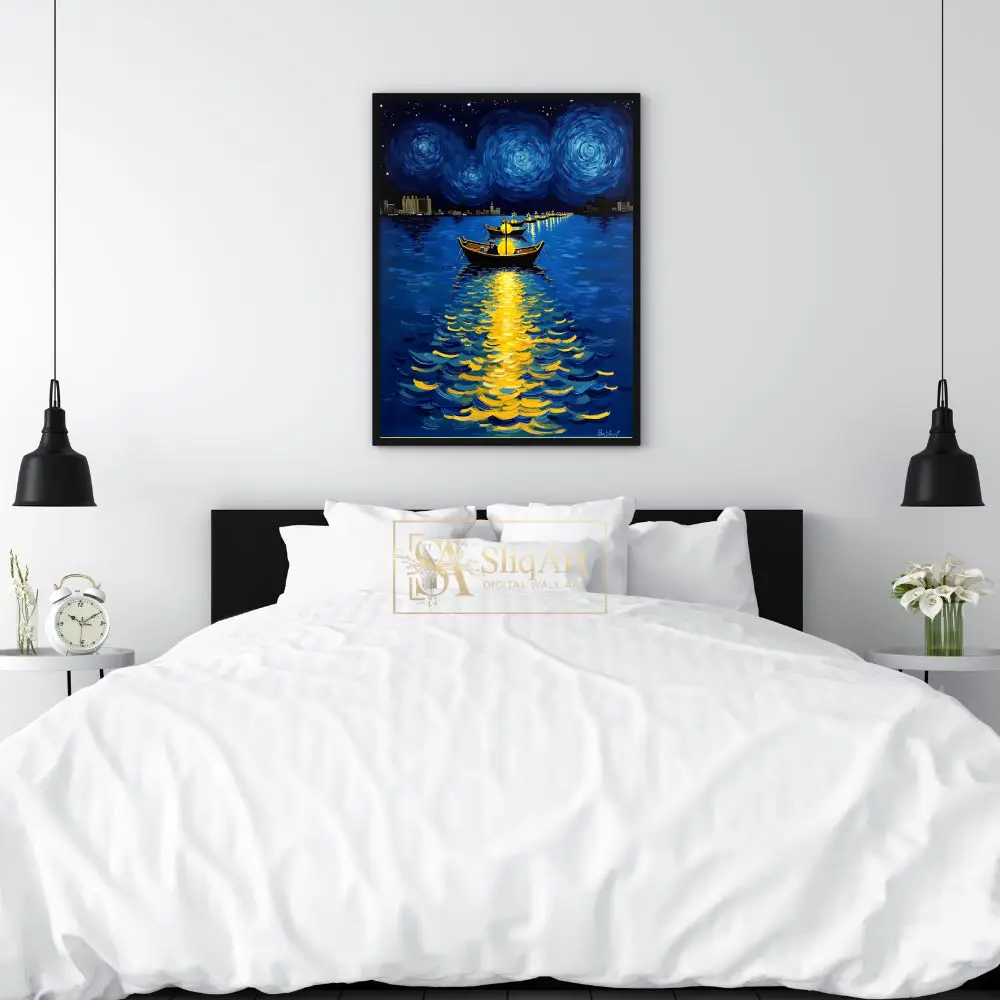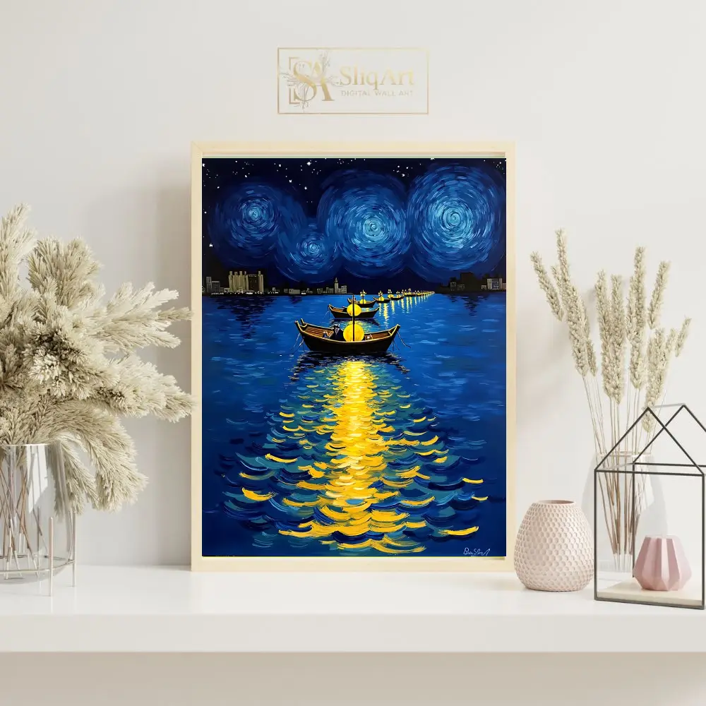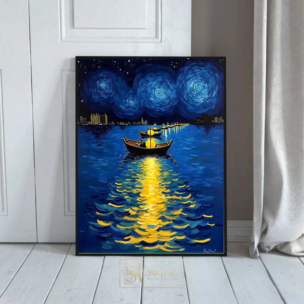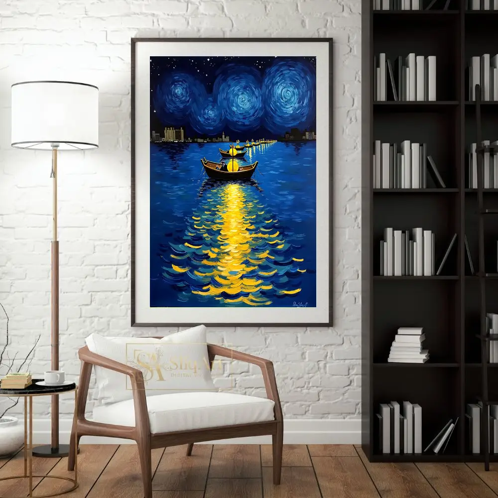 Heavily influenced by the impasto techniques of Van Gogh, this artwork features swirling celestial patterns in the night sky and vibrant reflections of golden light dancing on the deep blue water. The distant city skyline provides a modern silhouette against the timeless beauty of the cosmos, creating a perfect balance of nocturnal energy and peace.