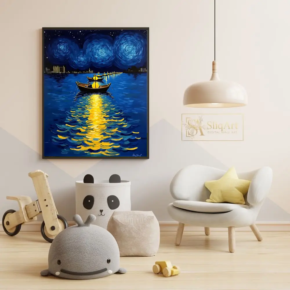 Experience the magical tranquility of ‘Starry Night Voyage,’ a stunning Post-Impressionist piece that captures a fleet of lantern-lit boats gliding across a shimmering bay.
