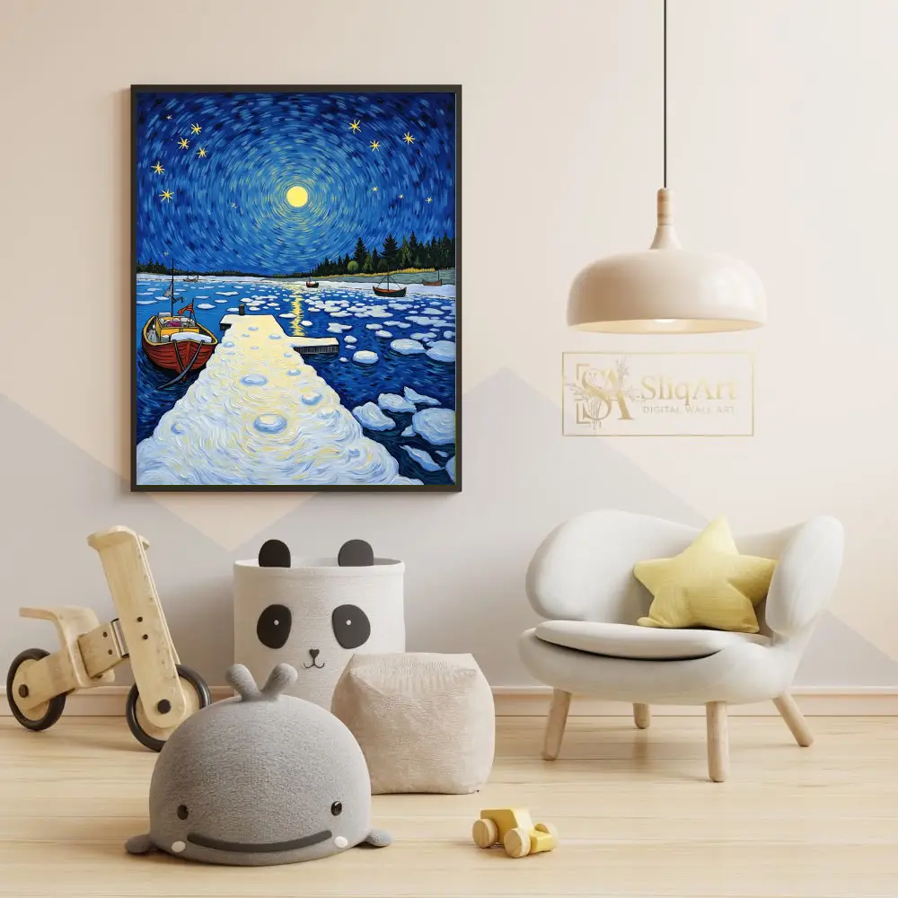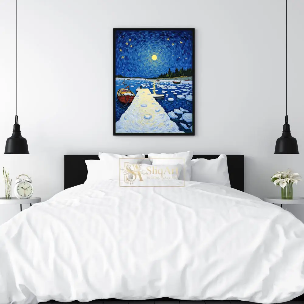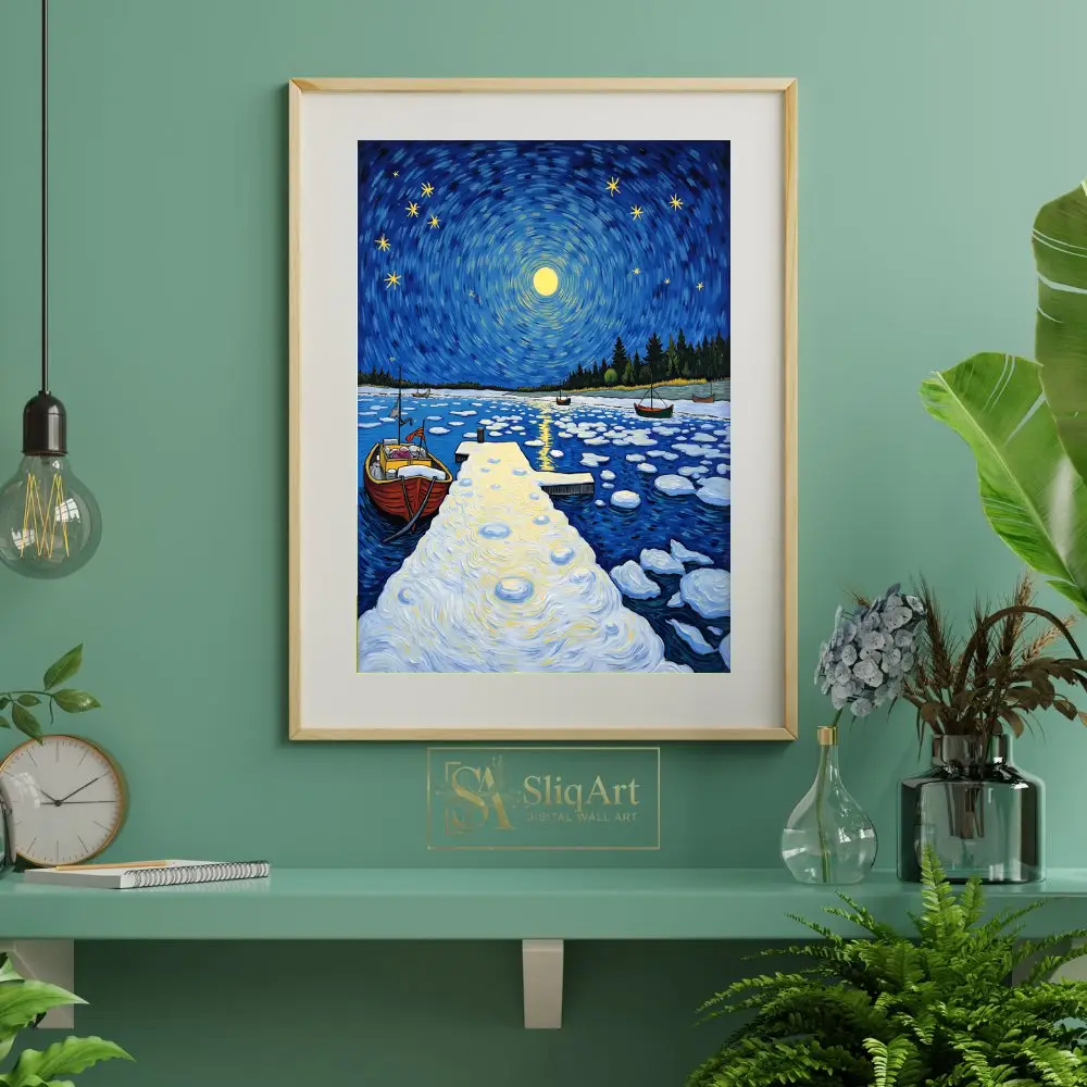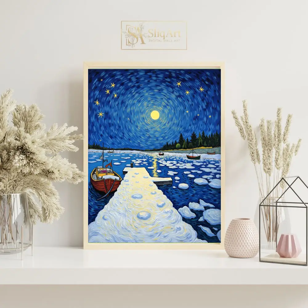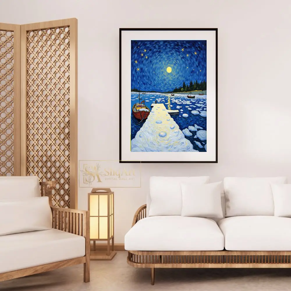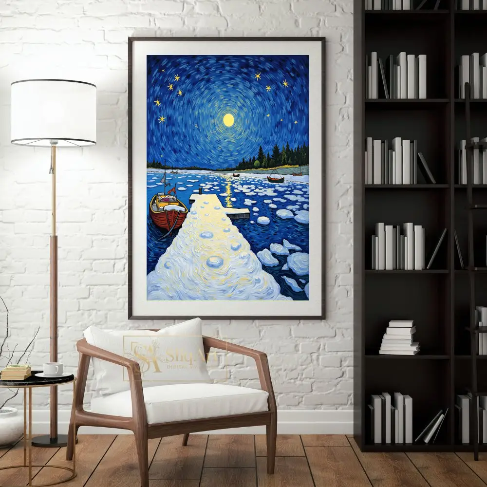 This stunning post-impressionist masterpiece captures a tranquil winter night at a secluded harbor. Inspired by the expressive brushwork of Van Gogh, the piece features a mesmerizing swirling sky where a radiant full moon and twinkling stars dance above a frozen landscape.
