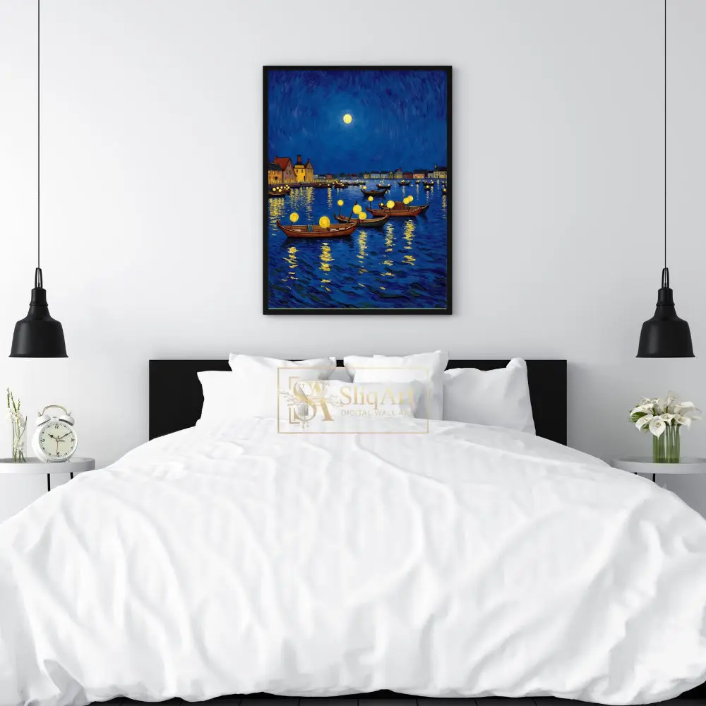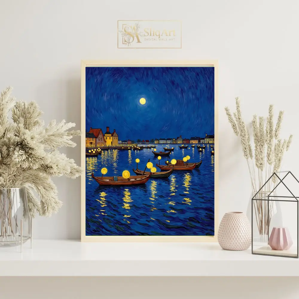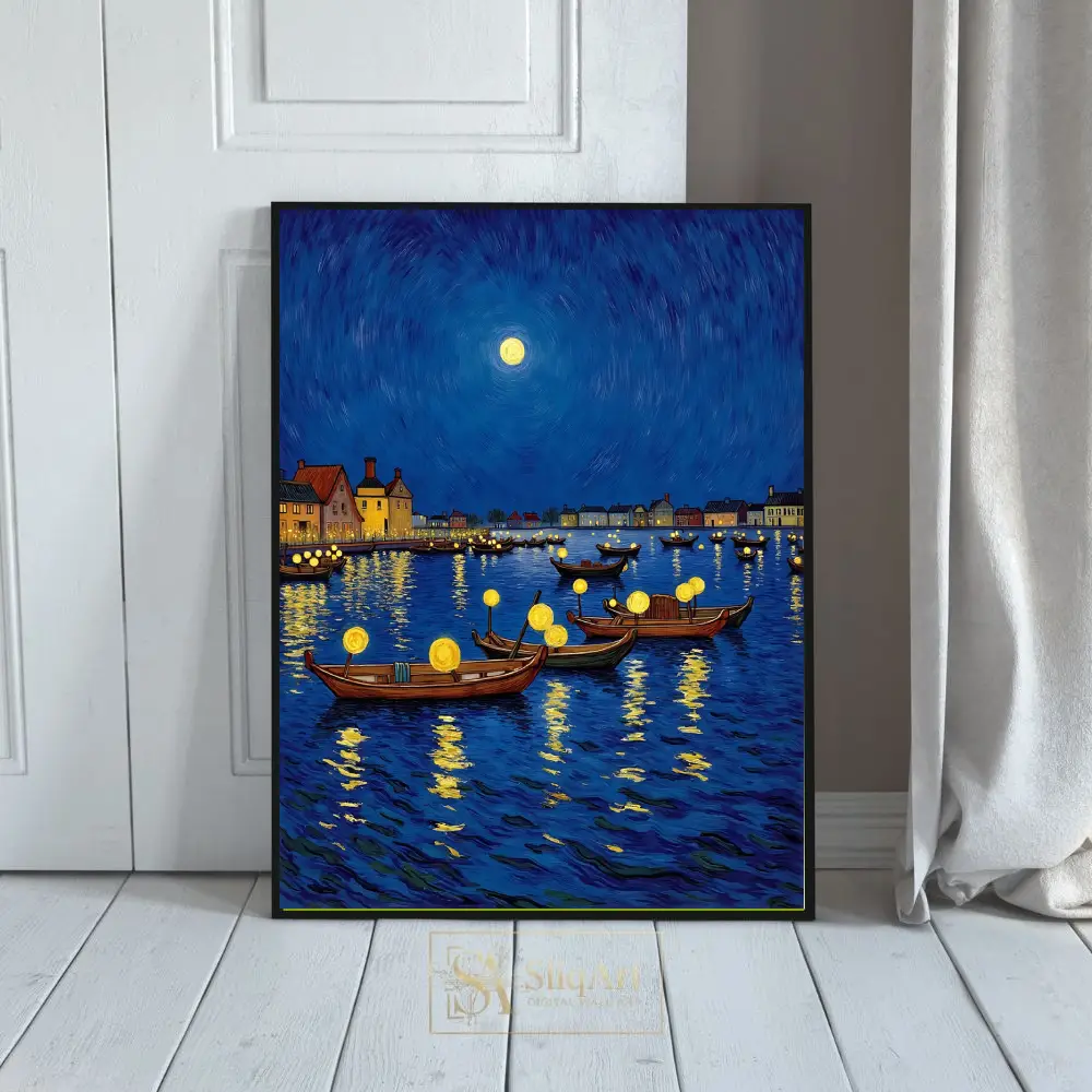 Transform your space with this breathtaking Post-Impressionist masterpiece, heavily inspired by the swirling skies and vibrant nightscapes of Vincent van Gogh. This artwork captures a serene harbor scene where traditional wooden boats, illuminated by glowing golden lanterns, bob gently on deep blue waters.