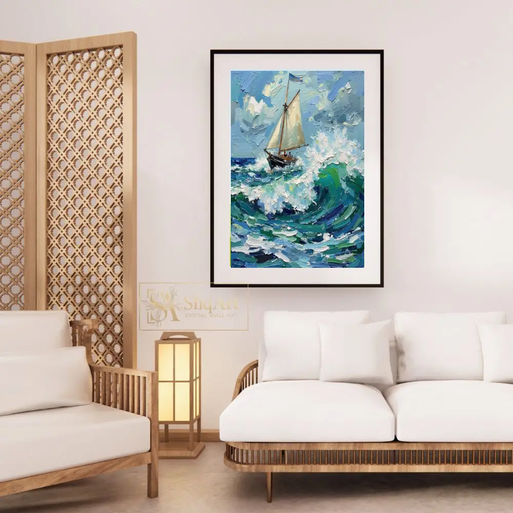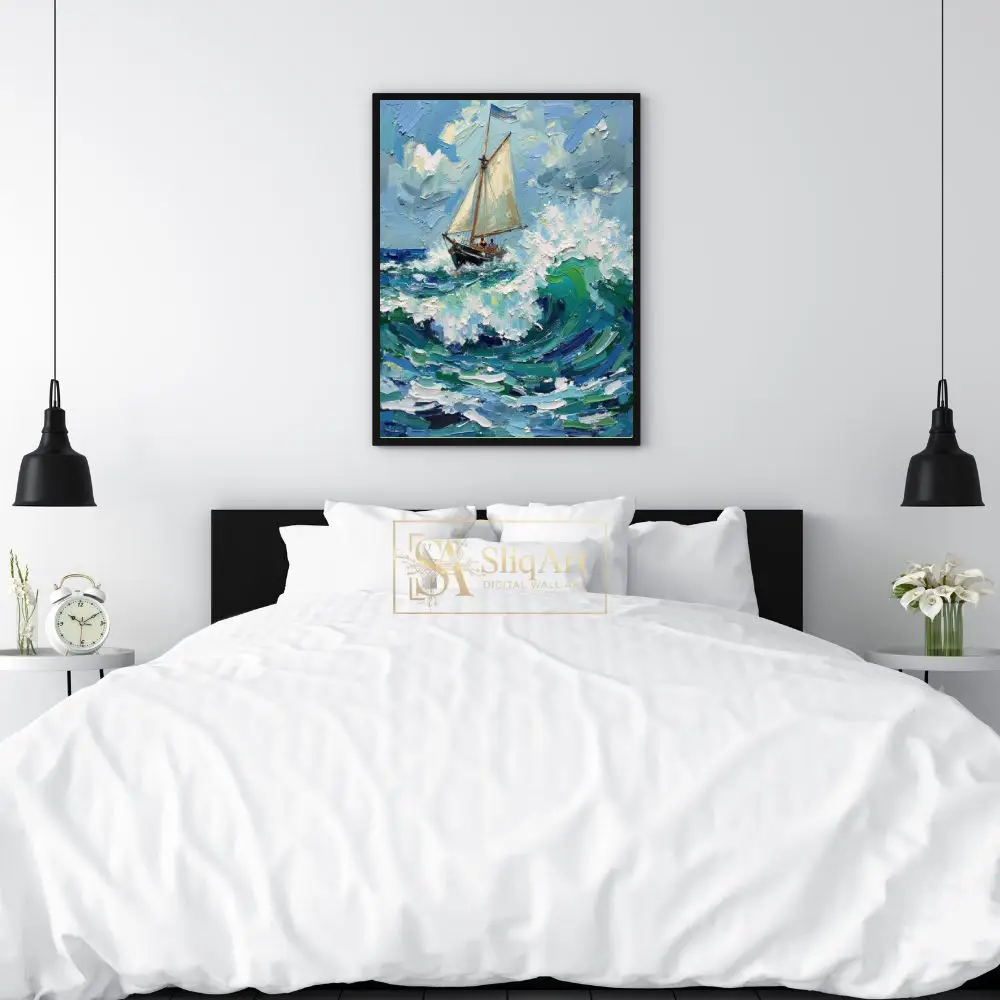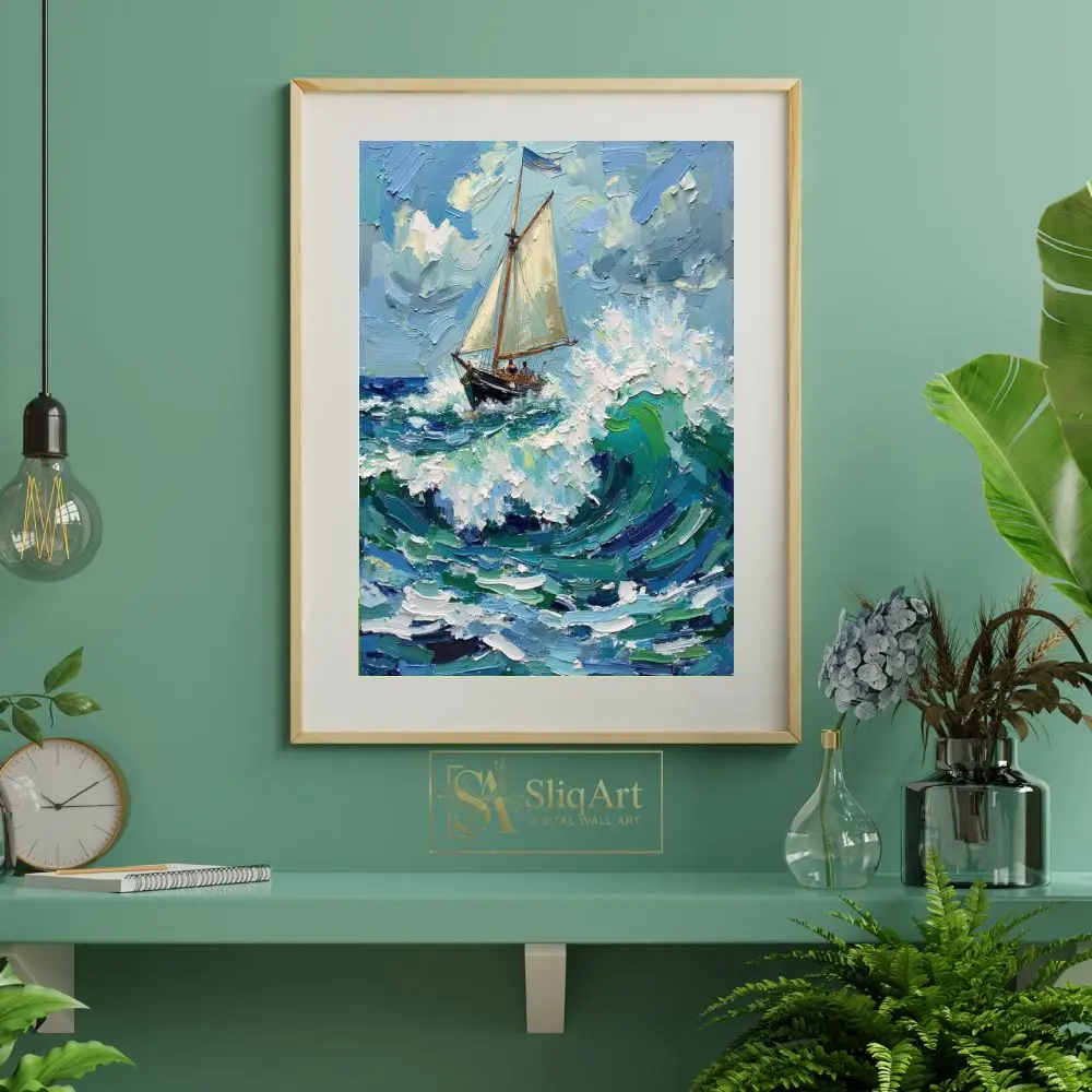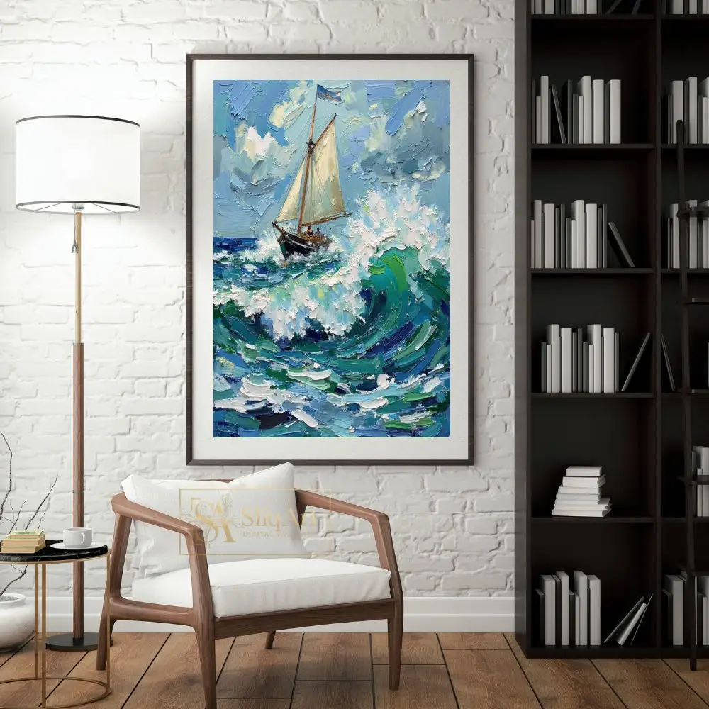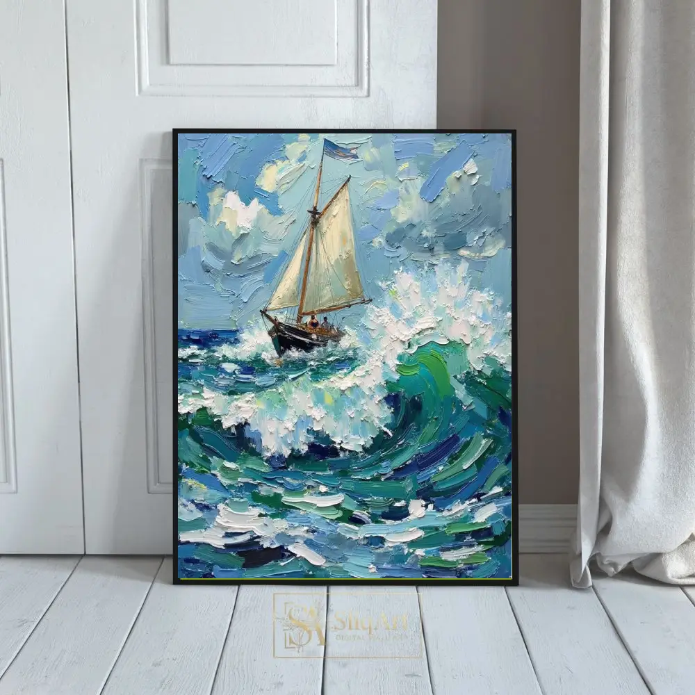 Capture the exhilarating spirit of the high seas with this striking impasto oil painting. The artwork features a resilient sailboat navigating through towering, textured waves of teal and deep blue.