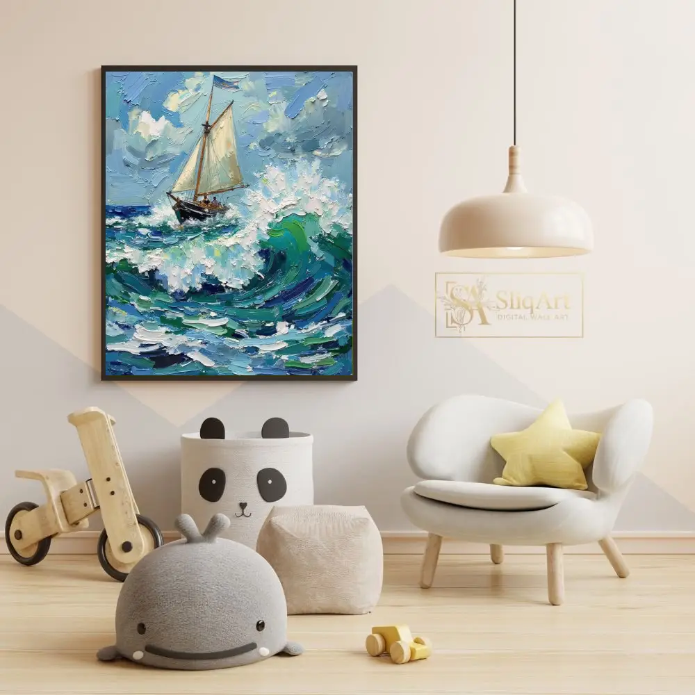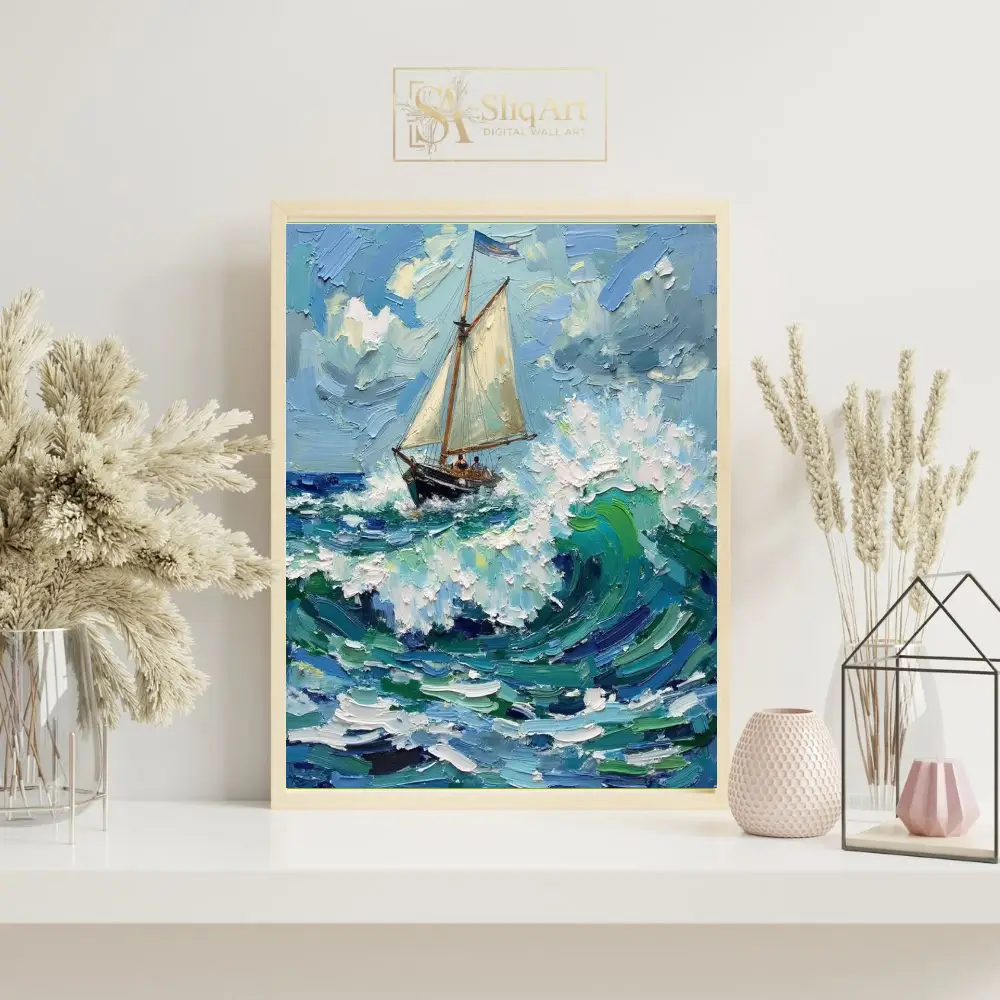 The thick, tactile brushstrokes create a palpable sense of movement and energy, while the bright, clouded sky provides a hopeful contrast. This piece is a masterclass in nautical impressionism, expertly utilizing light and texture to bring the ocean’s raw power to life on your walls.