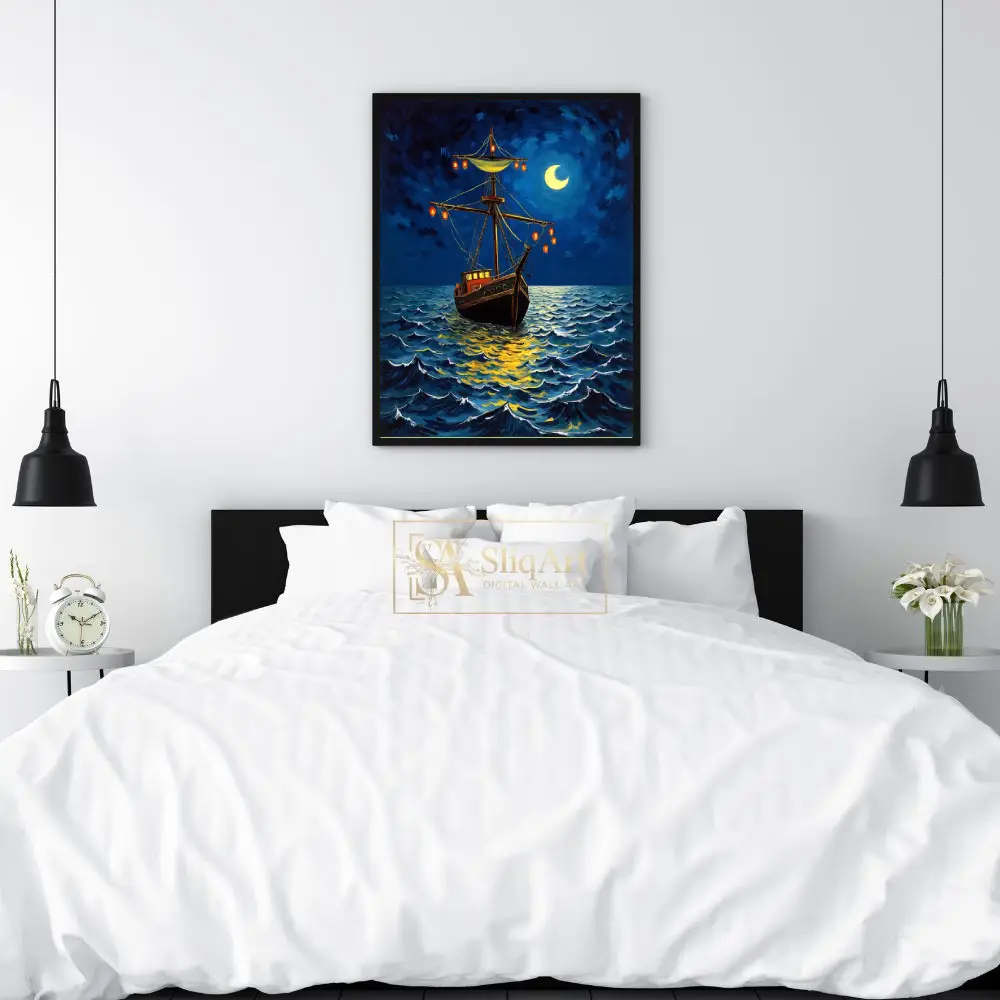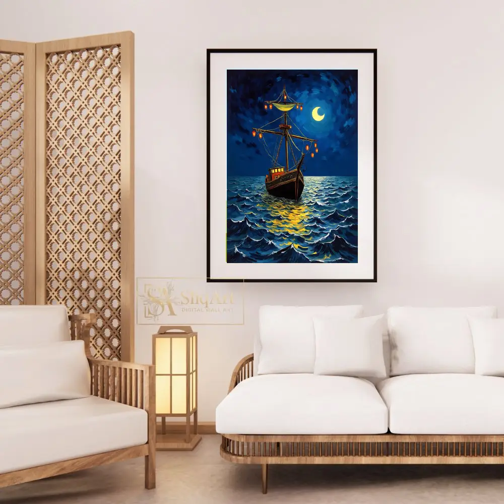 This stunning post-impressionist painting captures the essence of a tranquil yet adventurous night at sea. Inspired by the expressive, swirling brushwork of masters like Van Gogh, the artwork features a majestic wooden ship adorned with glowing orange lanterns.