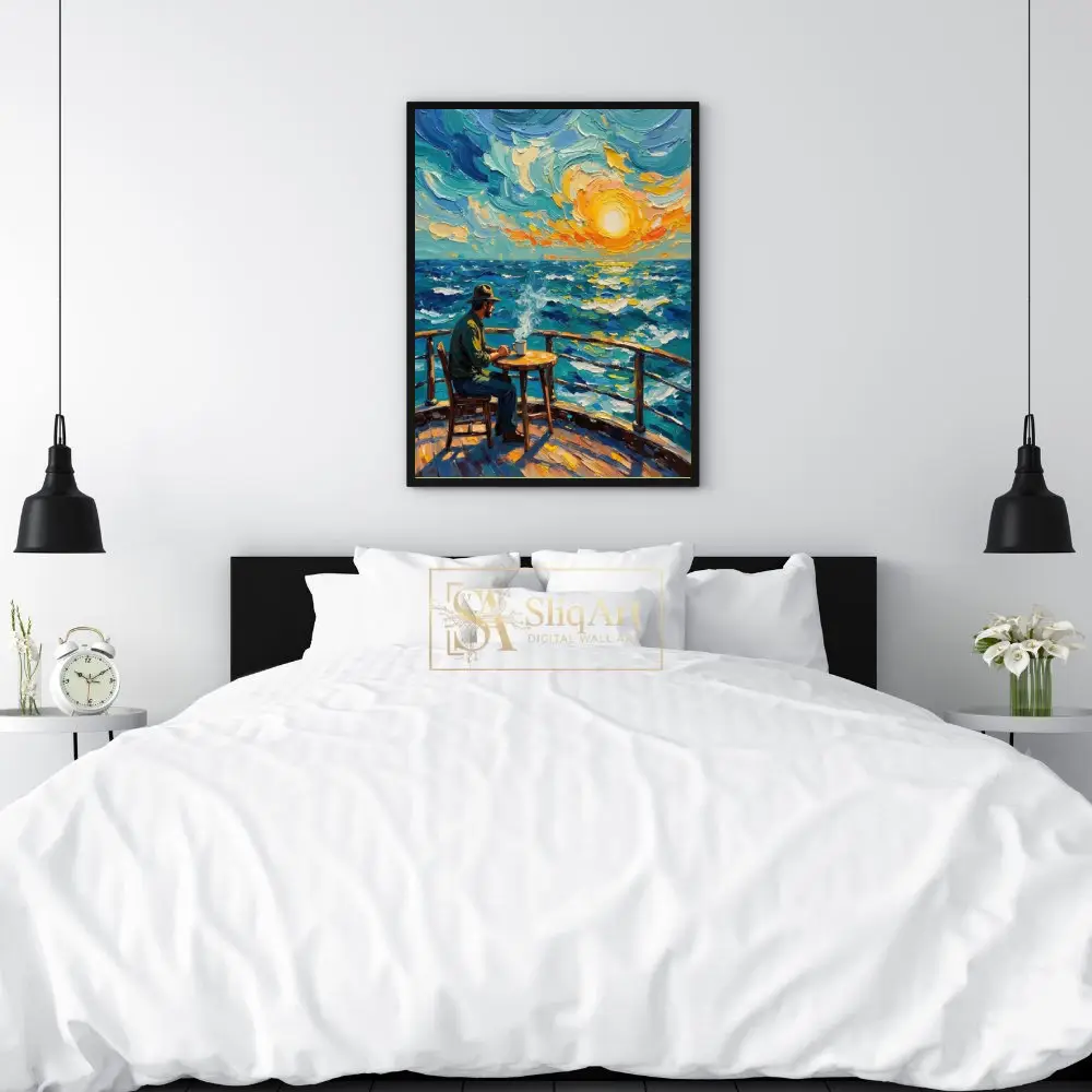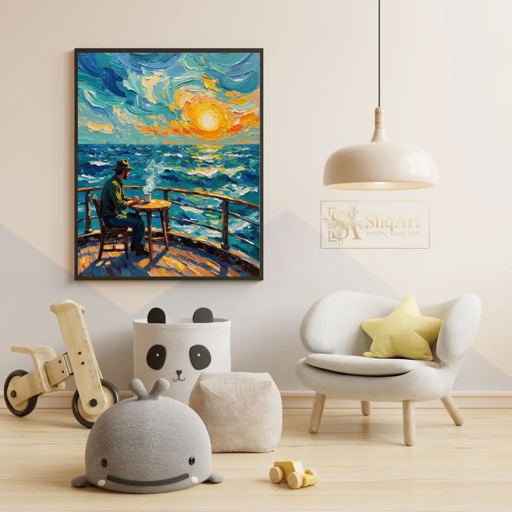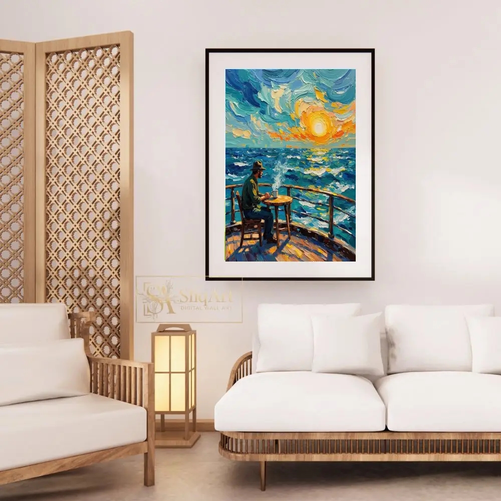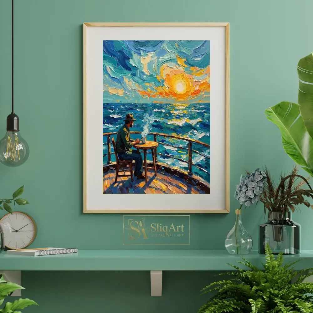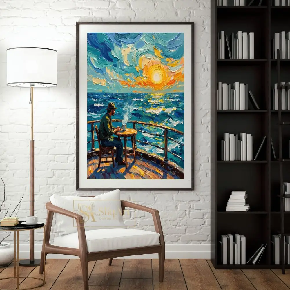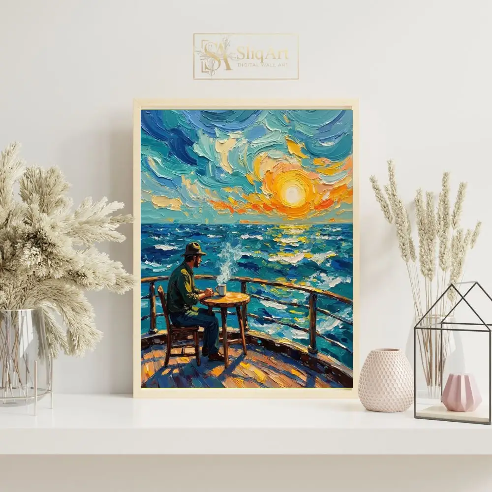 Experience the tranquility of a morning at sea with this expressive impasto painting. The artwork depicts a man in a hat seated at a small wooden table on a ship’s deck, quietly observing a breathtaking sunrise.