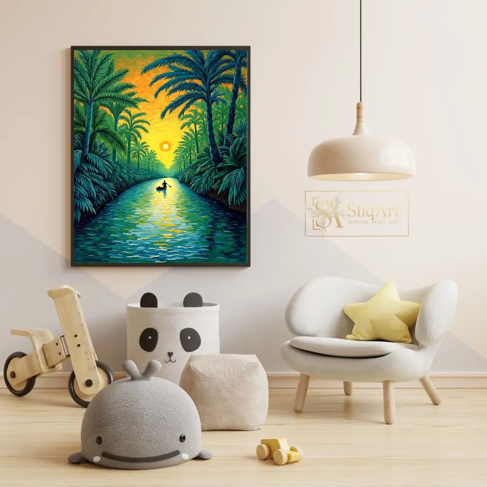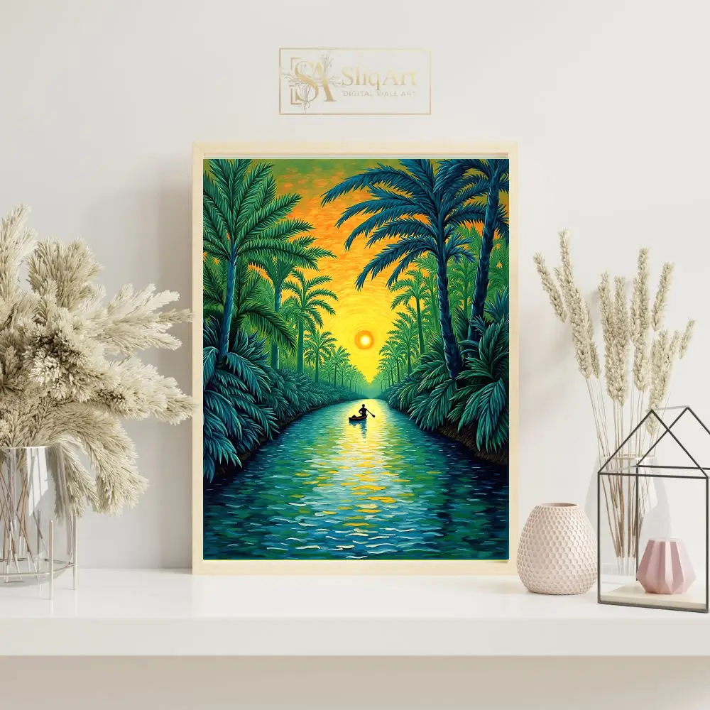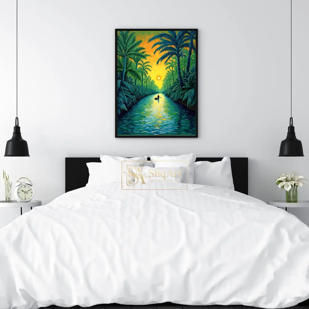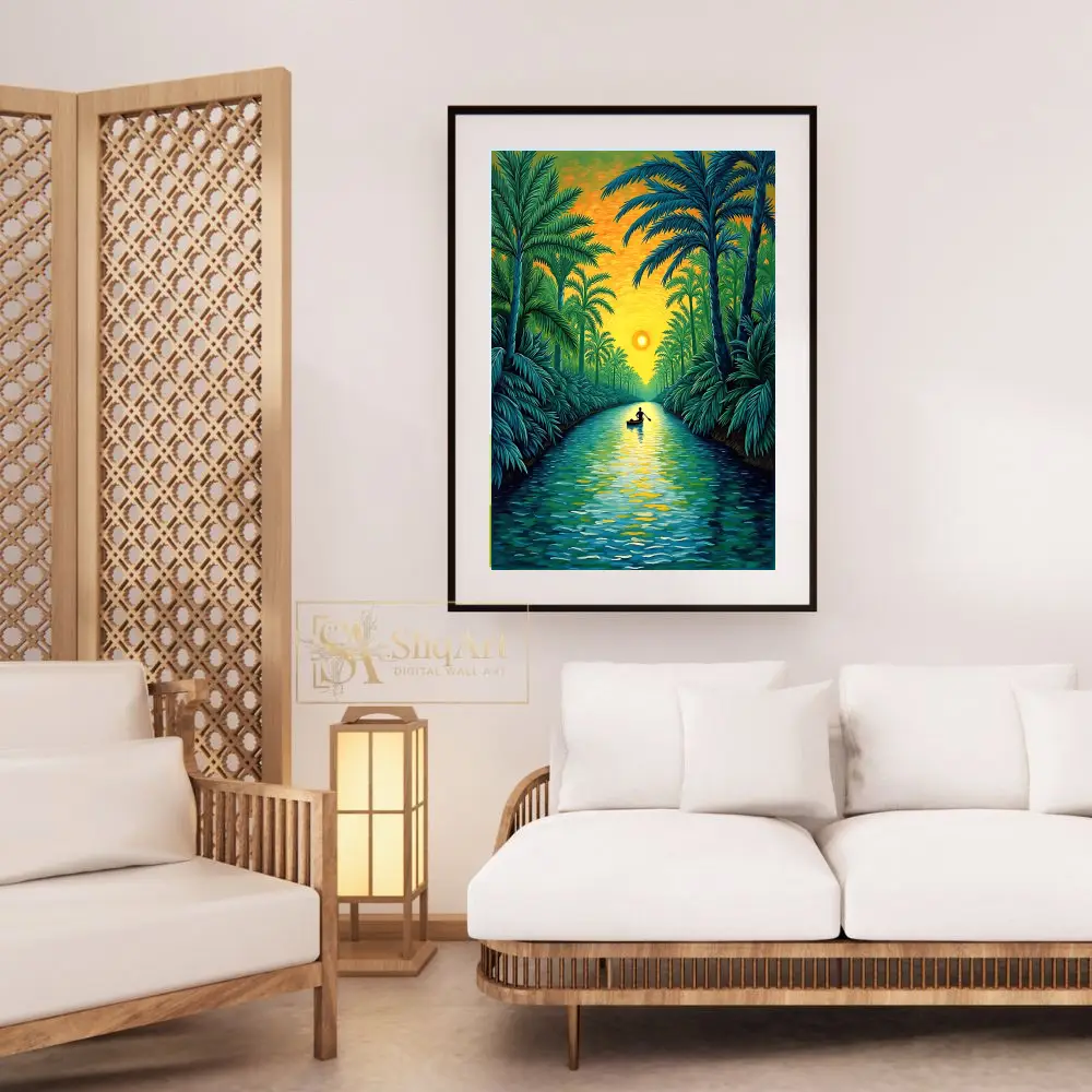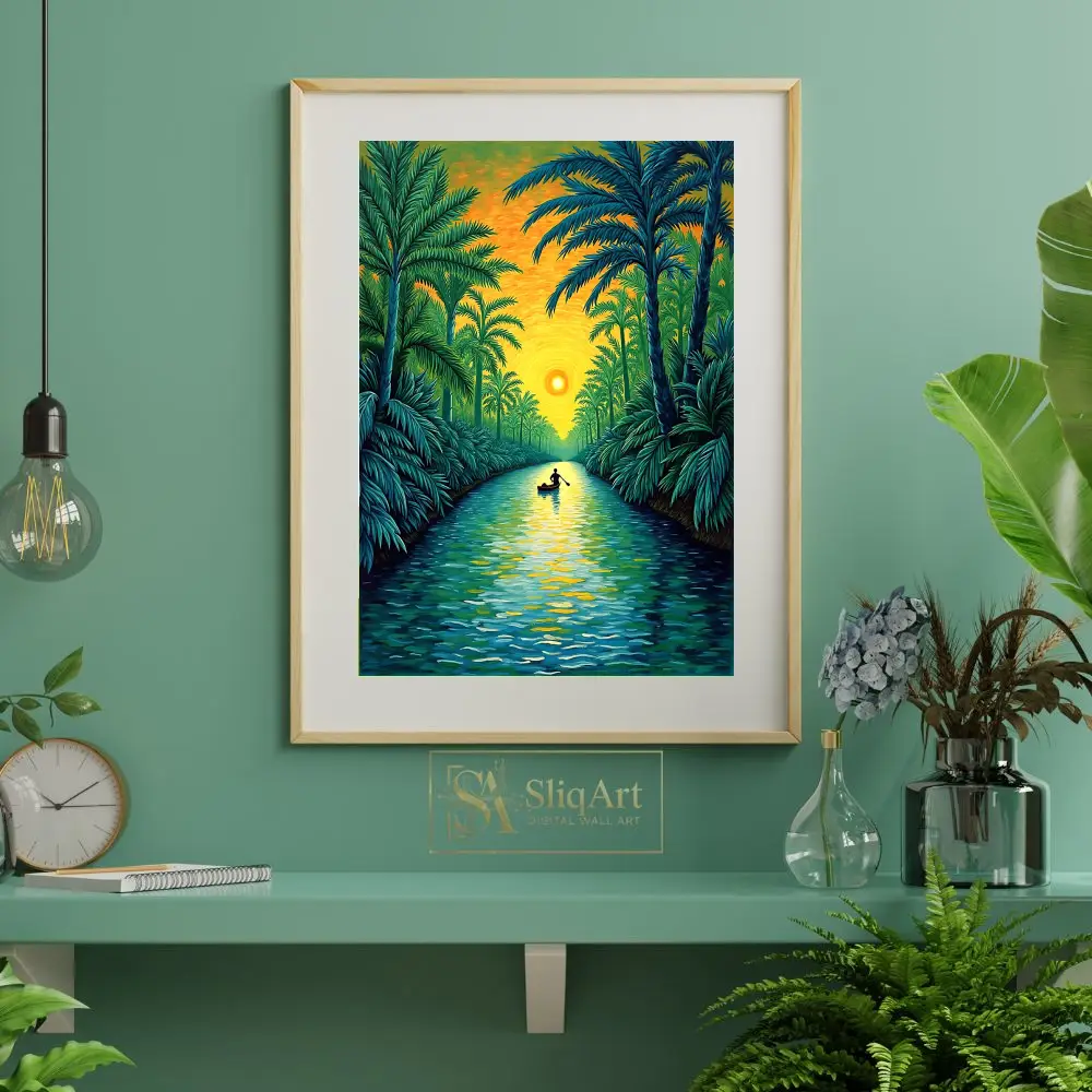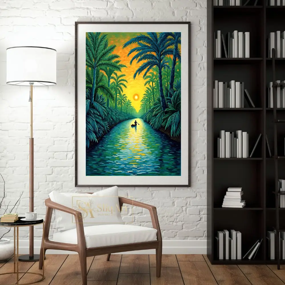 Experience the tranquility of a tropical dusk with this captivating impressionist painting. ‘Sunset River Journey’ depicts a lone silhouette rowing through a lush palm-lined waterway, bathed in the radiant glow of a setting sun.