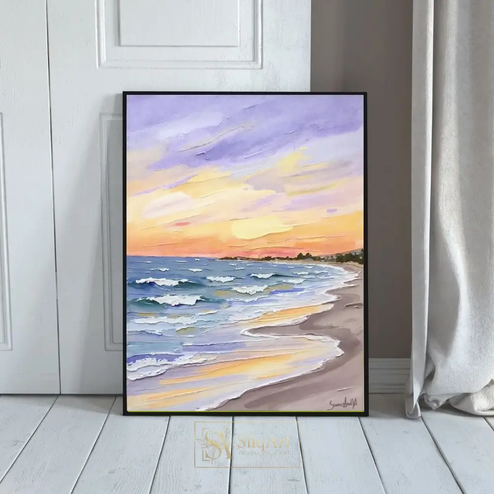 Experience the tranquil beauty of the coast with this exquisite textured oil painting. This piece captures a serene beach at sunset, utilizing a heavy impasto technique that brings the rolling waves and frothy surf to life with tactile depth.