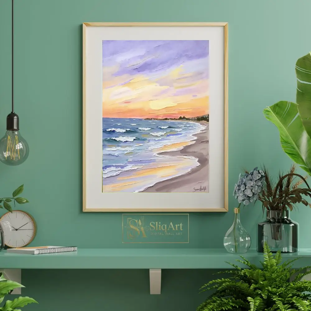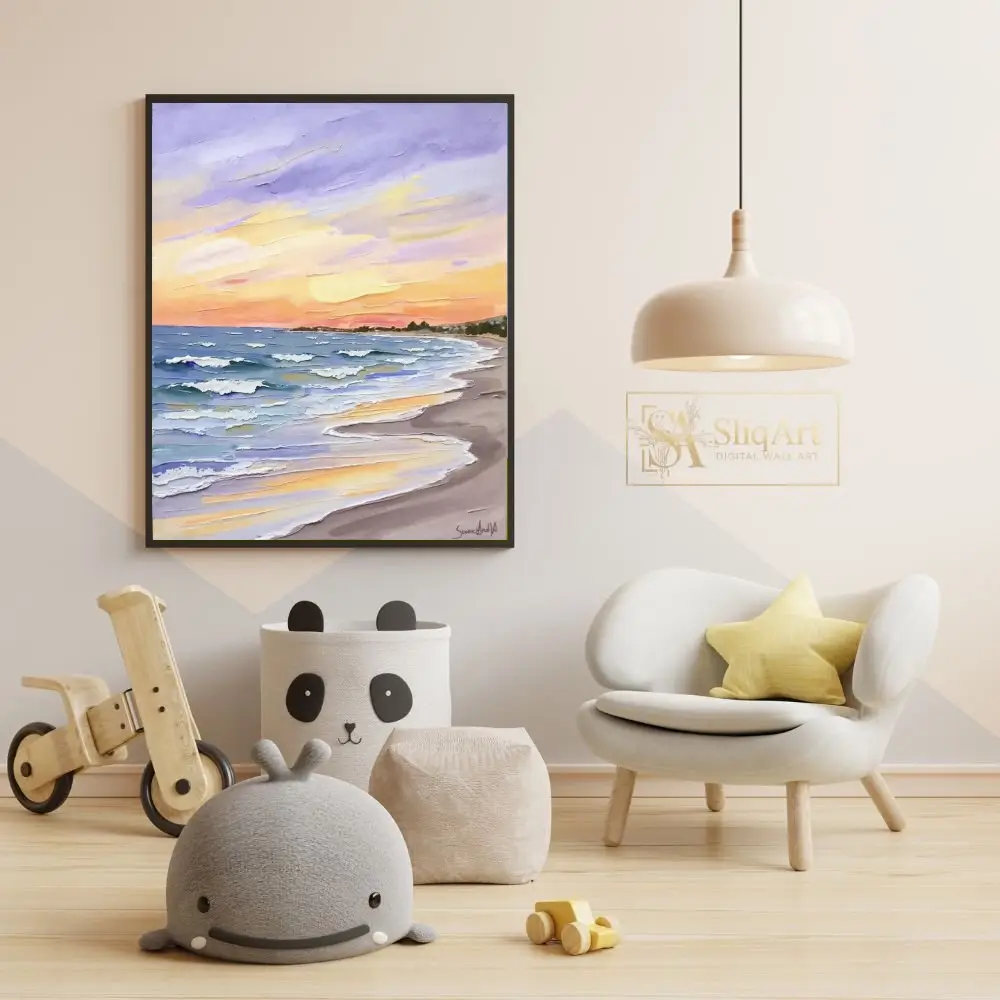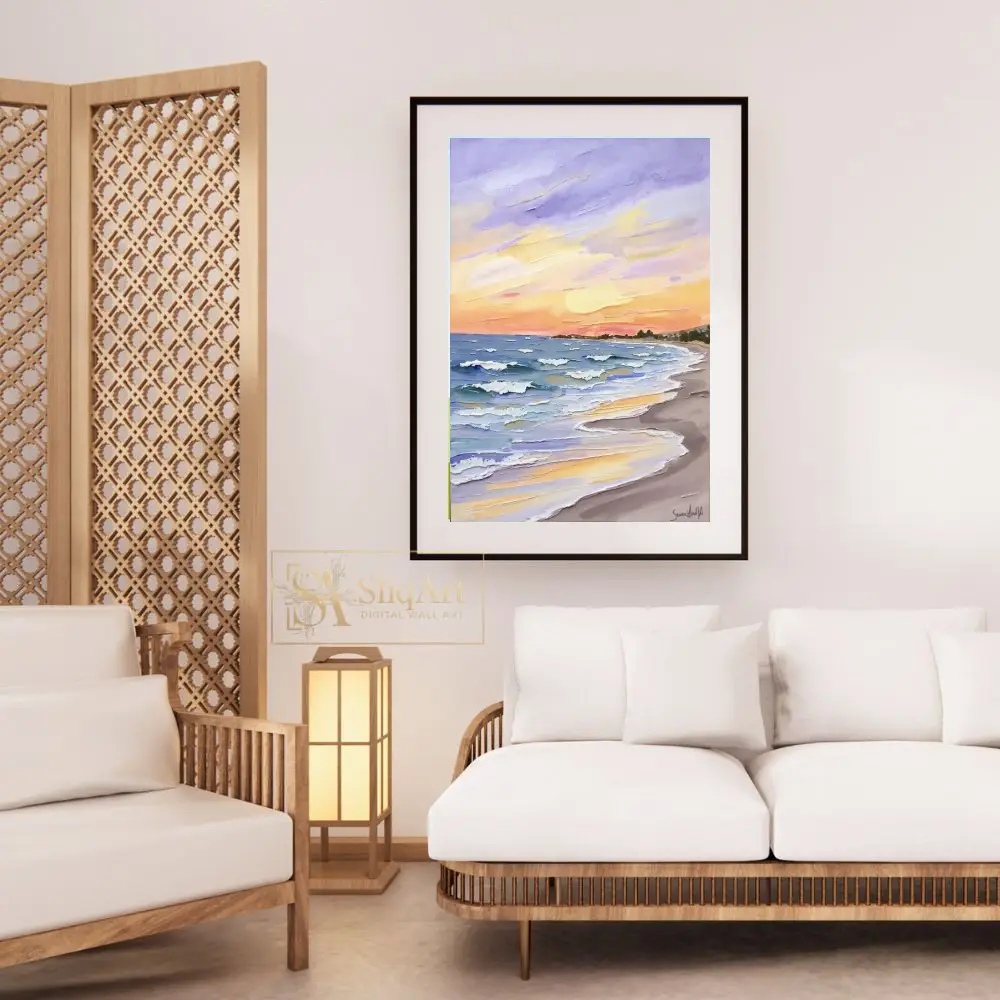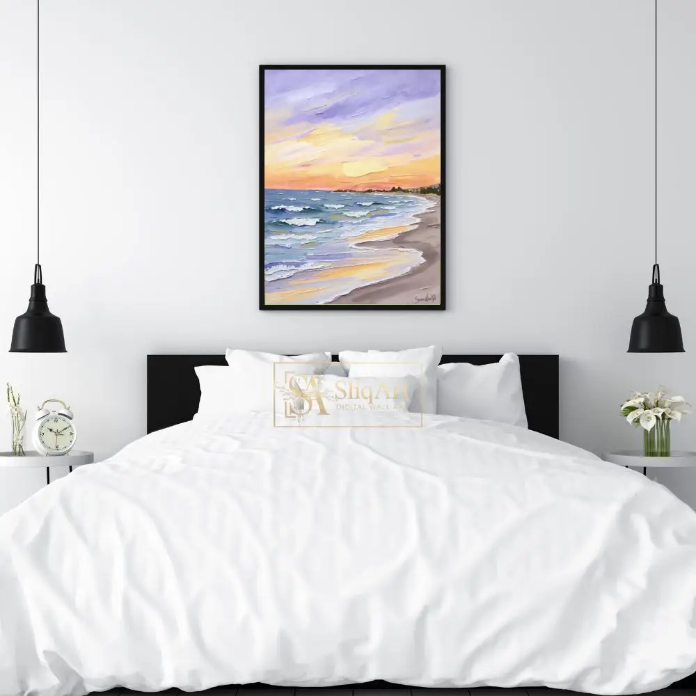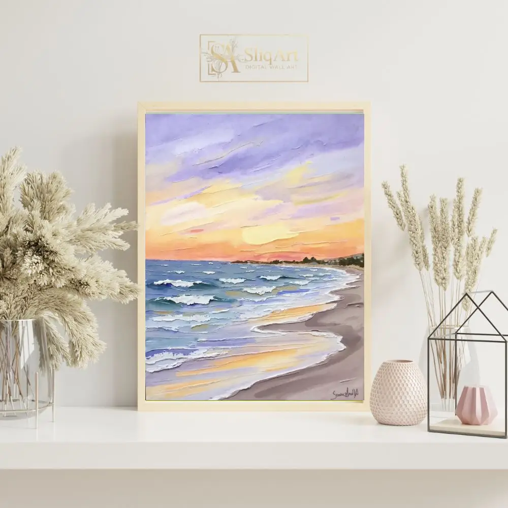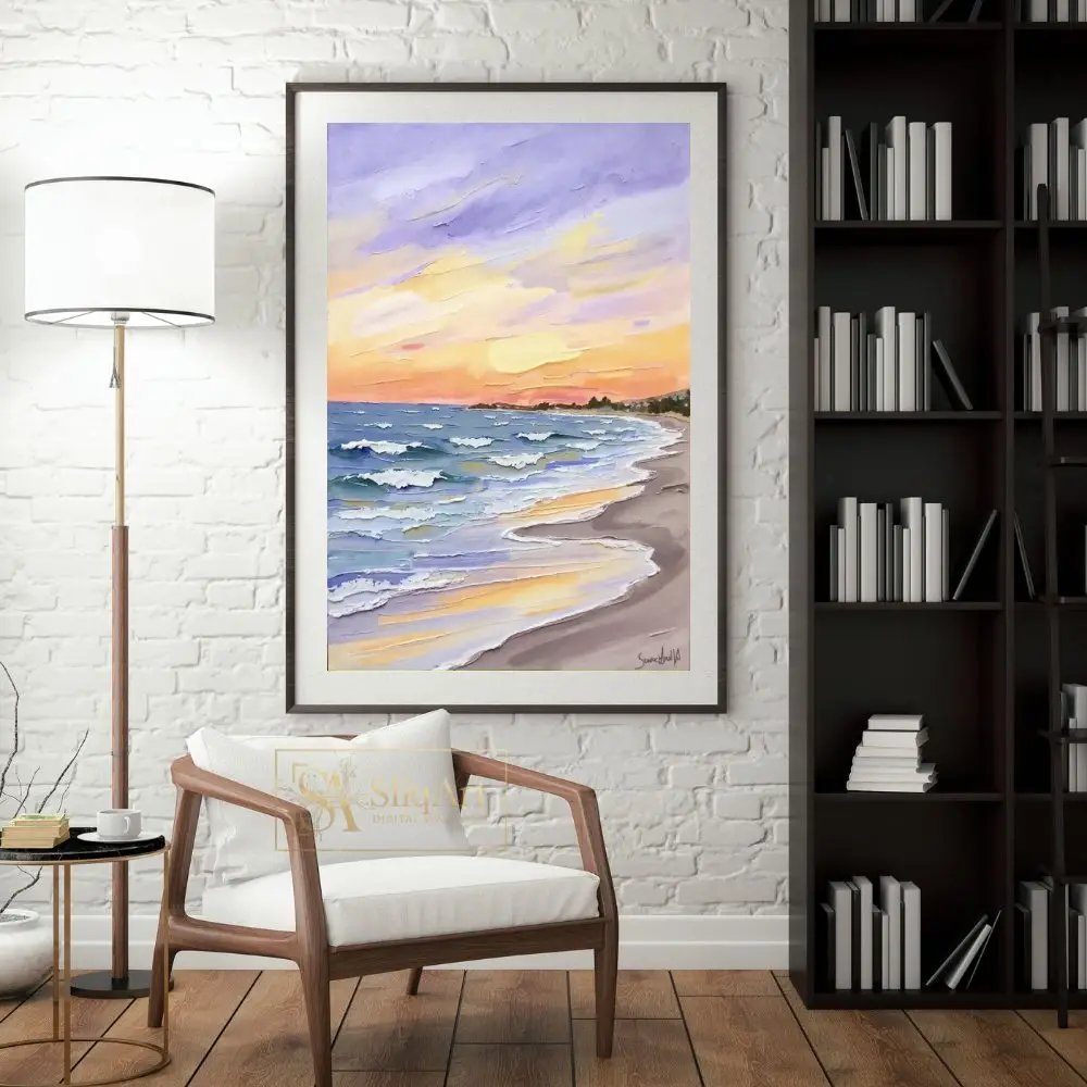 The sky is a masterful blend of lavender, soft oranges, and radiant yellows, reflecting beautifully on the water’s surface. Perfect for those who appreciate the intersection of nature’s calmness and bold, expressive artistry, this canvas adds a sophisticated coastal charm to any interior.
