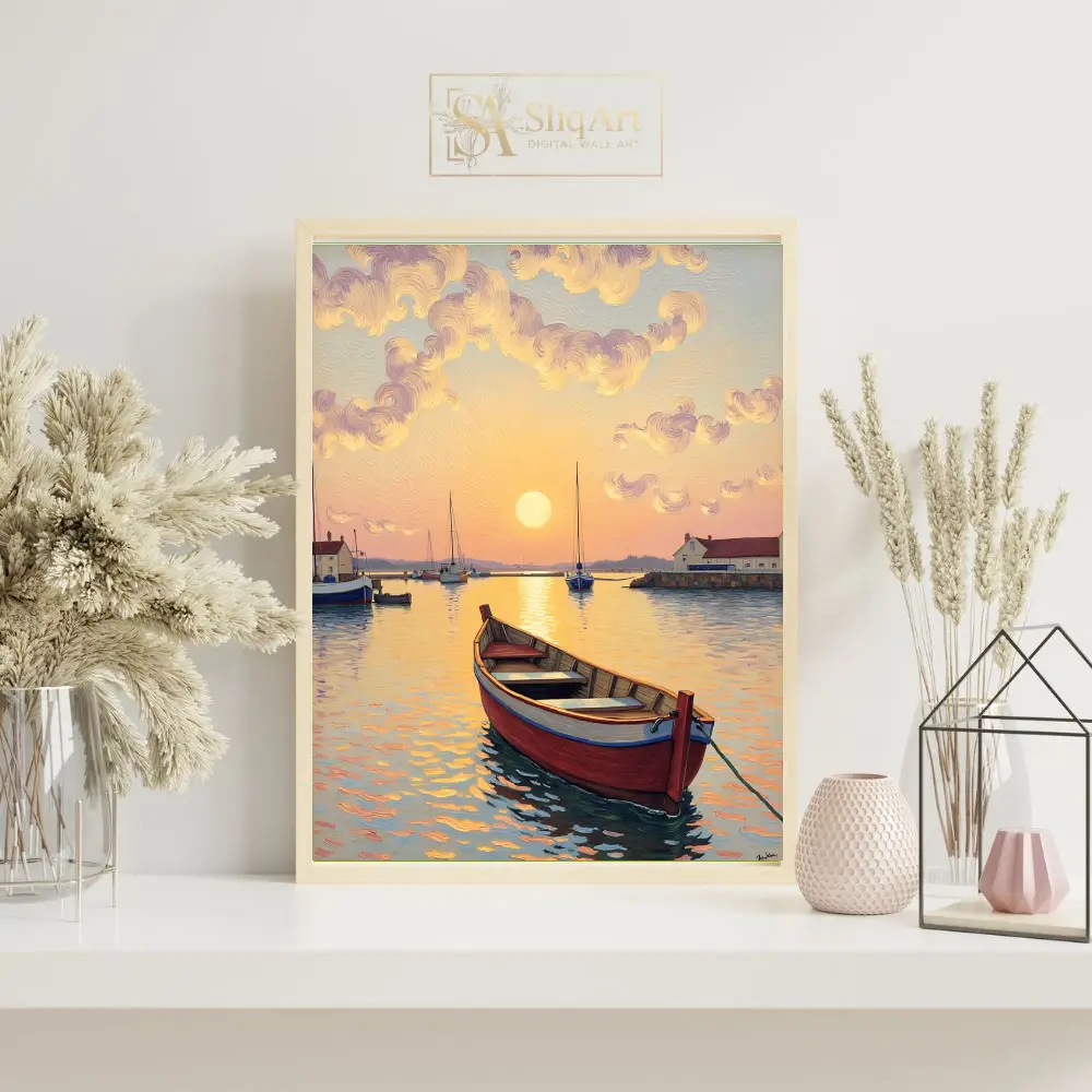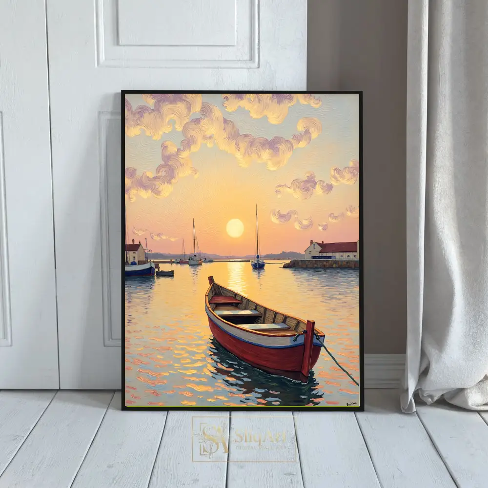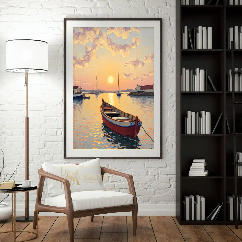 Transform your space with ‘Golden Harbor Sunset,’ a breathtaking impasto-style painting that captures the serene beauty of a harbor at dusk. The foreground features a meticulously detailed wooden boat, its red and white hull reflecting the warm glow of the setting sun.