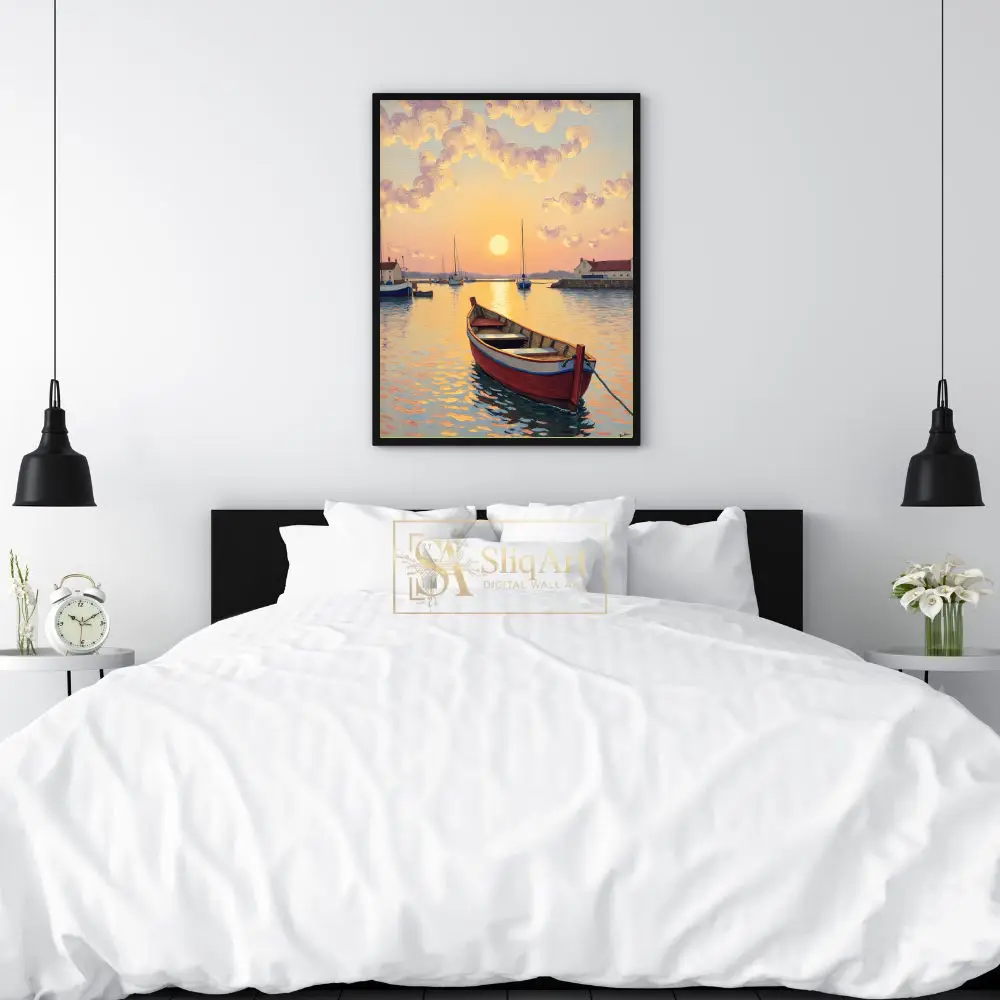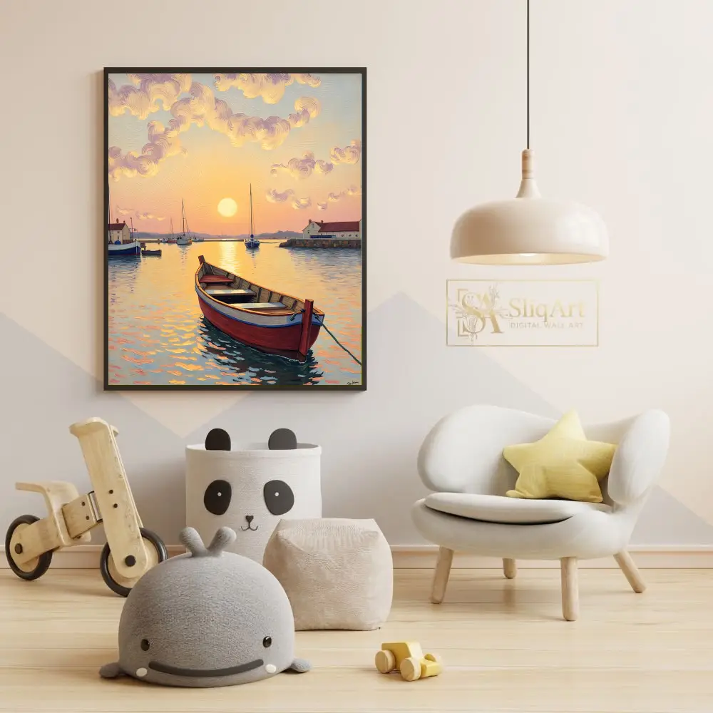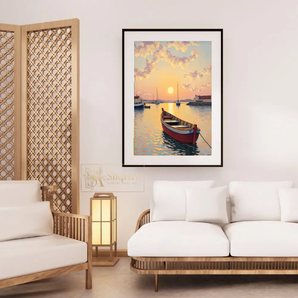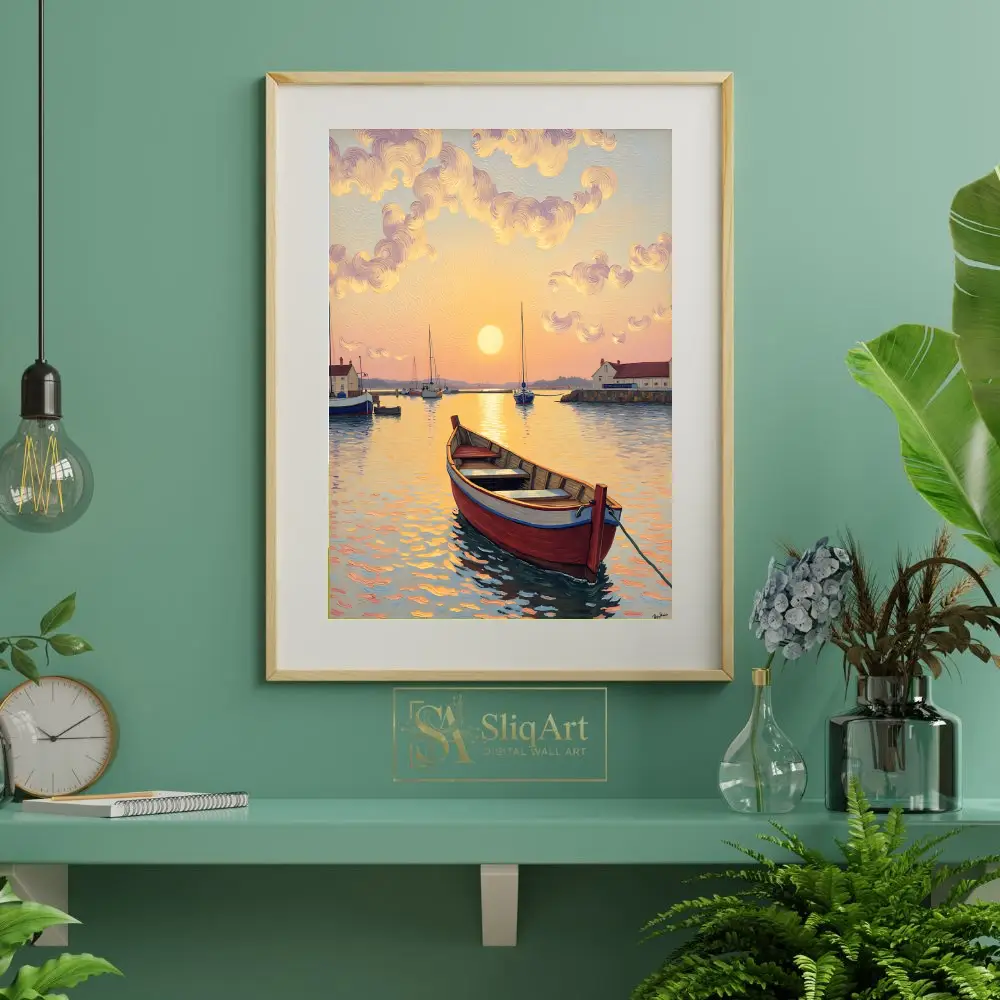 Transform your space with ‘Golden Harbor Sunset,’ a breathtaking impasto-style painting that captures the serene beauty of a harbor at dusk. The foreground features a meticulously detailed wooden boat, its red and white hull reflecting the warm glow of the setting sun.