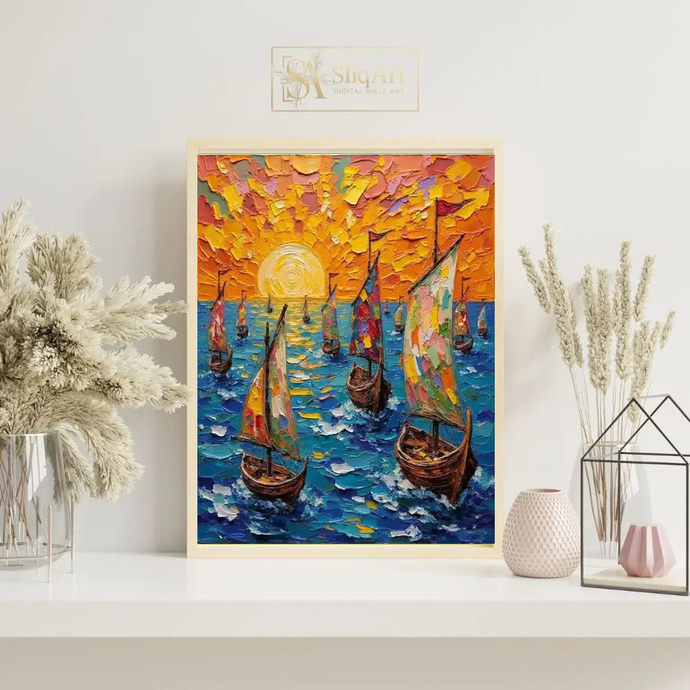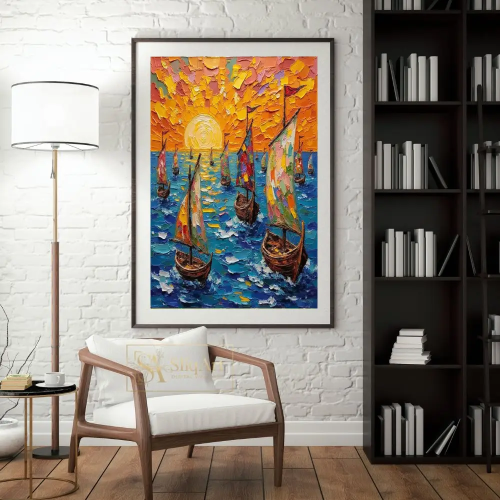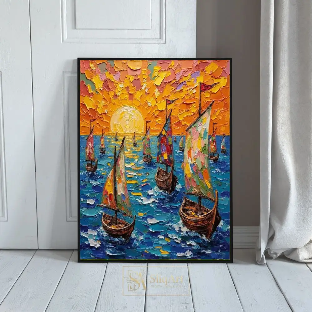 Experience the radiant energy of the open sea with this stunning impasto-style oil painting. Featuring a fleet of sailboats navigating deep blue waters under a brilliant, textured orange sunset, this piece utilizes thick, tactile palette knife strokes to create incredible depth and movement.