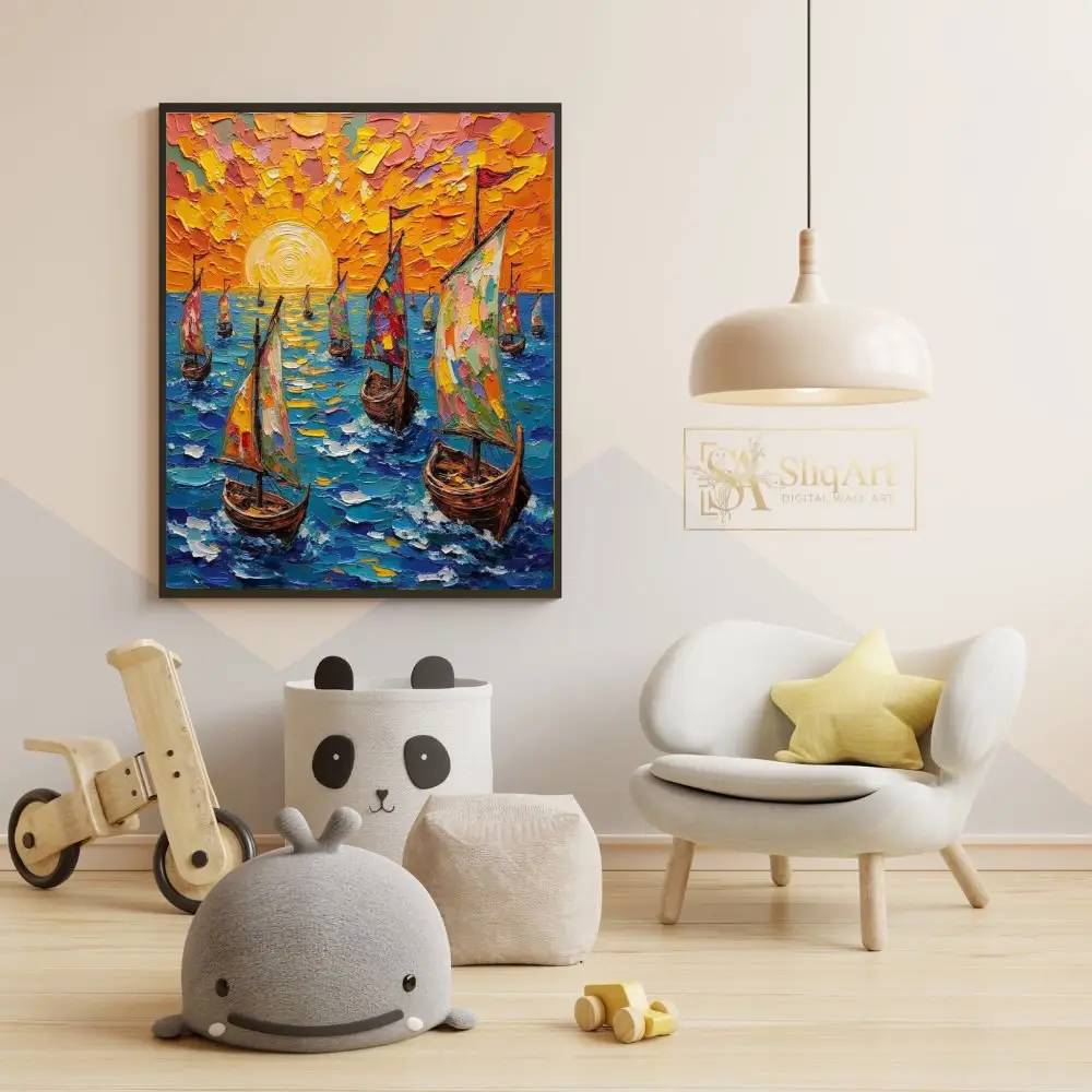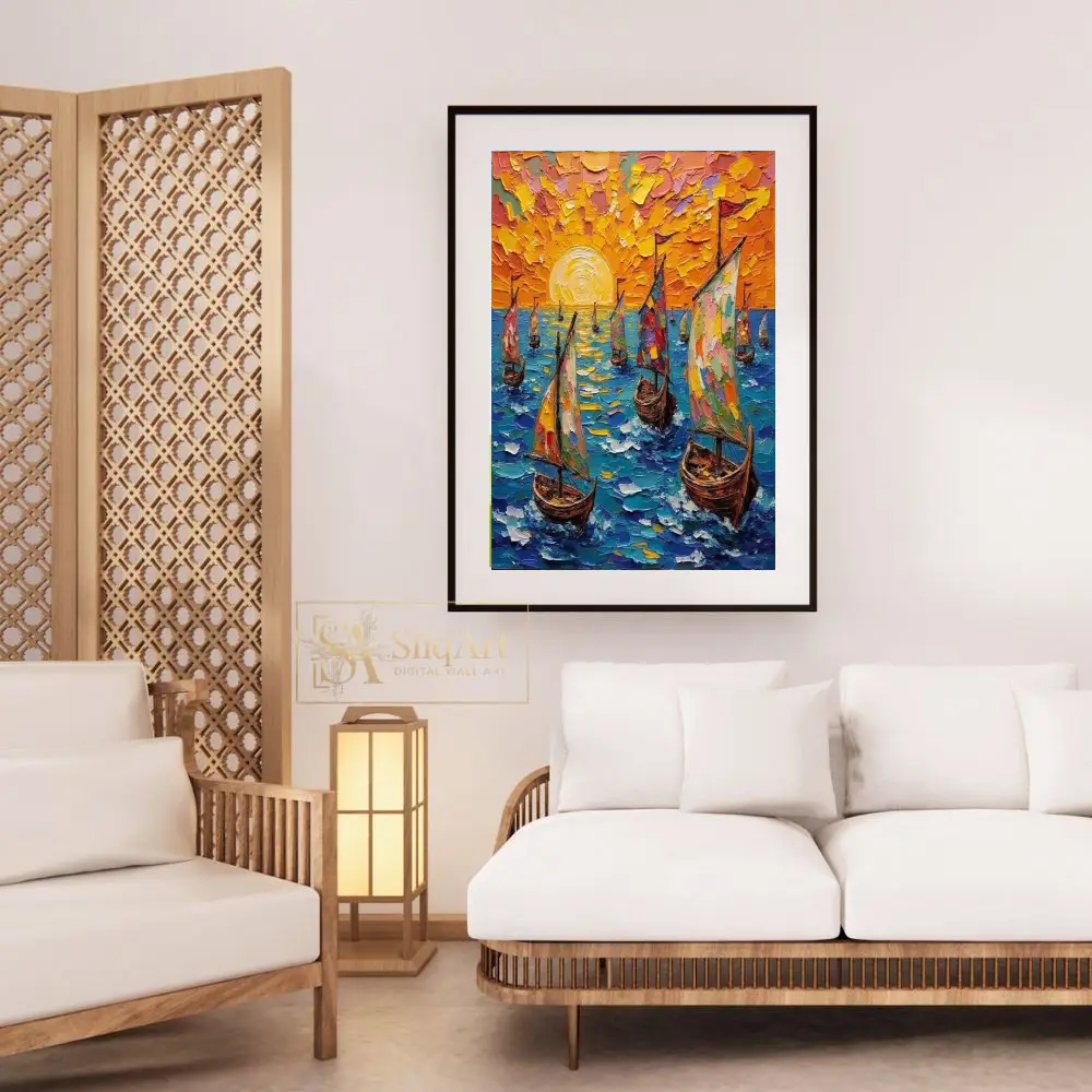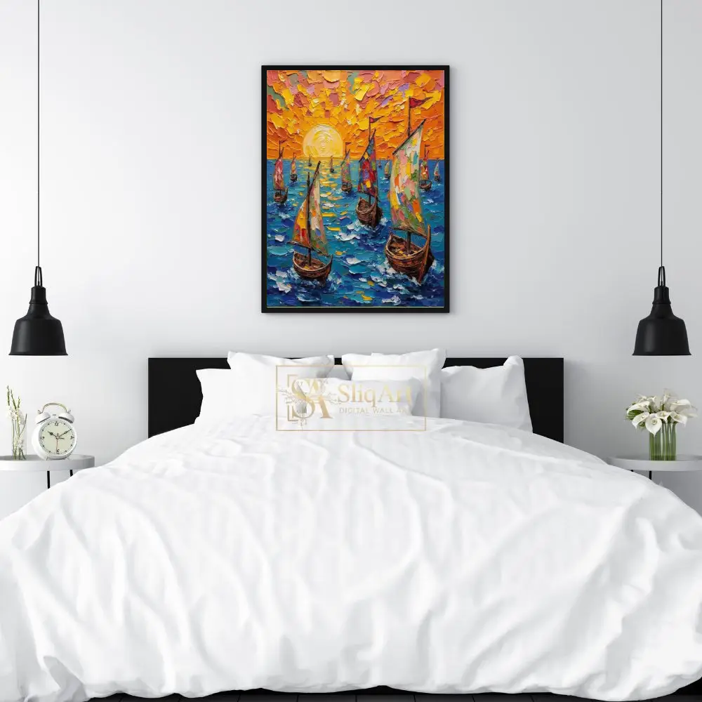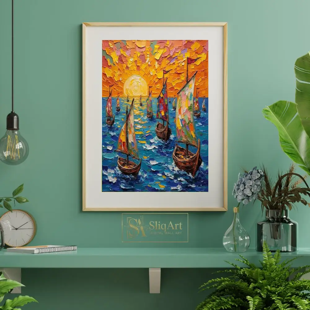 Experience the radiant energy of the open sea with this stunning impasto-style oil painting. Featuring a fleet of sailboats navigating deep blue waters under a brilliant, textured orange sunset, this piece utilizes thick, tactile palette knife strokes to create incredible depth and movement.