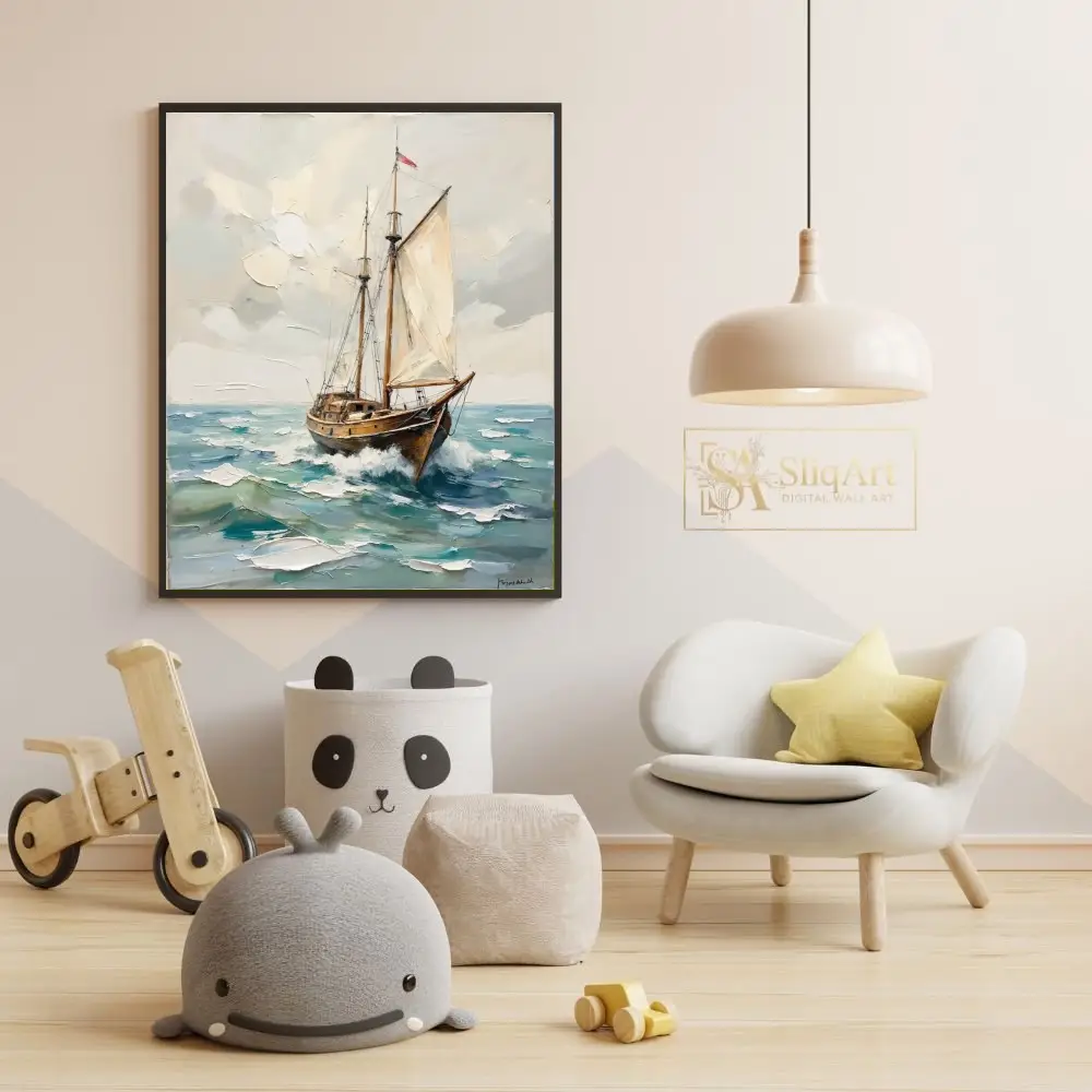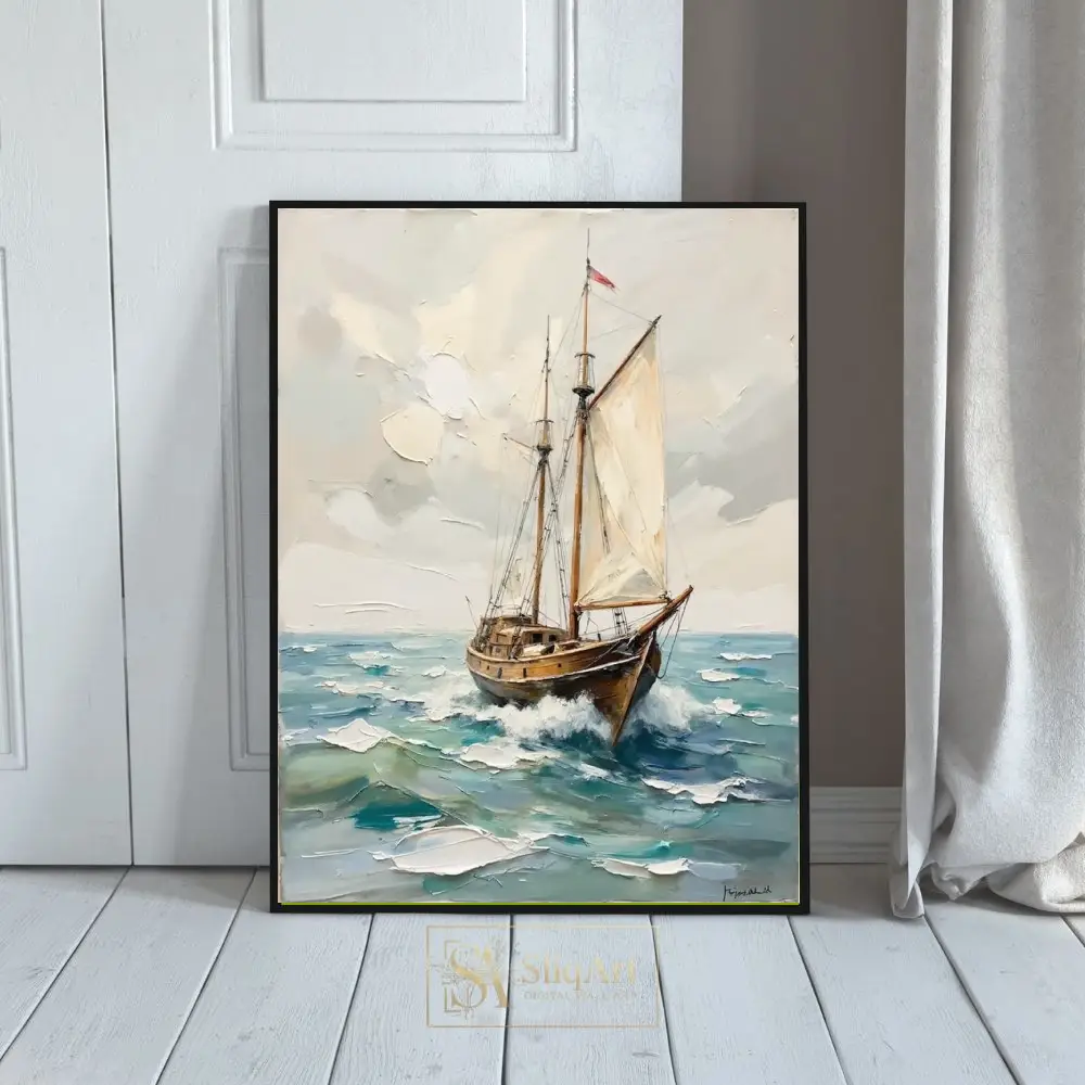 Capture the timeless spirit of the sea with this exquisite impasto oil painting of a majestic wooden sailing ship. The artwork features a dynamic composition where the vessel cuts through textured, white-capped waves under a soft, overcast sky.