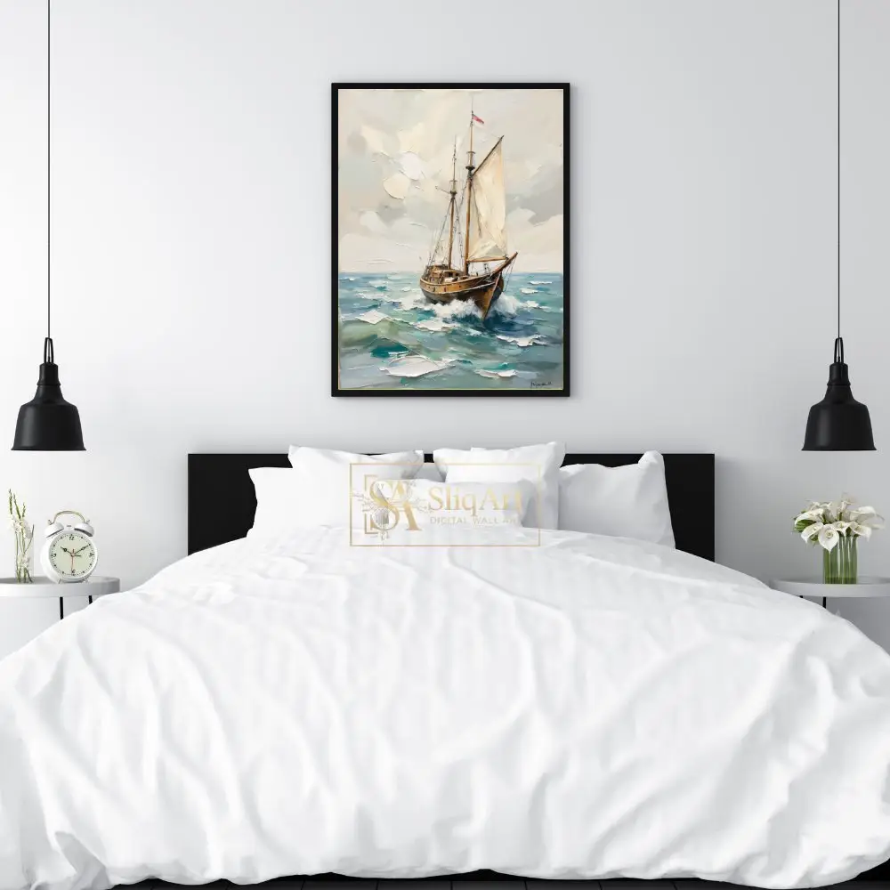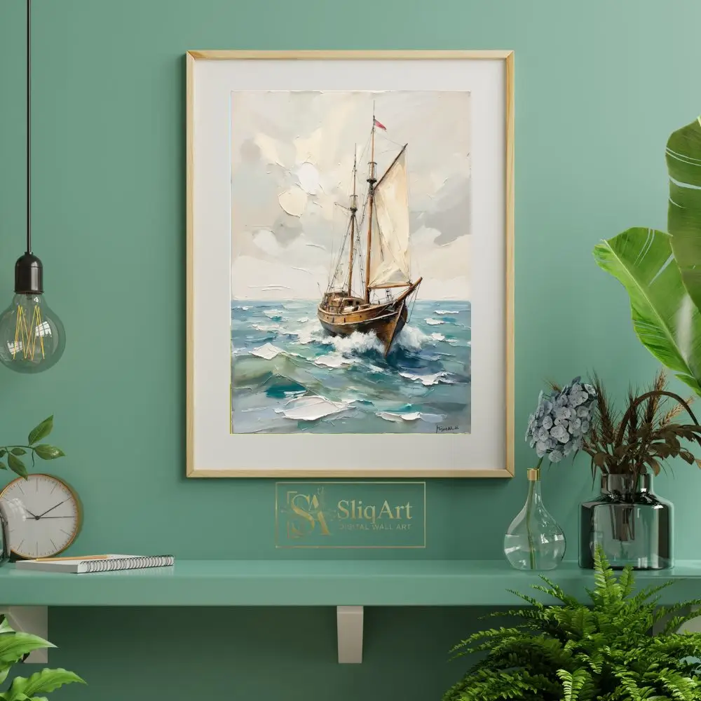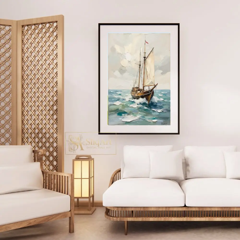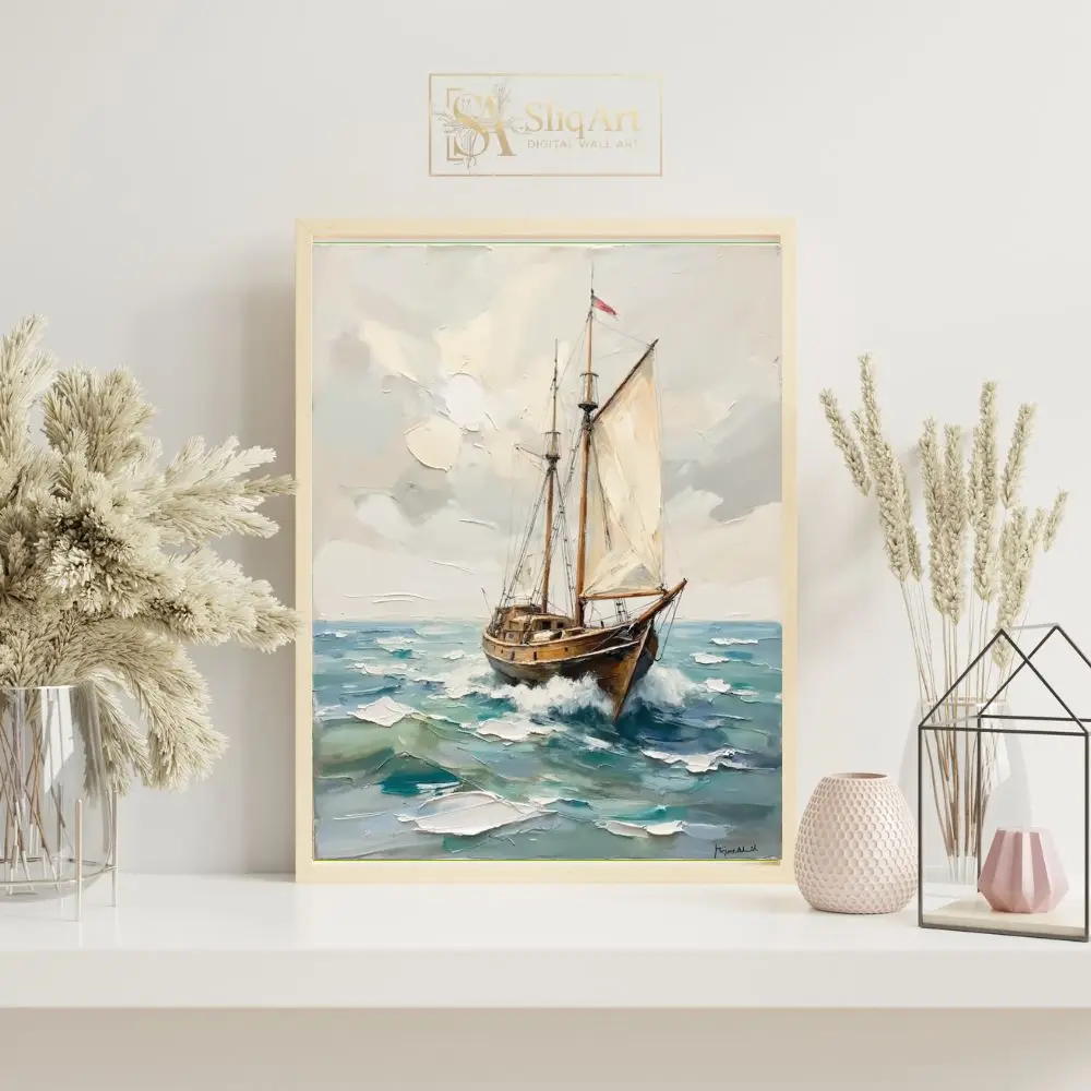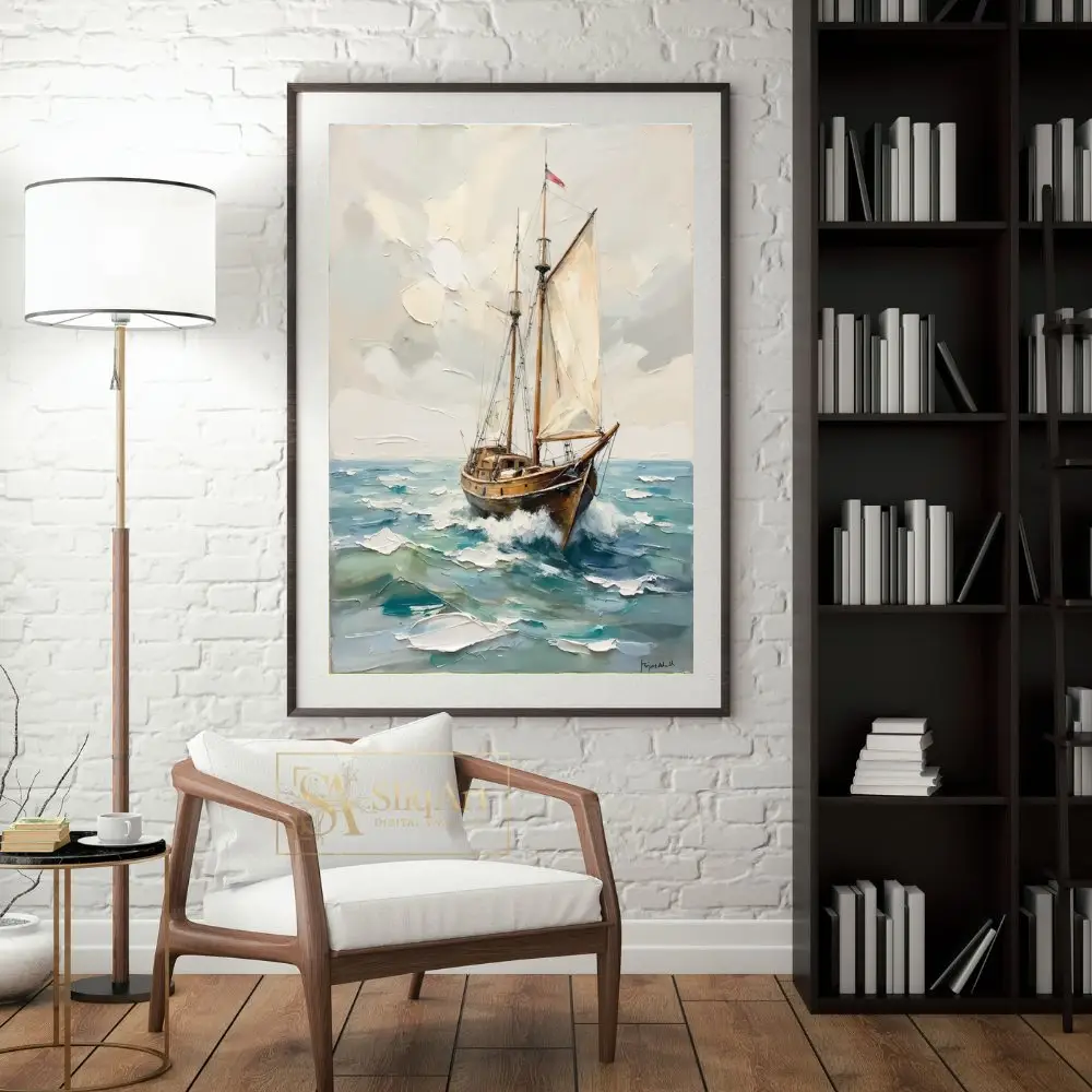 The heavy use of a palette knife creates a three-dimensional effect, bringing tactile depth to the sails and the churning water. Rich in warm browns and cool teals, this piece balances energy with coastal serenity, making it a sophisticated addition to any maritime-themed interior.