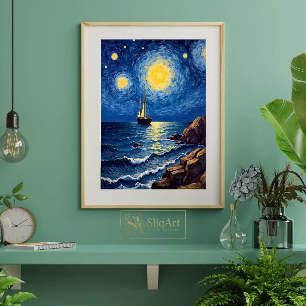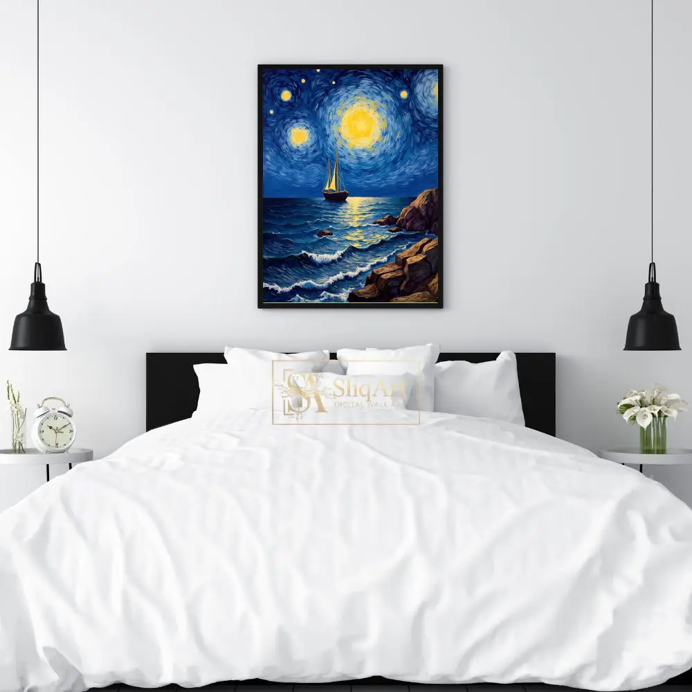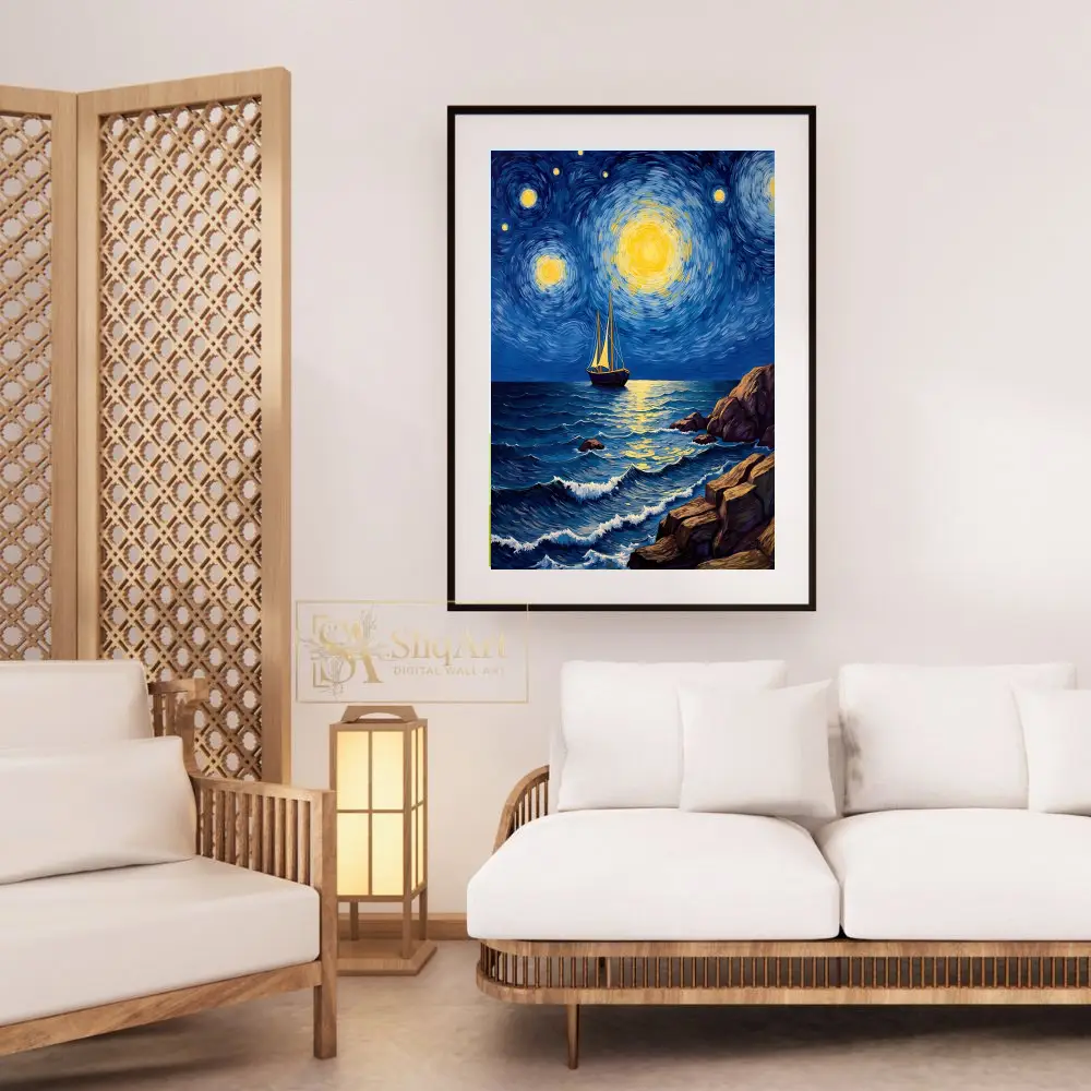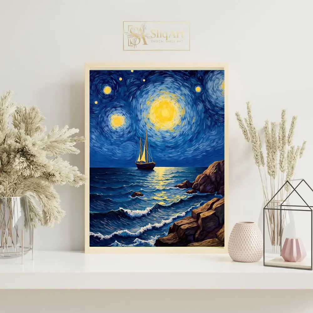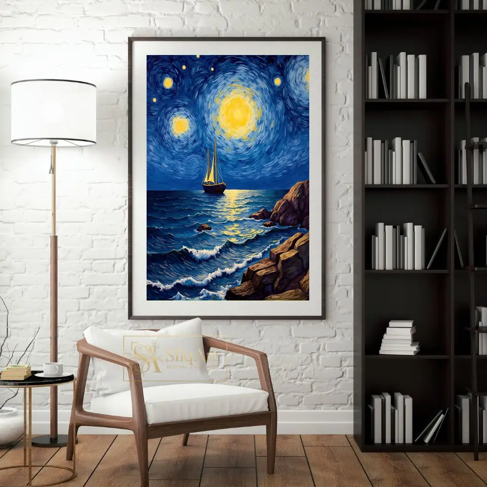 Capture the essence of a dreamlike maritime journey with ‘Celestial Voyage.’ This masterpiece utilizes the iconic Post-Impressionist technique of swirling, rhythmic brushstrokes to depict a vibrant night sky filled with radiant, glowing celestial bodies. A solitary sailboat navigates the textured, deep blue waves of the ocean, reflected in the shimmering golden light from above.