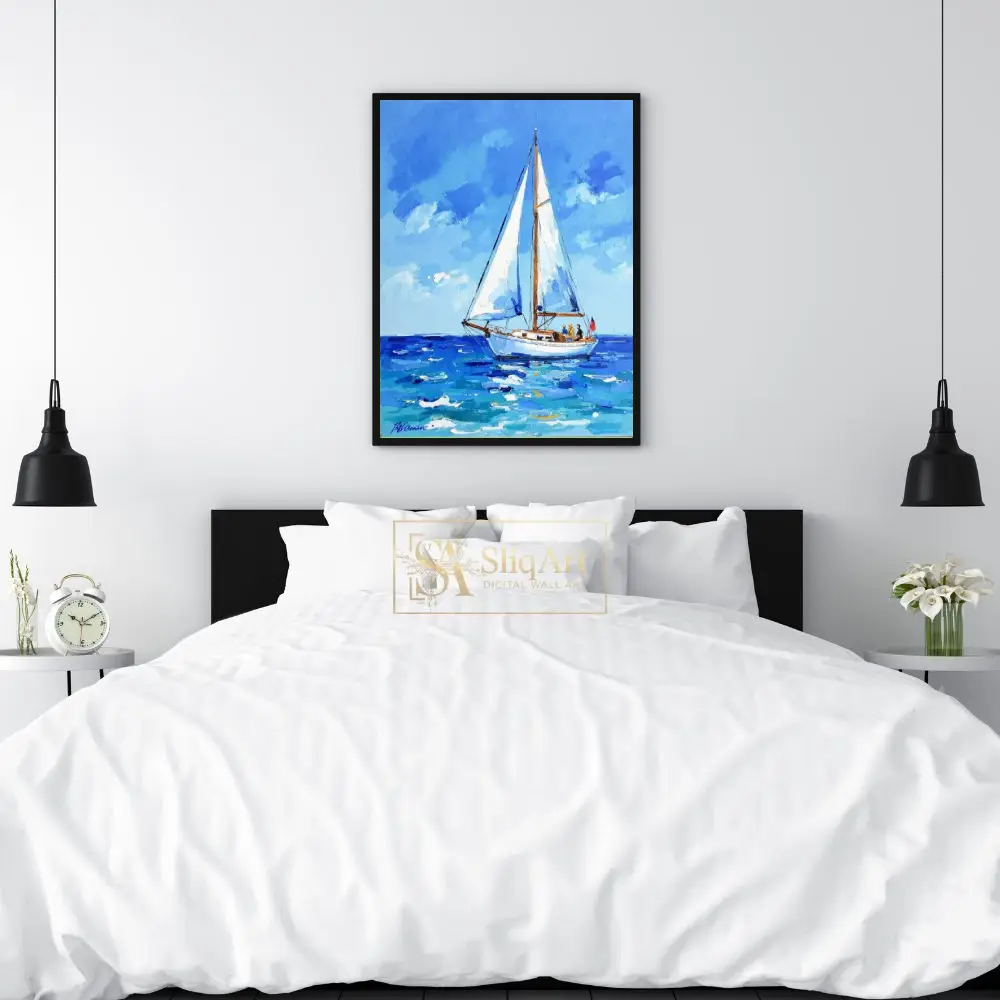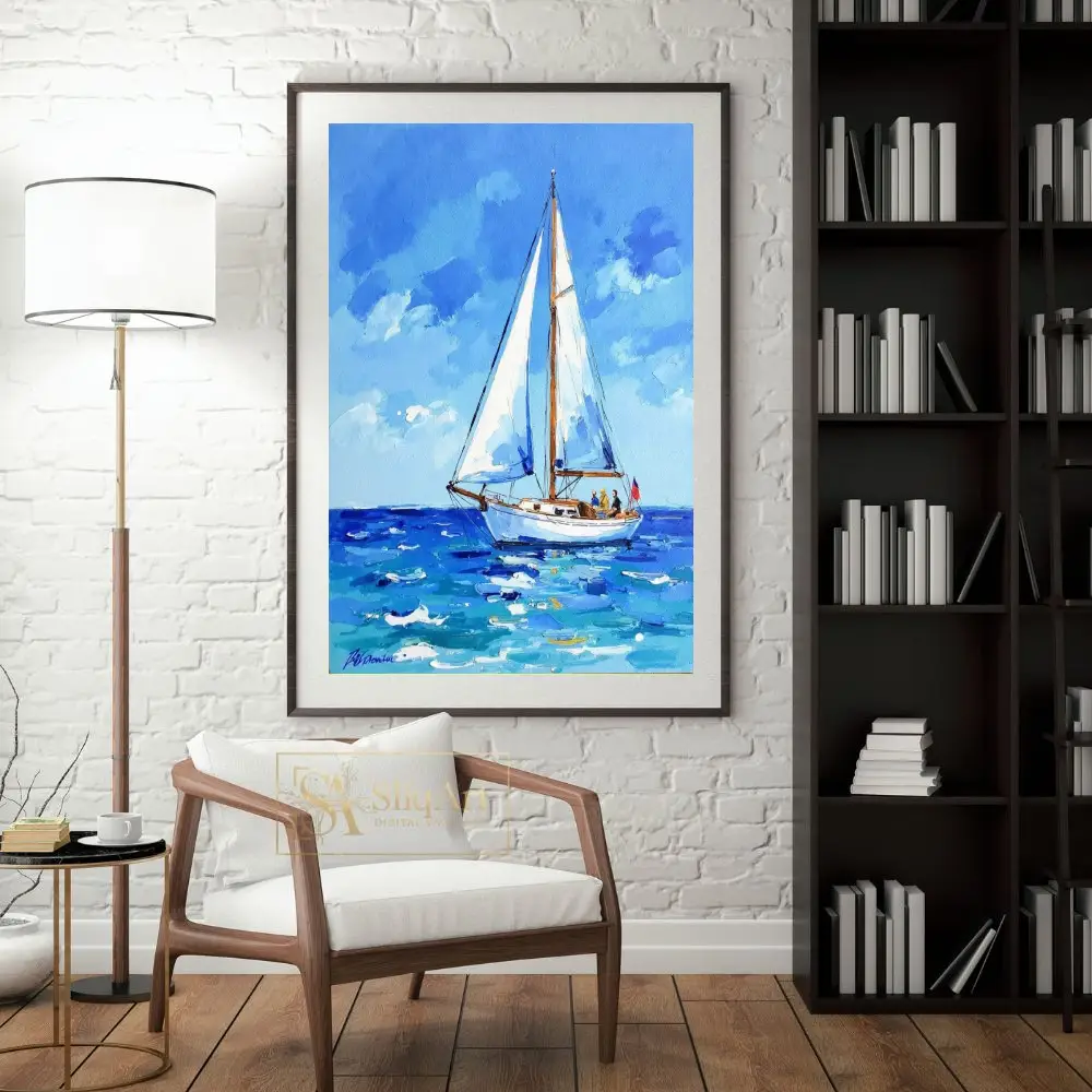 Using thick, expressive palette knife strokes and a vivid palette of cerulean and deep azure, this piece captures the rhythmic movement of waves and the brilliance of a clear afternoon sky. The texture of the impasto technique adds a three-dimensional depth to the sails, making it a captivating centerpiece for any coastal-inspired interior.