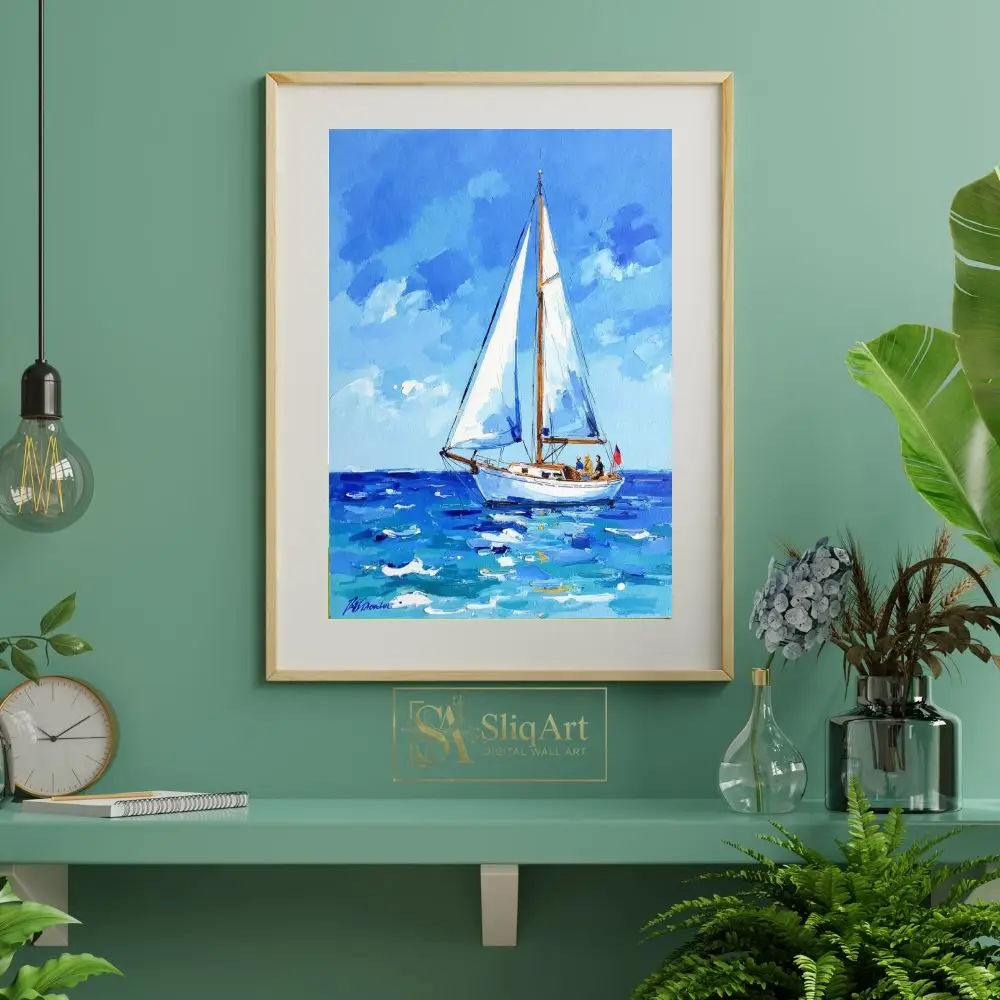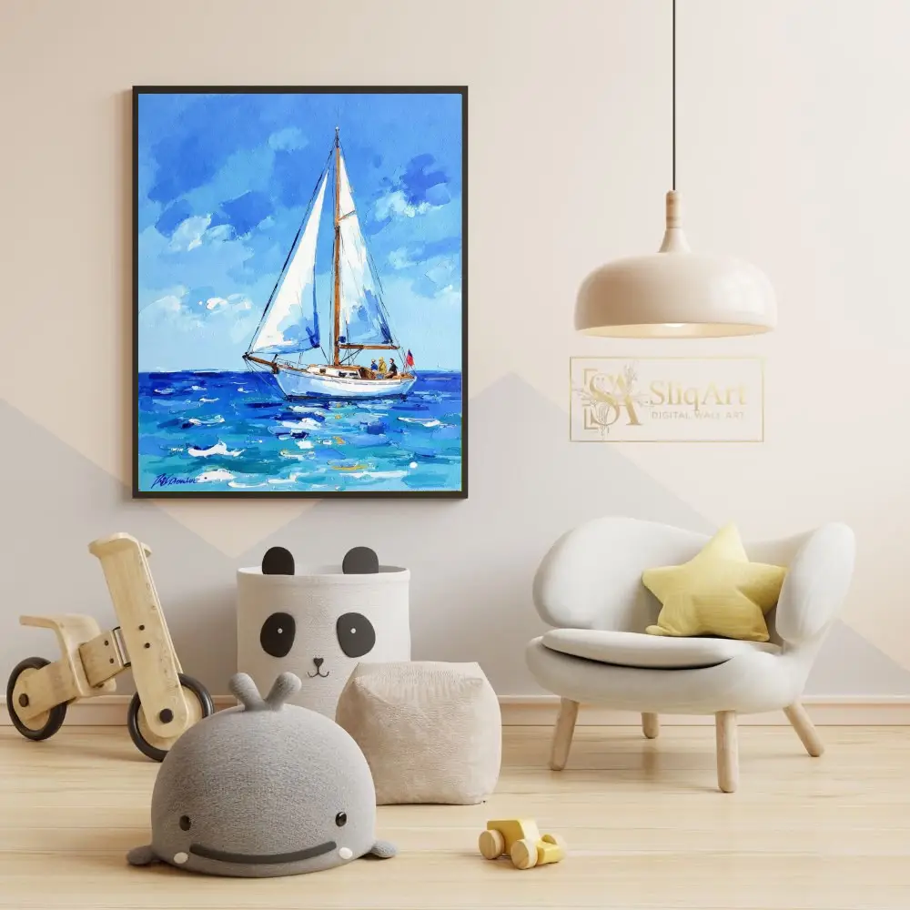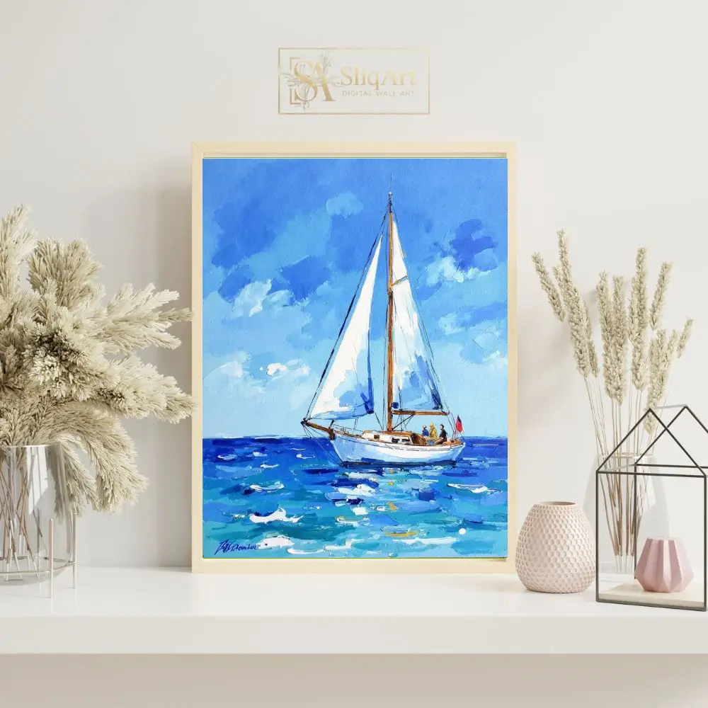 Experience the serene power of the open sea with this striking impressionist painting of a white sailboat.