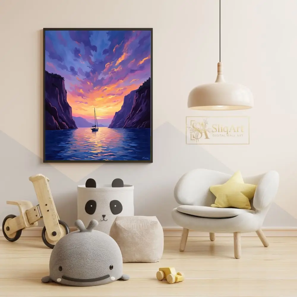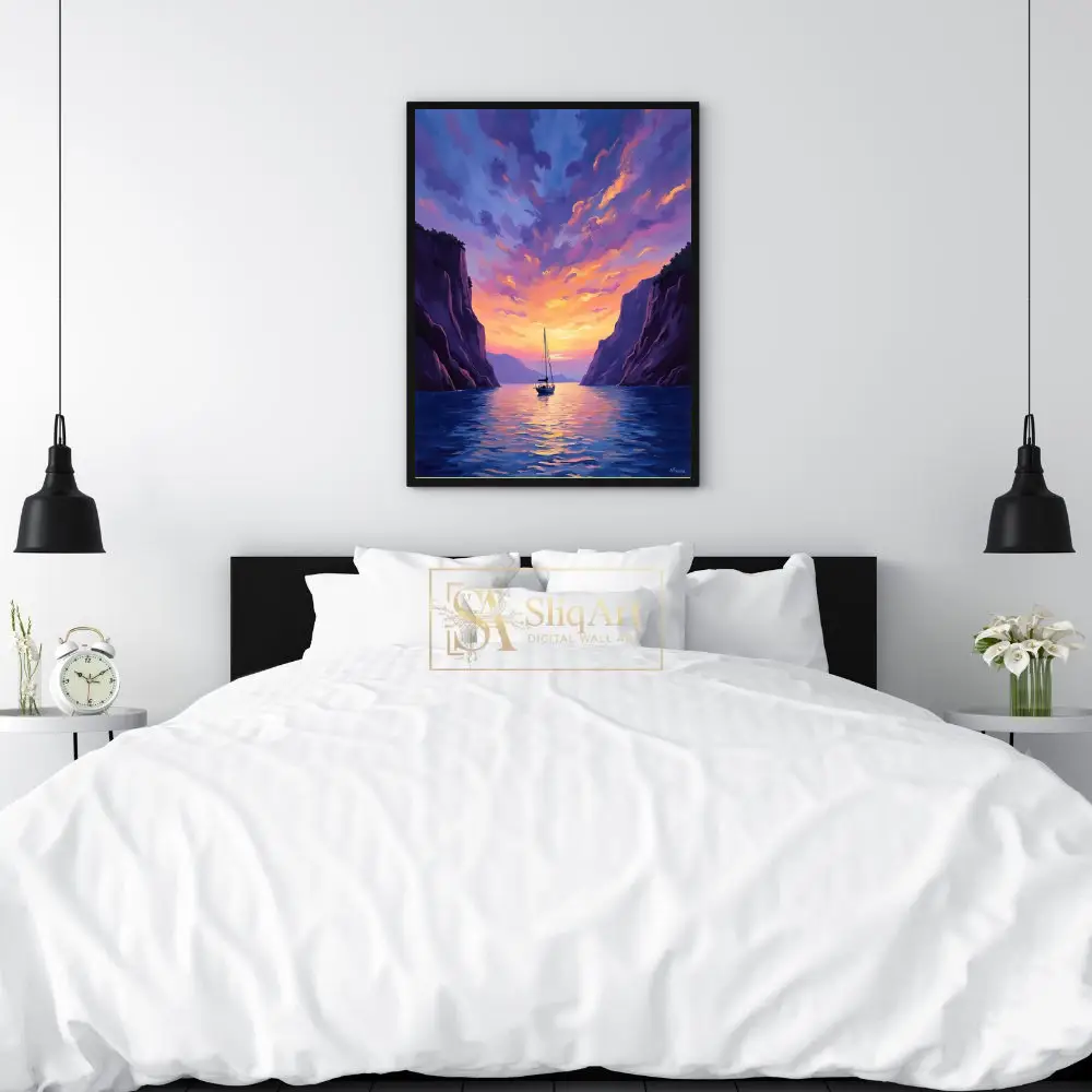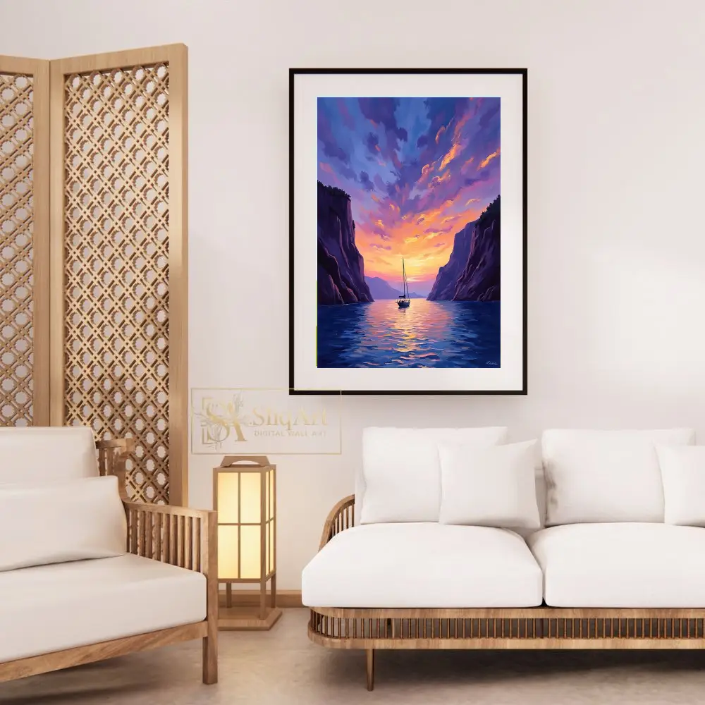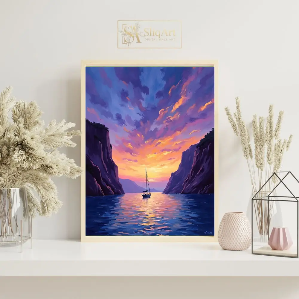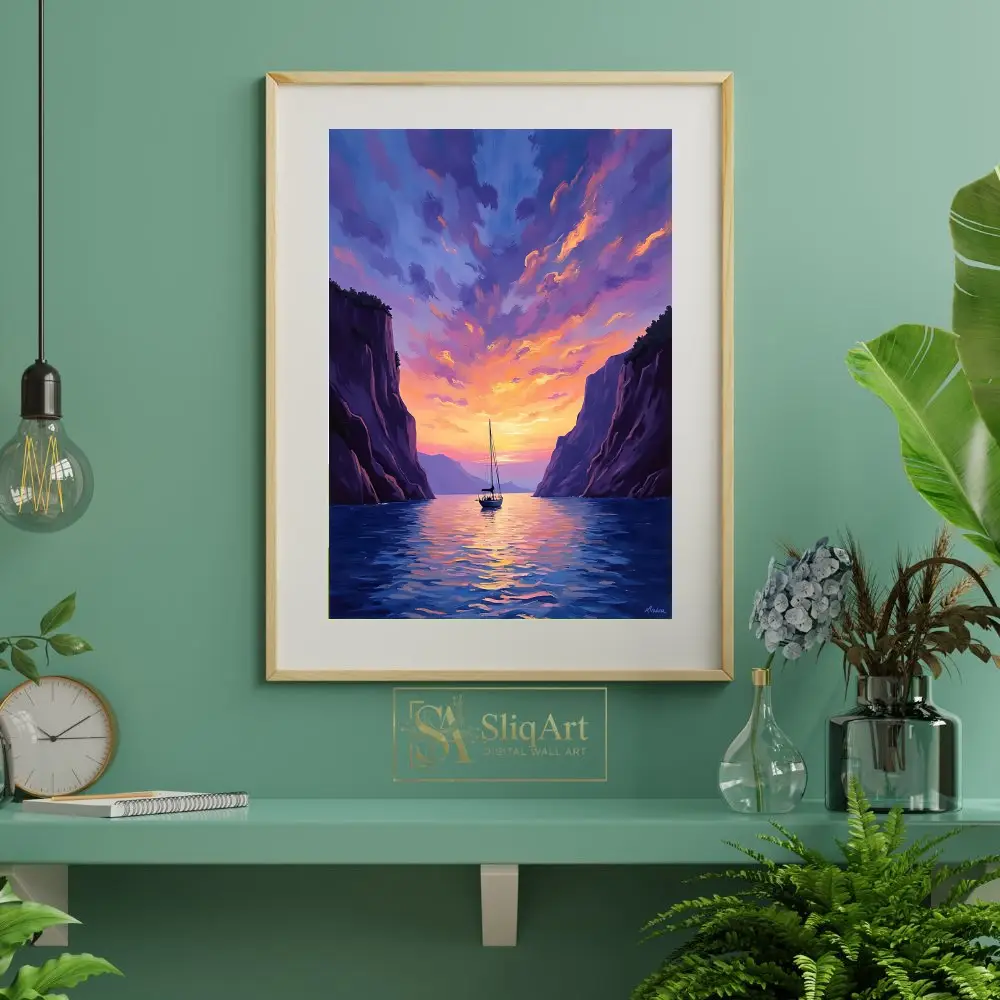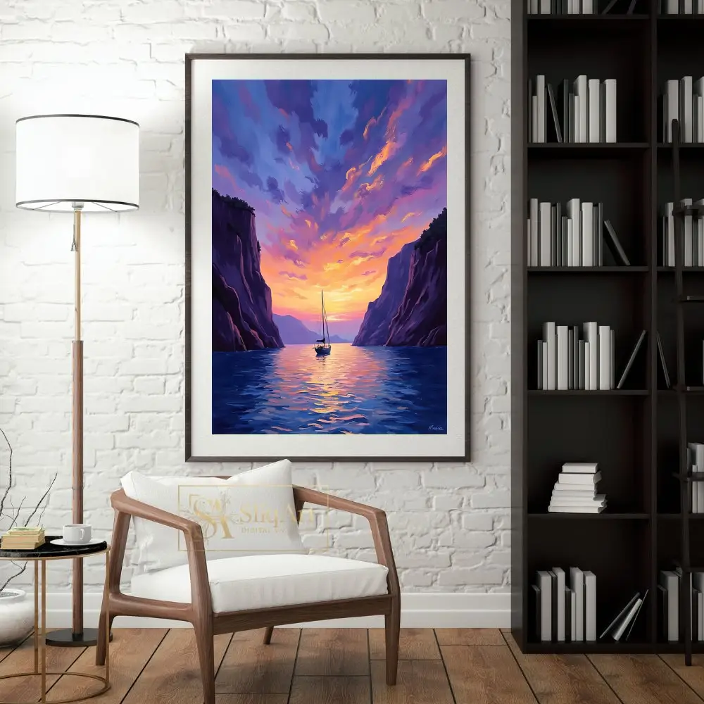 Experience the tranquility of a nautical escape with this stunning impressionist masterpiece. ‘Sailing Through the Golden Hour’ captures a solitary sailboat gliding through calm waters, framed by towering, majestic cliffs.