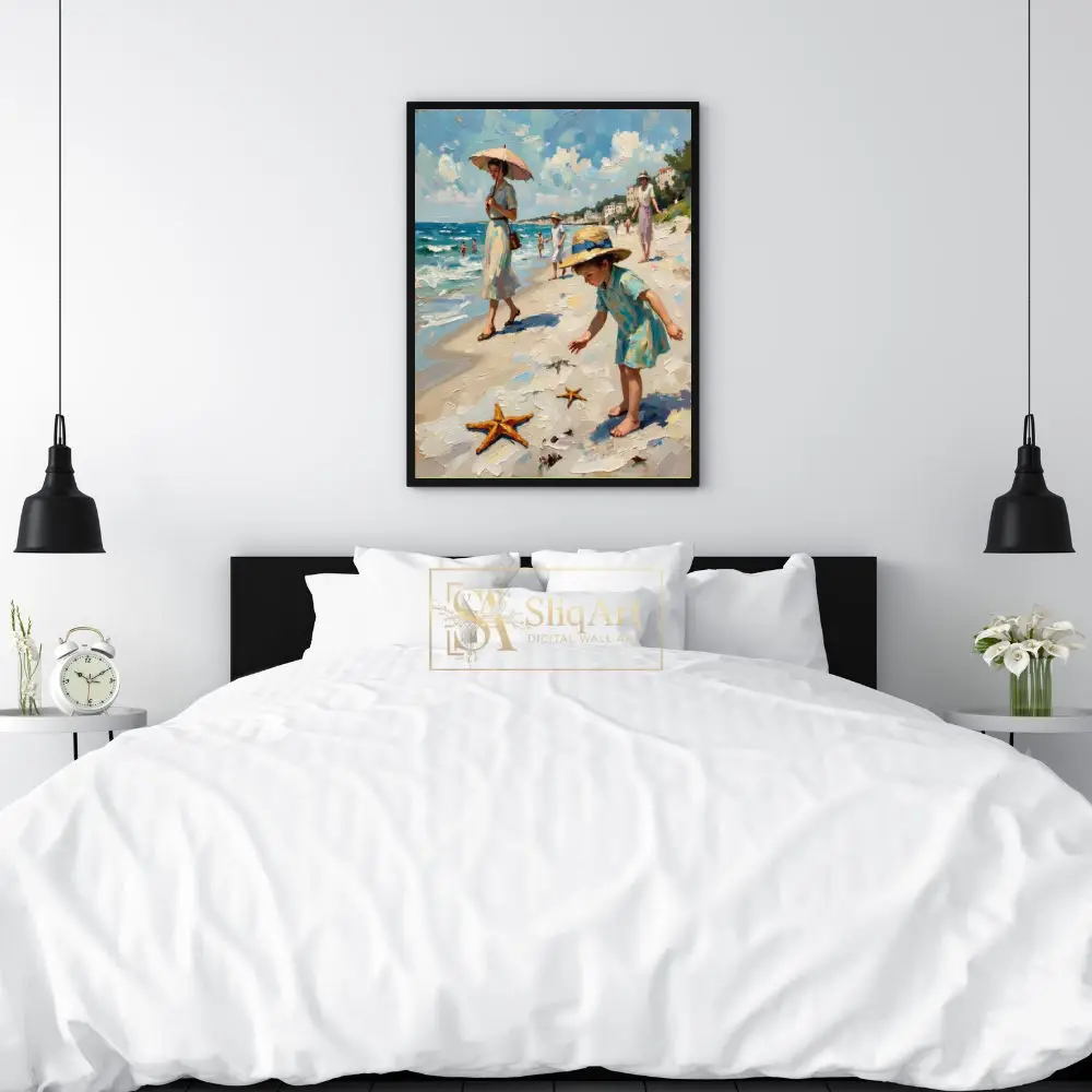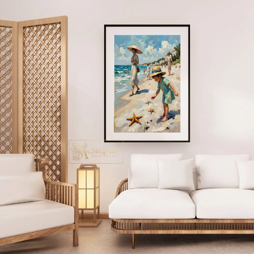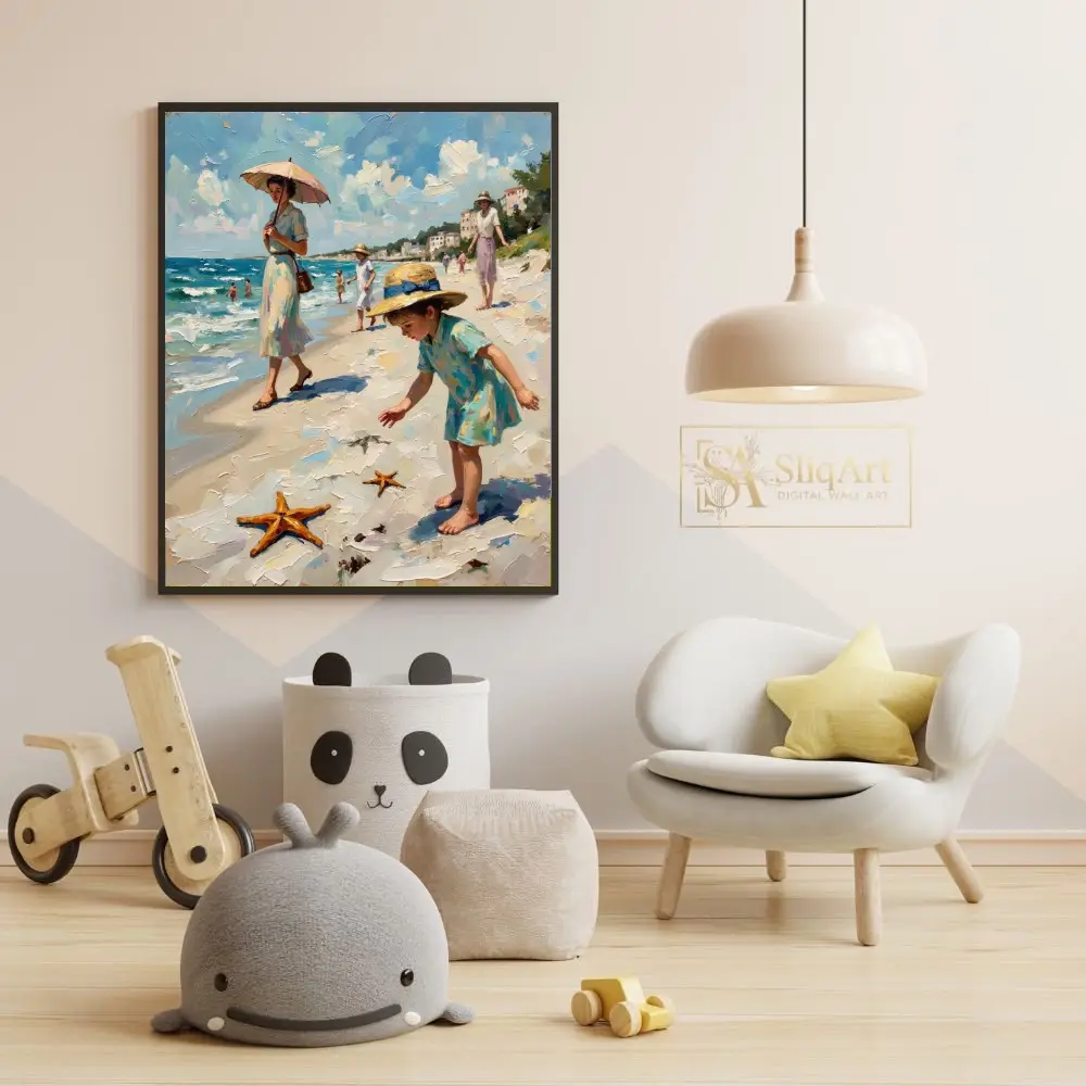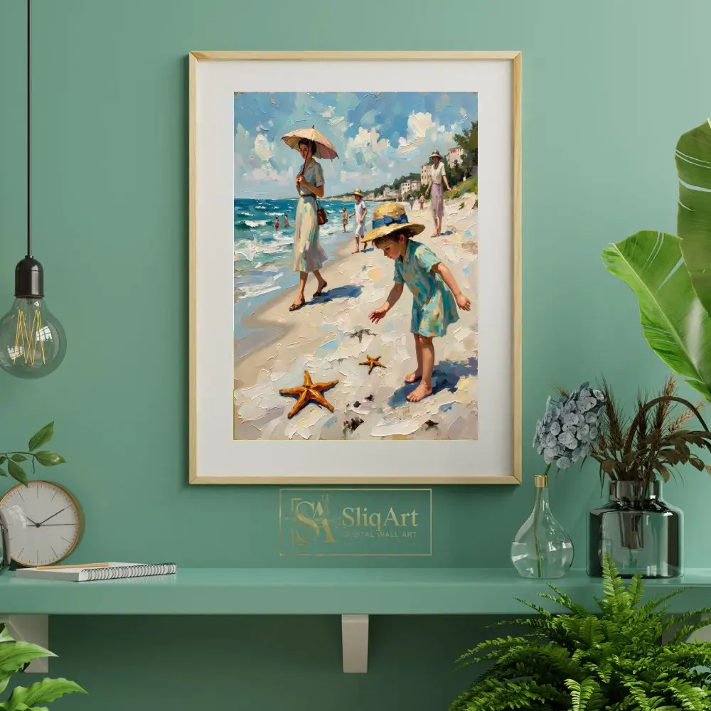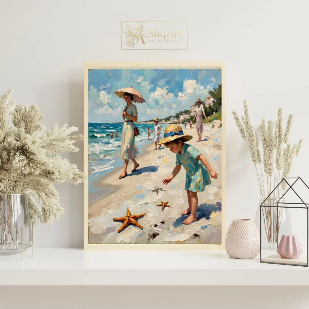 Immerse yourself in a nostalgic summer afternoon with this exquisite impressionist oil painting. The scene captures an elegant seaside promenade, featuring women in vintage dresses and children discovering starfishes along the shore.