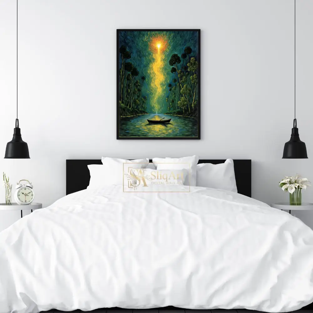 This stunning impressionist canvas art captures a serene and mystical moment on a quiet river. Featuring a lone boat drifting under a celestial, swirling golden light, the piece uses thick, textured brushstrokes to create a sense of movement and energy.