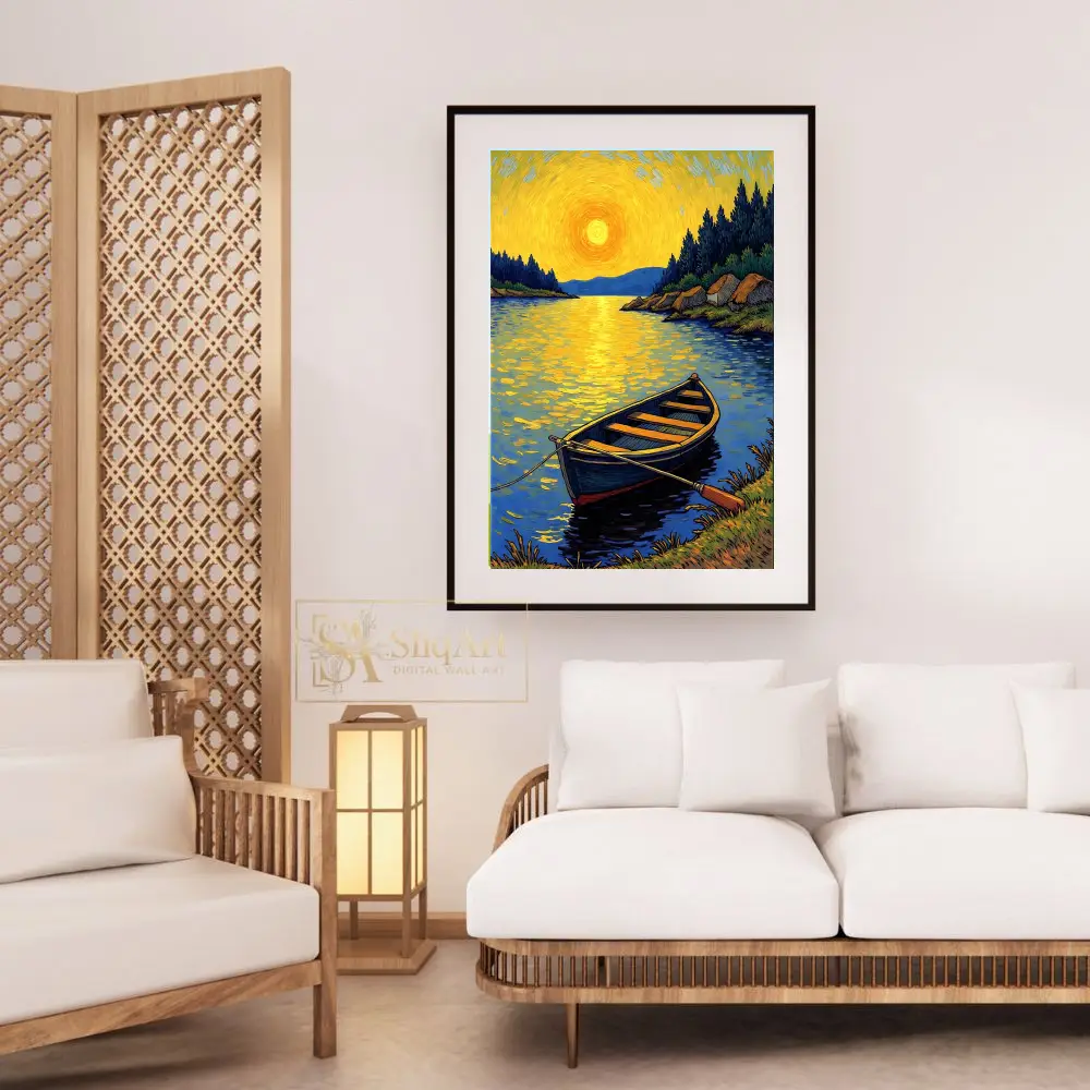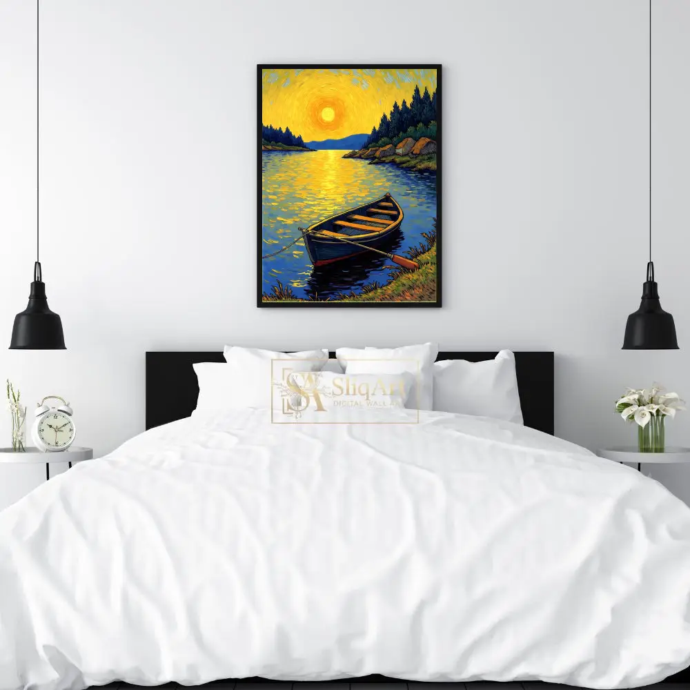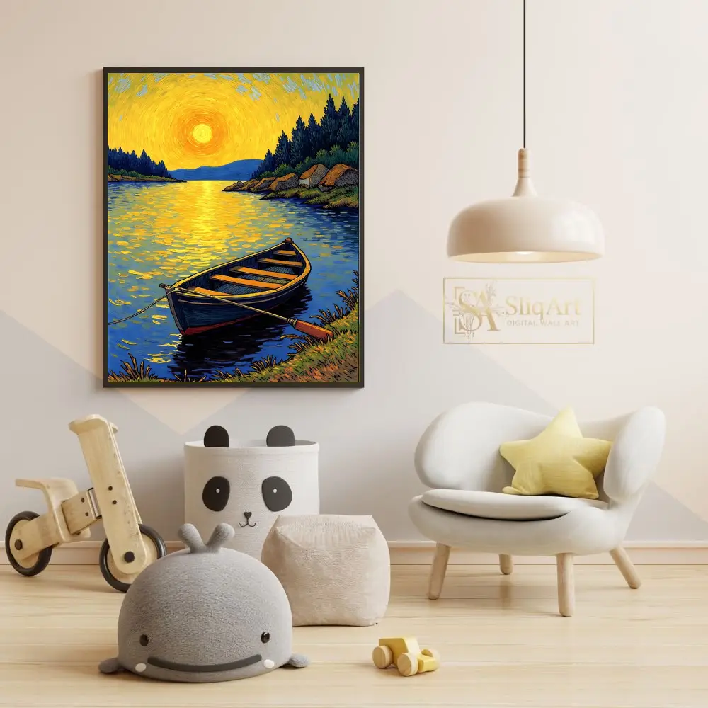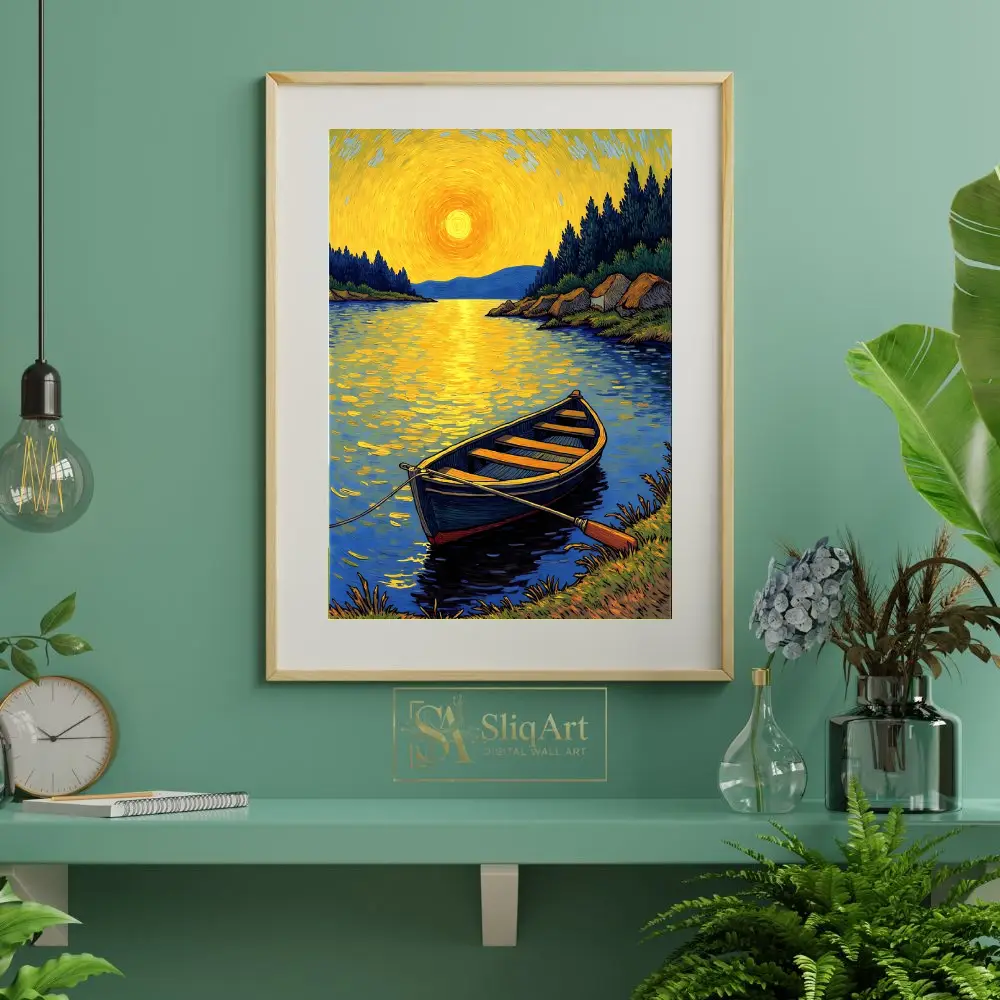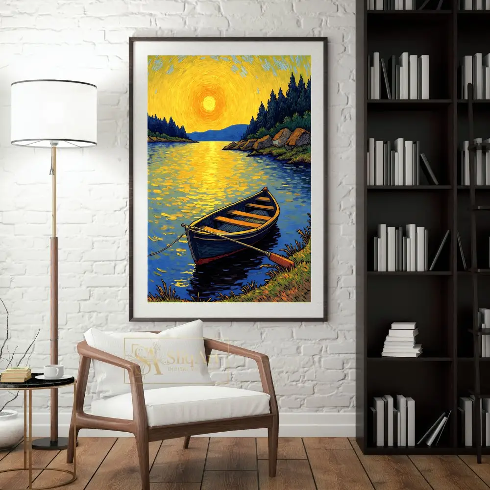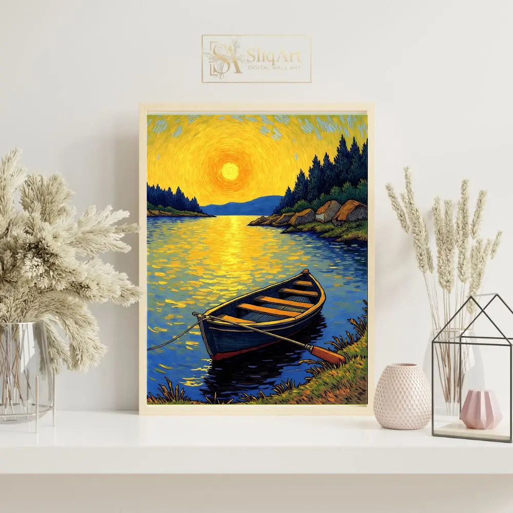 Golden Hour Serenity captures the tranquil beauty of a lone rowboat moored on a shimmering lake at sunset. Rendered in a stunning Post-Impressionist style reminiscent of Vincent van Gogh, this piece features bold, swirling brushstrokes that bring the golden sky and cool blue waters to life.