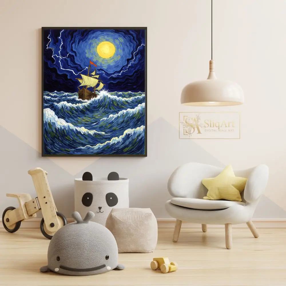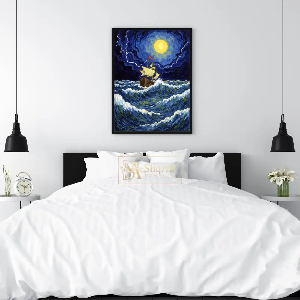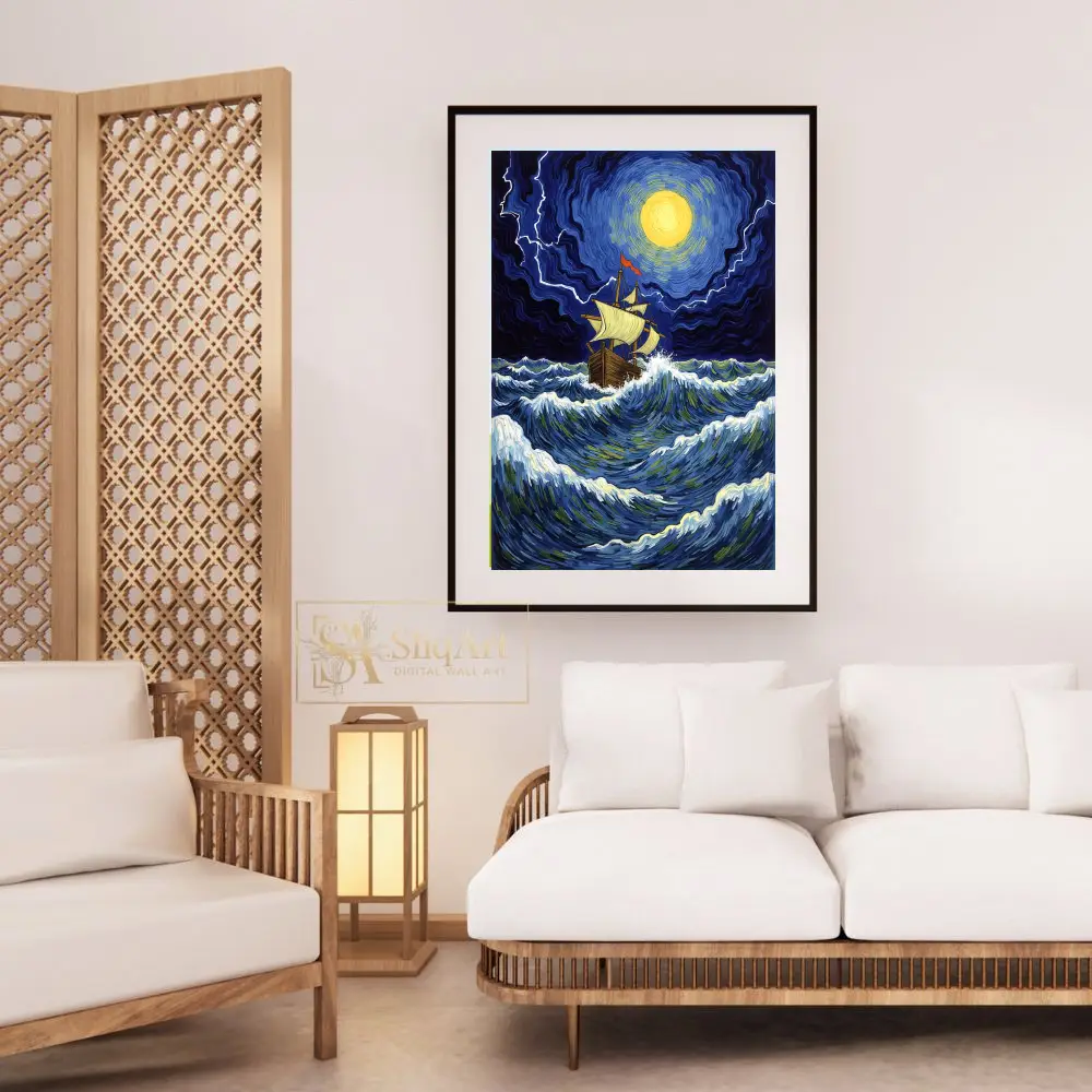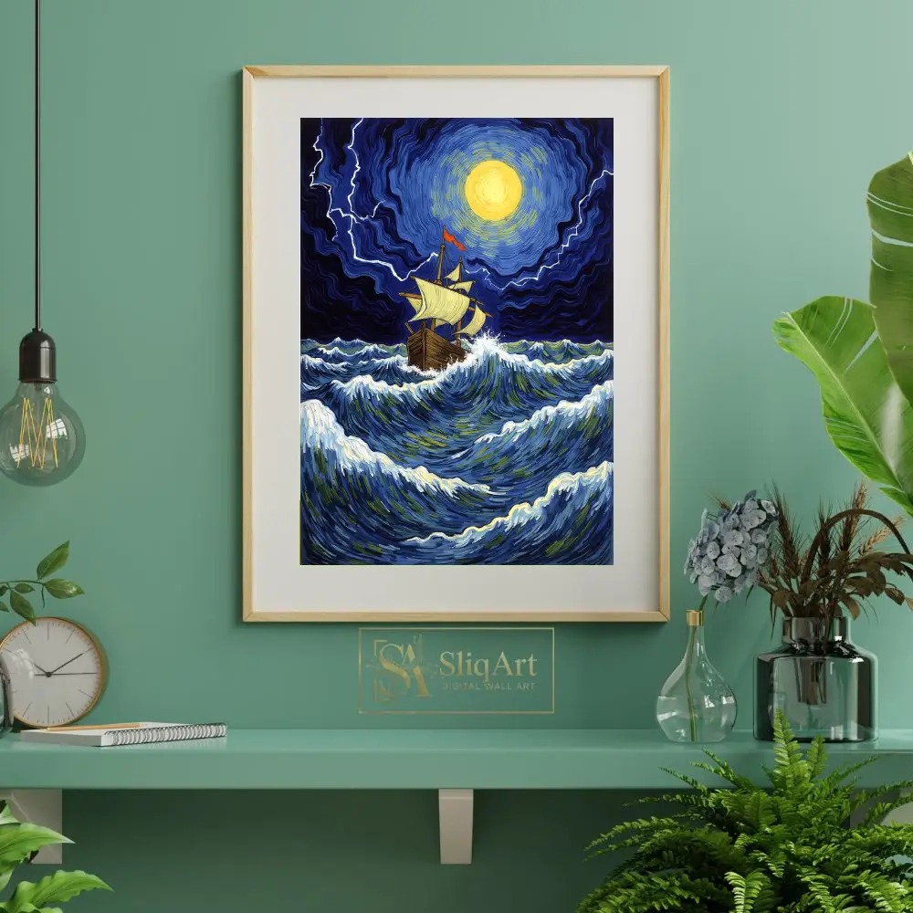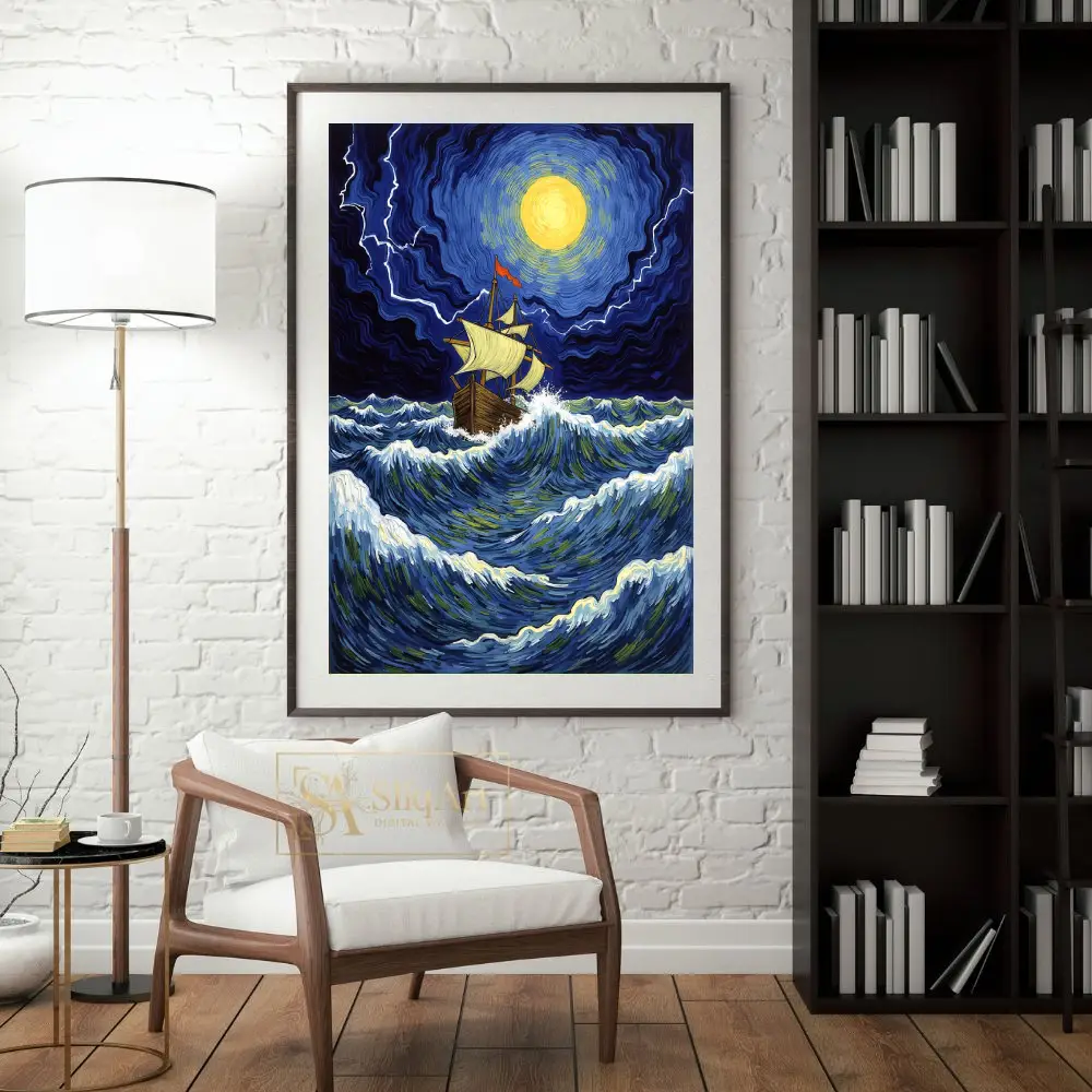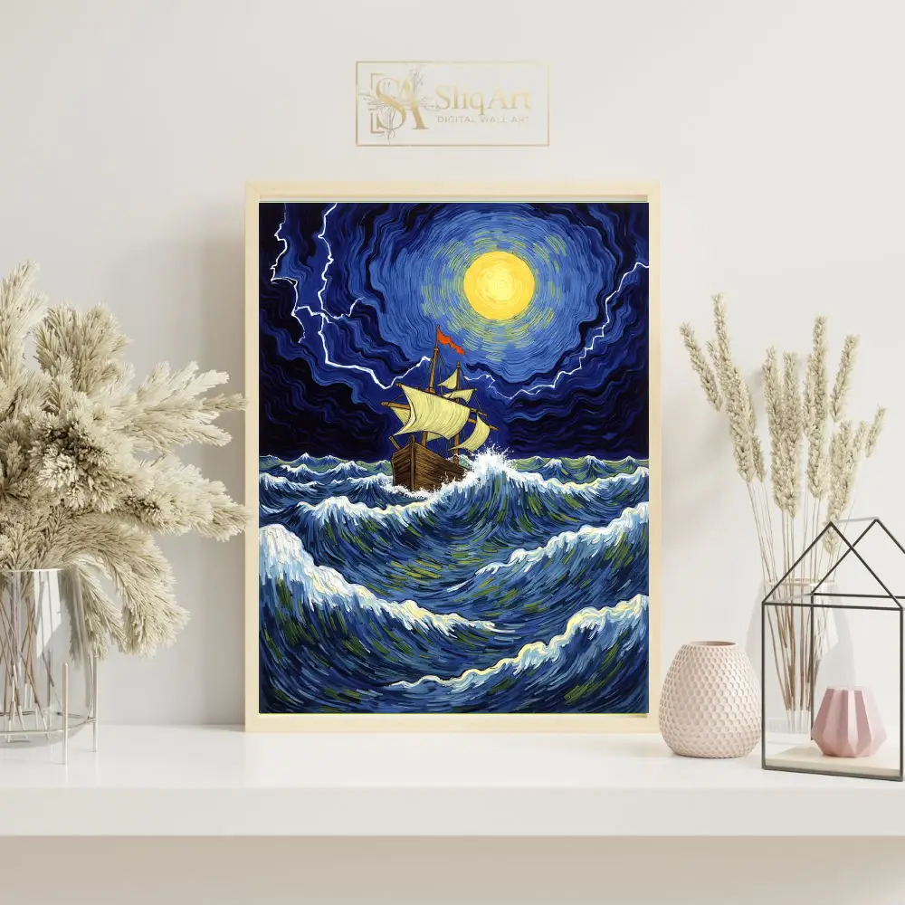 This striking wall art captures the raw power of the ocean through the lens of Post-Impressionism. Inspired by the swirling energy of Van Gogh’s brushwork, the piece depicts a lone sailing vessel navigating a tumultuous sea under a radiant celestial body and a lightning-filled sky.