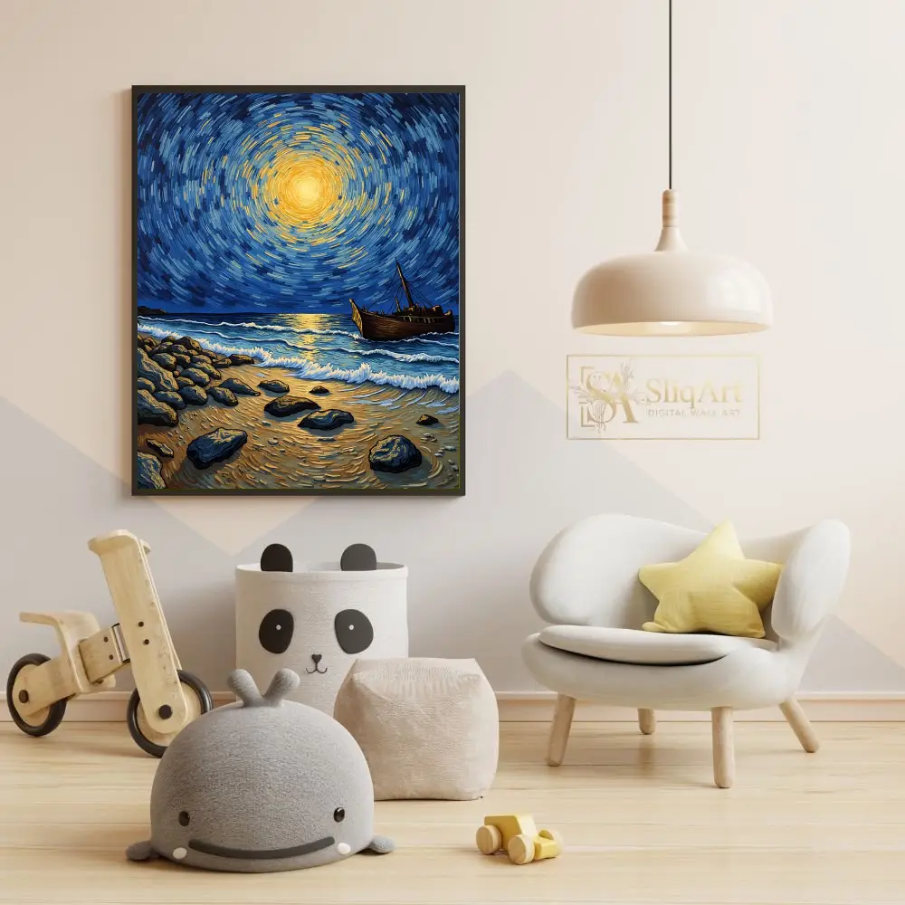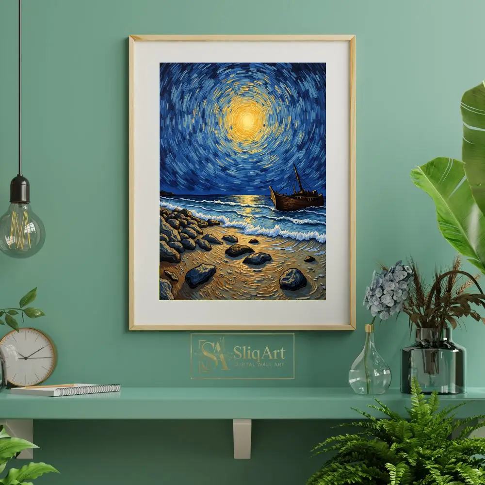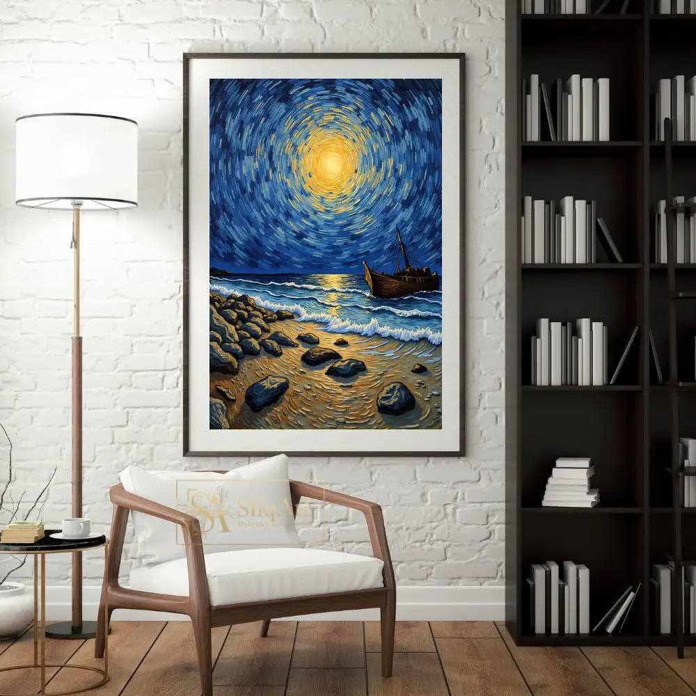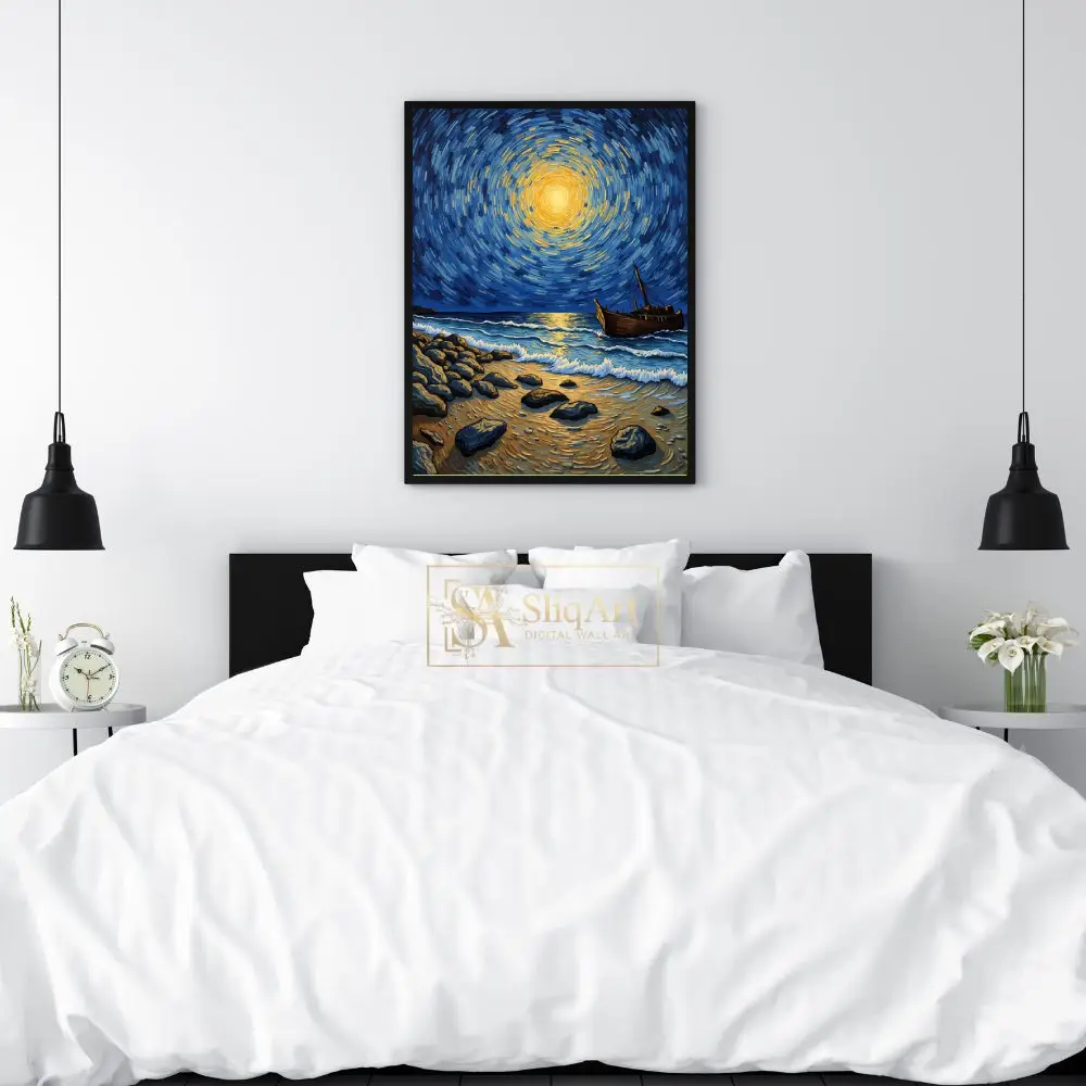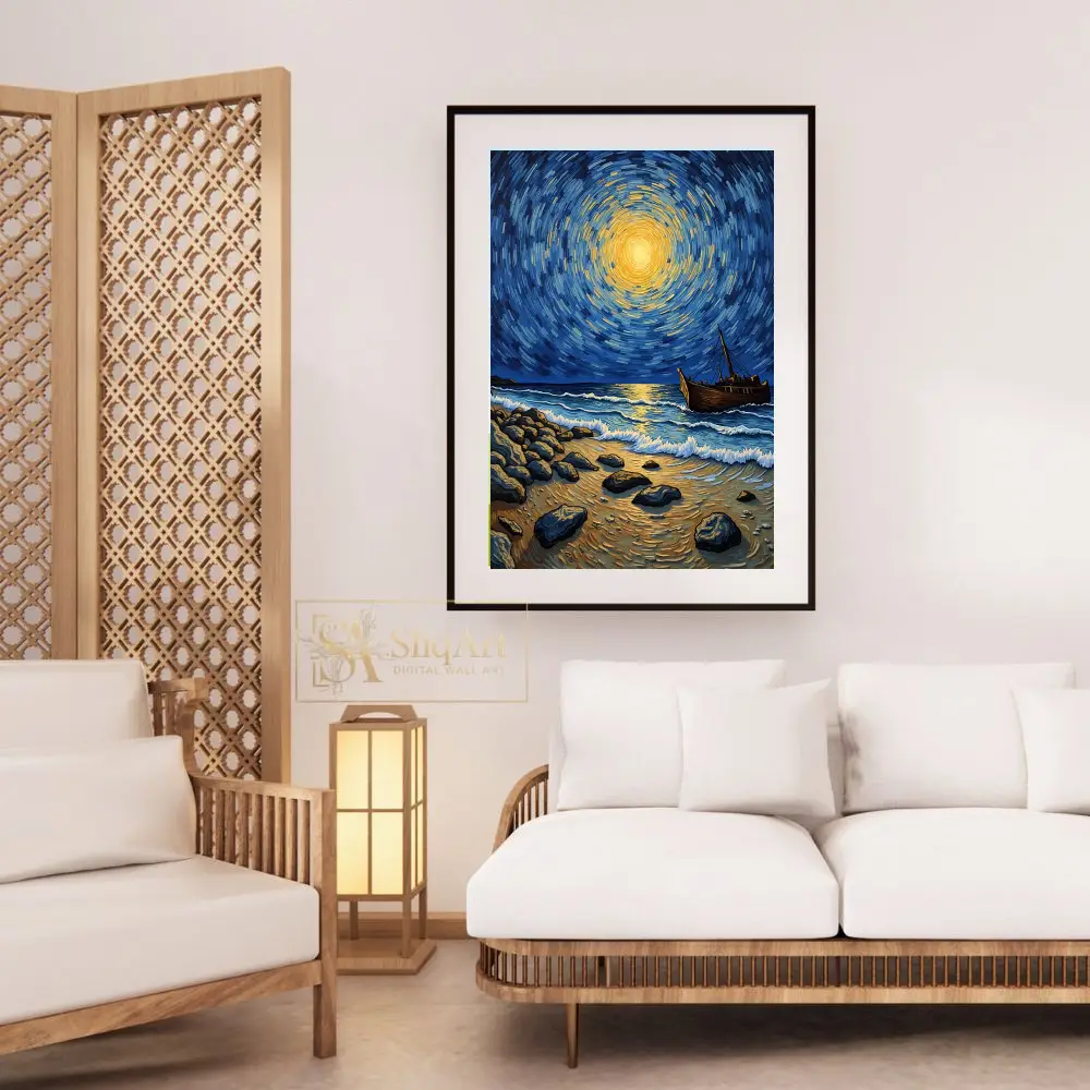 Heavily influenced by post-impressionist masters, the artwork utilizes bold, rhythmic brushstrokes to create a sense of cosmic energy radiating from a central golden celestial body. The deep indigo tones of the sky contrast beautifully with the warm ambers and yellows, creating a dynamic yet peaceful atmosphere that draws the viewer in. This artwork perfectly captures the meeting point between the earthly shore and the infinite heavens.